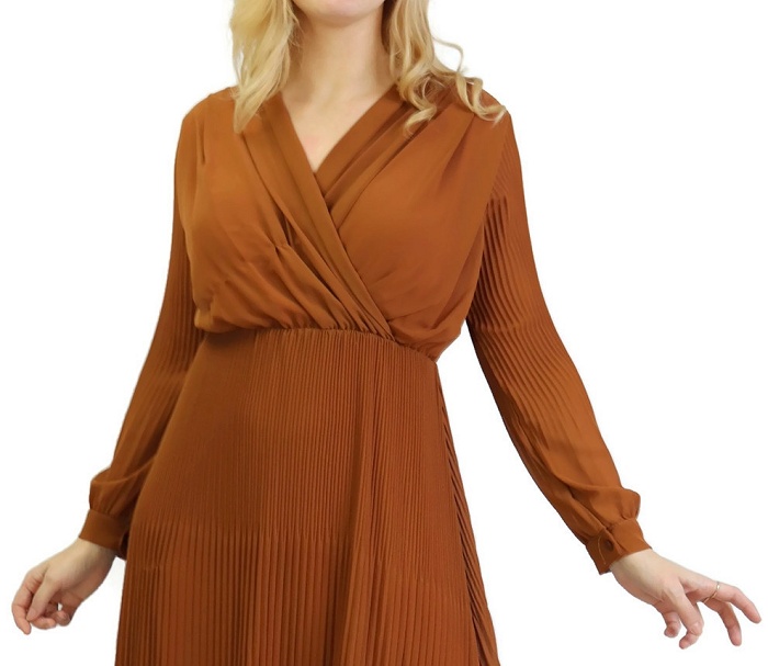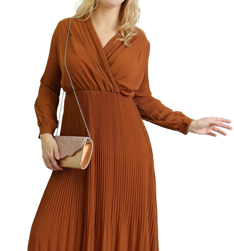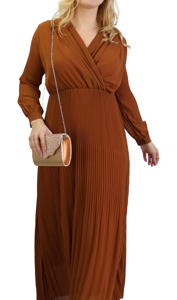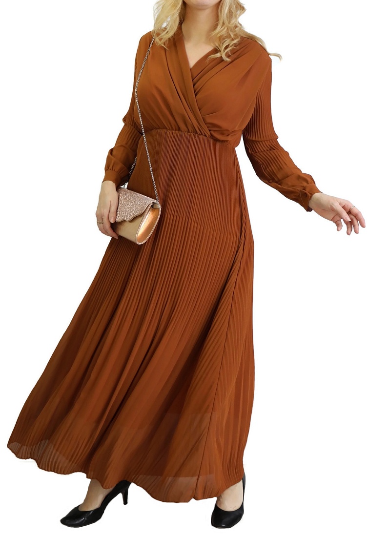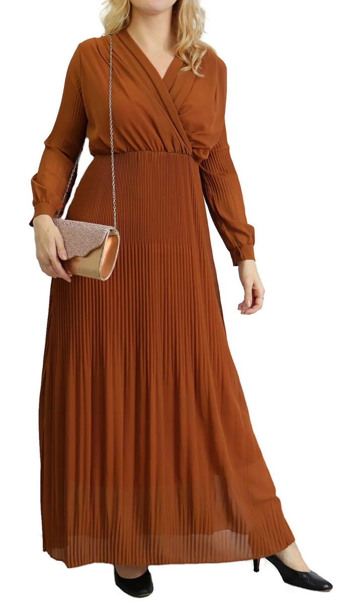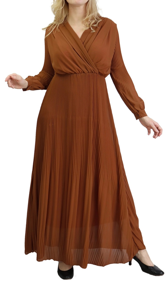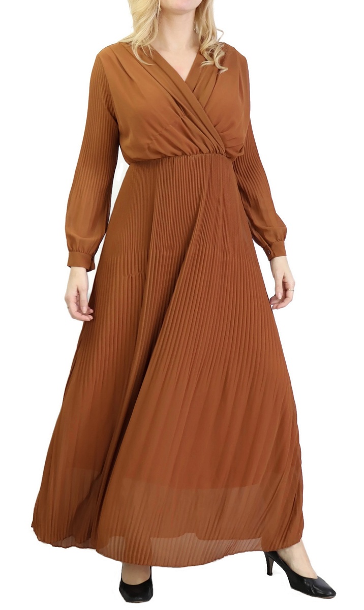 Cette longue robe plissée jaune ne laissera rien transparaître de vos formes grâce à sa doublure. En cache-cœur, elle dispose de longues manches et d'une taille élastique.