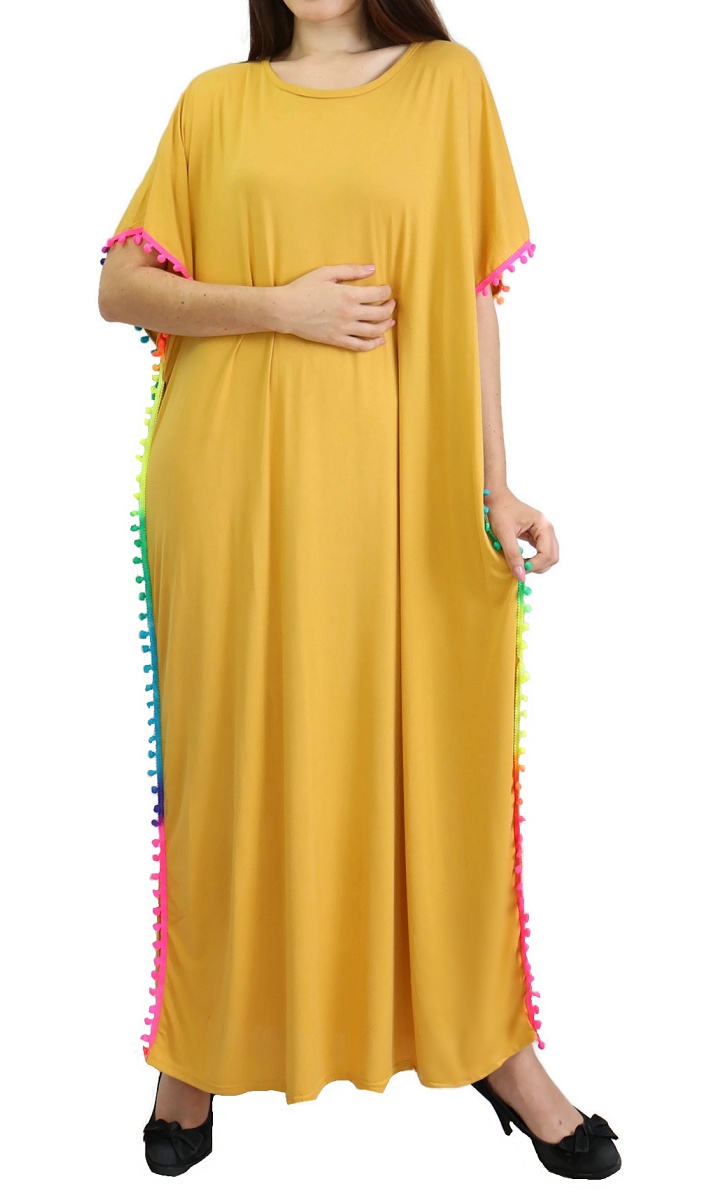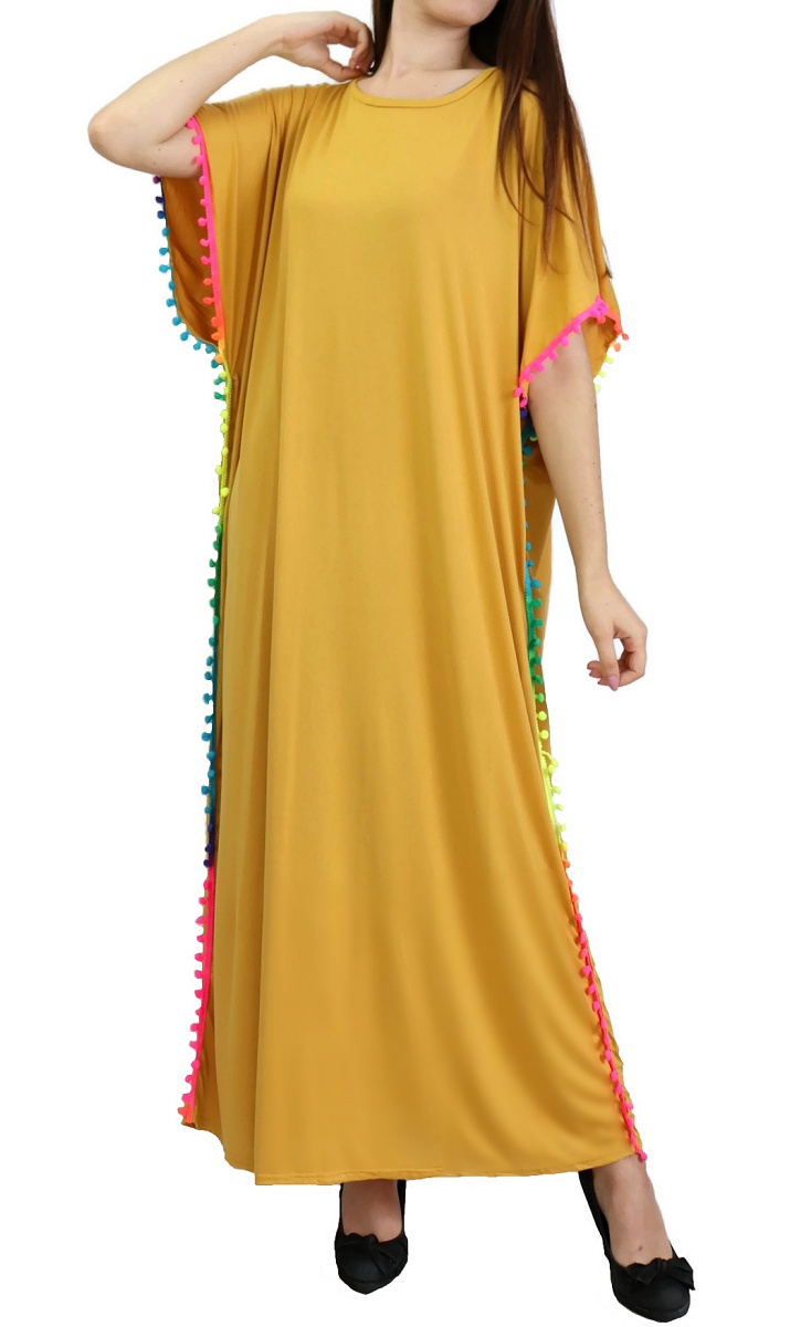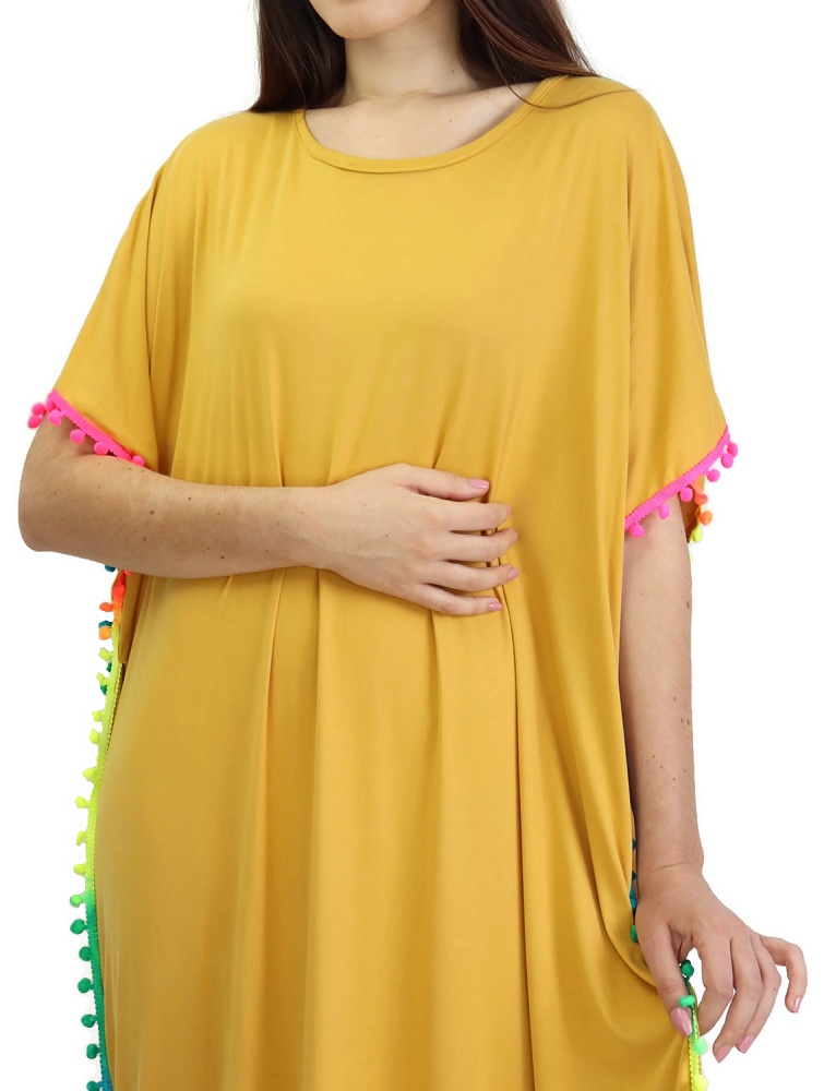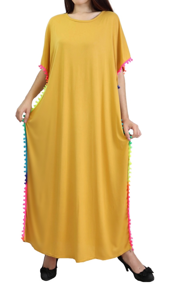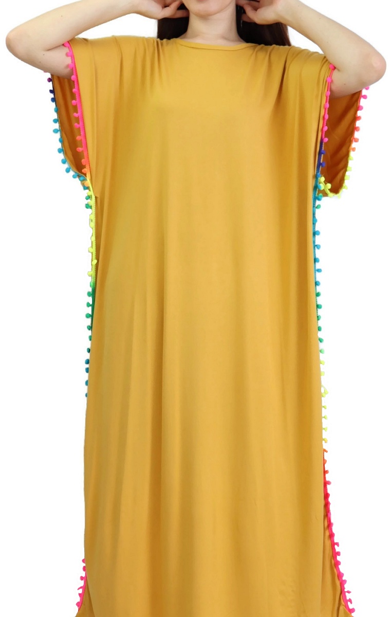 Robe orientale à pompons, fluide et légère, coupe droite, col rond, sans manches, Décorée de petits pompons de divers couleurs sur les côté pour un effet multicolore. La coupe ainsi que sa matière faciliteront une décontraction évidente.