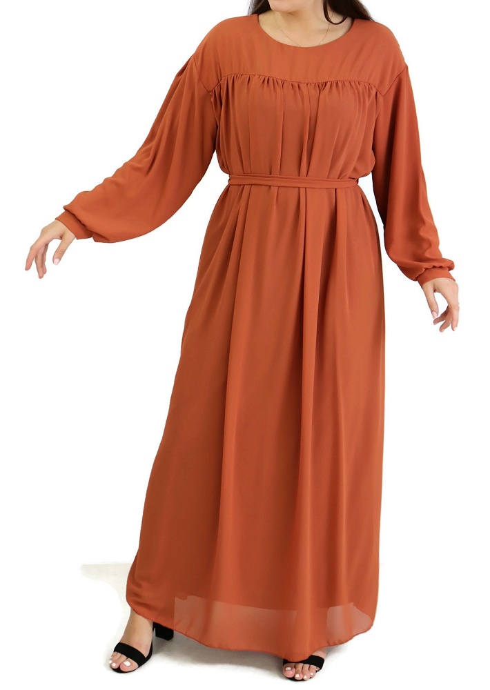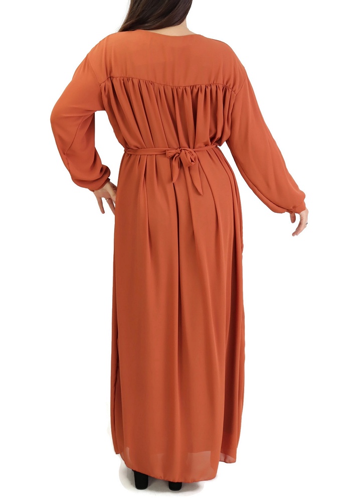 Coup de cœur pour cette robe longue et ample, entièrement doublée. Un vêtement simple qui peut se porter pour différentes occasions : au quotidien, mais aussi en soirée quand il est bien accessoirisé. Le haut est juste au corps, la taille est ample avec possibilité de la cintrer au moyen de la ceinture assortie fournie. Tissu de type crêpe. Ses manches sont longues et son col rond. On peut utiliser la ceinture par derrière ou ne pas la mettre.