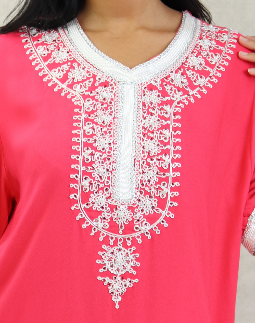La couleur unie de cette robe est des plus flatteuses associée aux reflets lumineux des ornements en feront une pièce maîtresse de votre style.