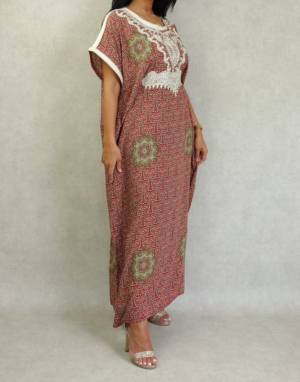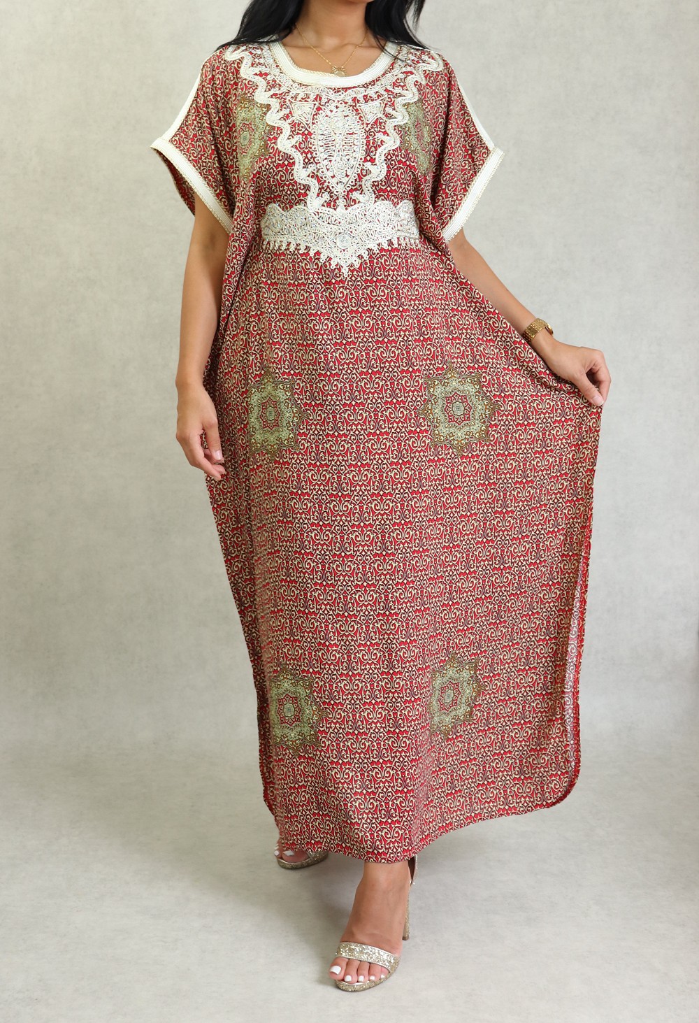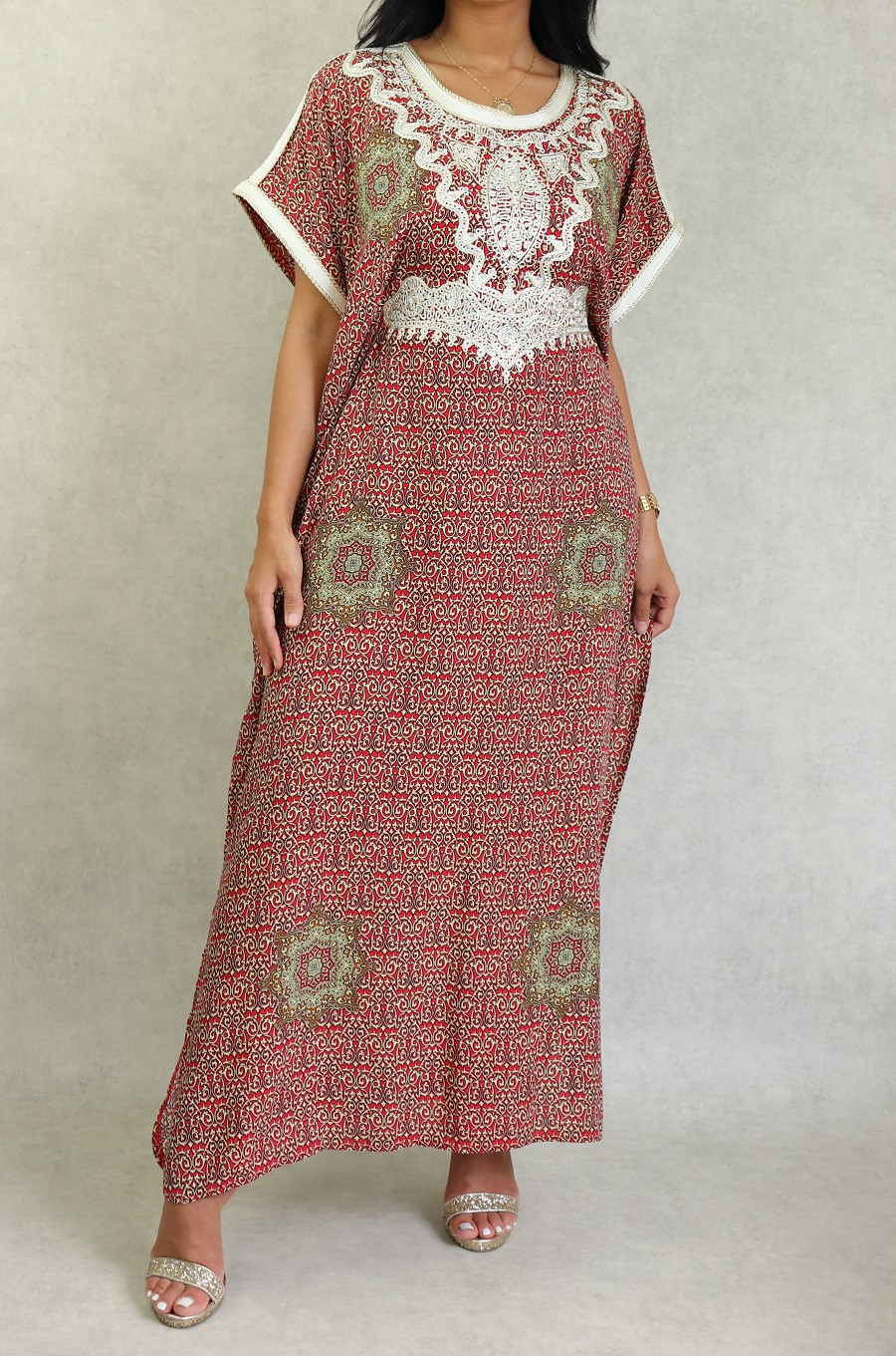 Cette robe longue est brodée de motifs orientaux sur le col et la poitrine.