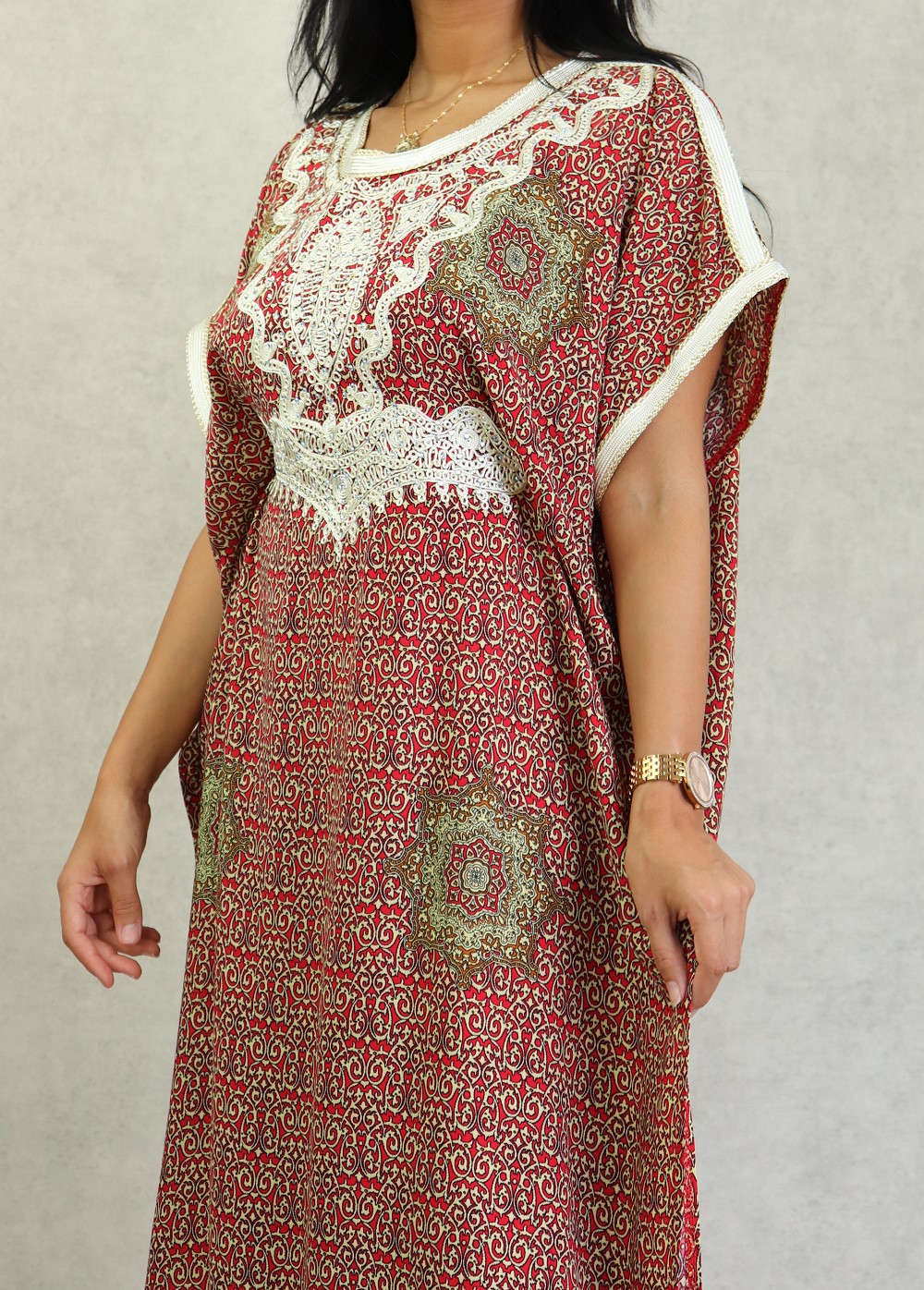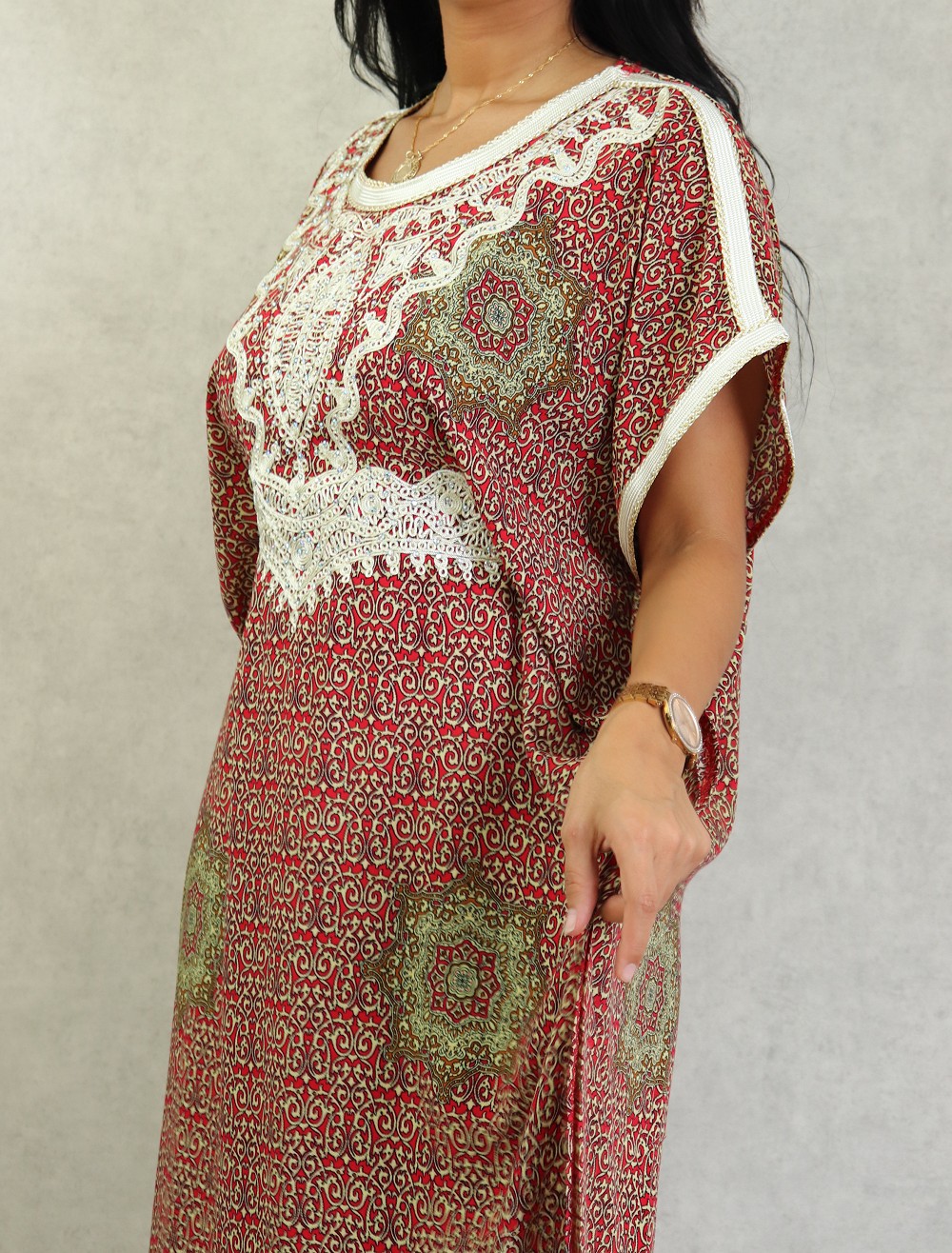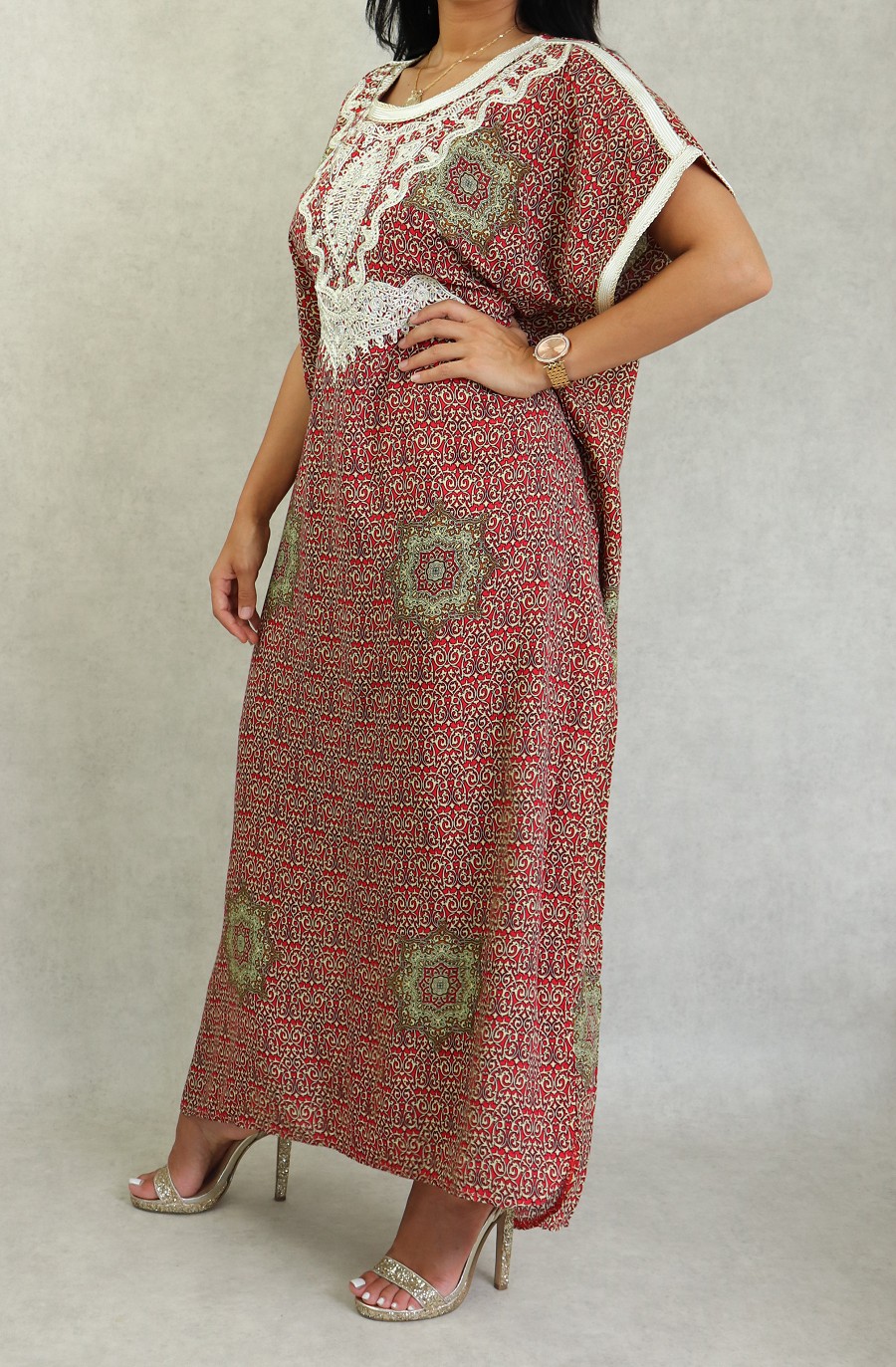 Cette robe longue est brodée de motifs orientaux sur le col et la poitrine.