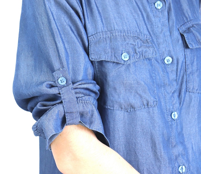 Robe chemise, manches retroussables et finition boutons, 2 poches plaquées fermeture boutons, coupe droite, tissu doux et fluide.