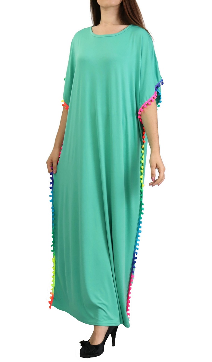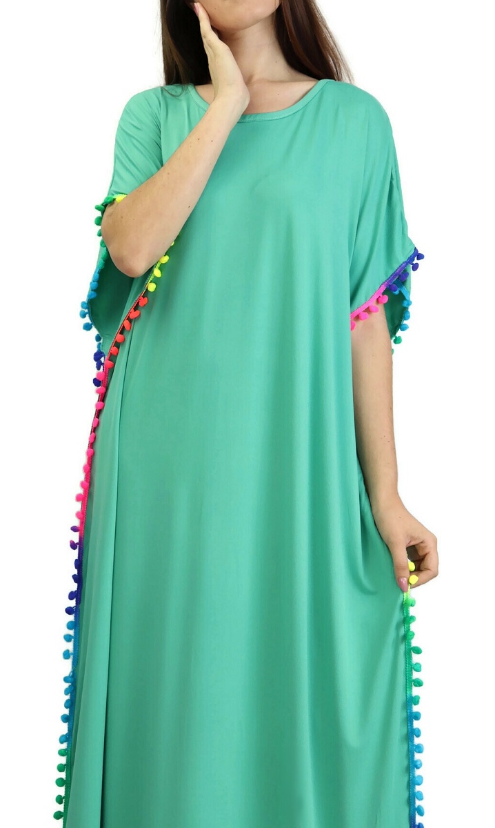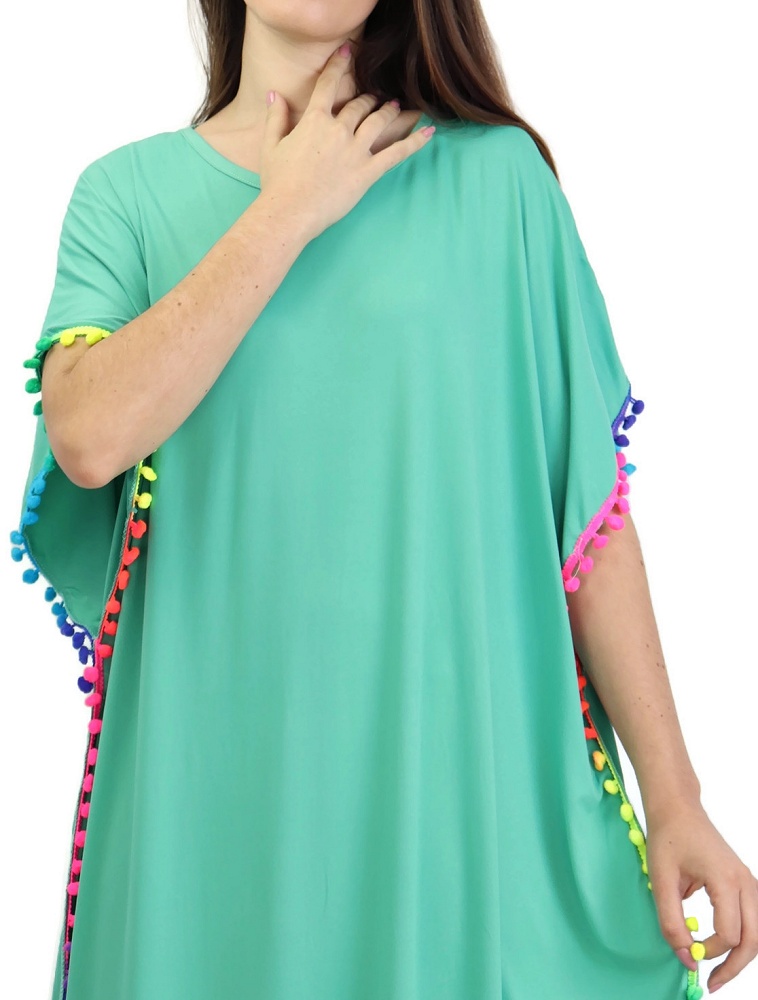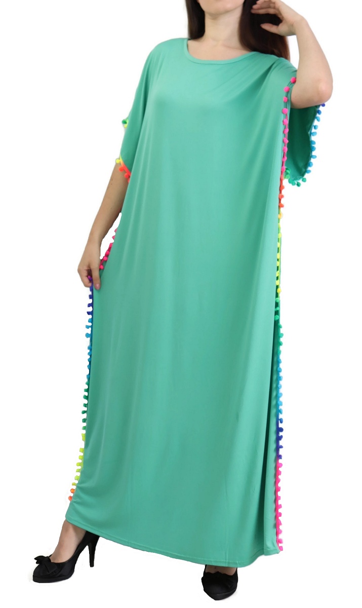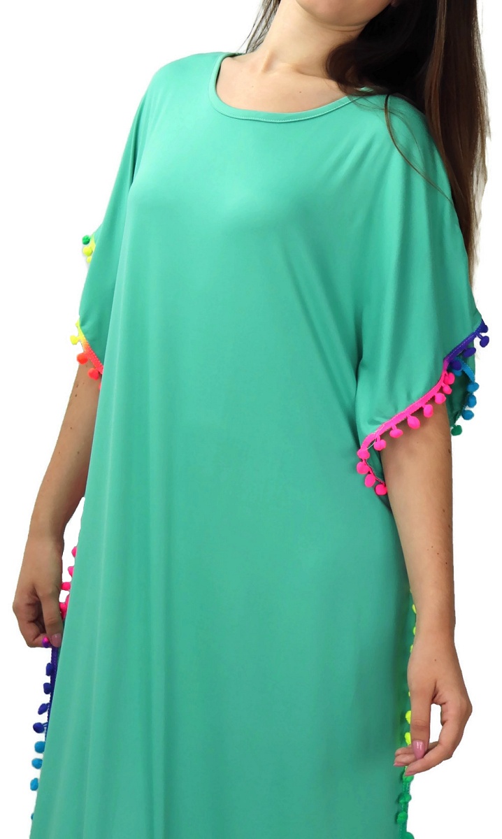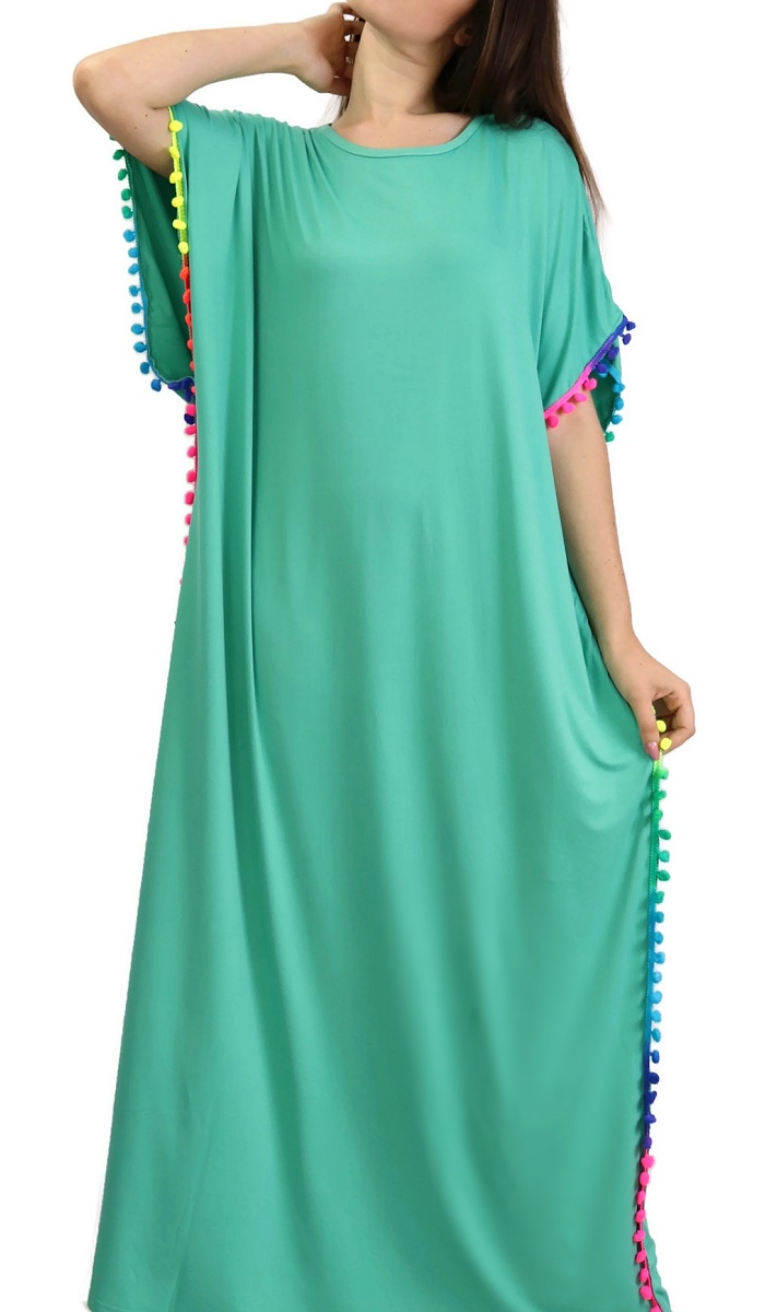 Robe orientale à pompons, fluide et légère, coupe droite, col rond, sans manches, Décorée de petits pompons de divers couleurs sur les côté pour un effet multicolore. La coupe ainsi que sa matière faciliteront une décontraction évidente.