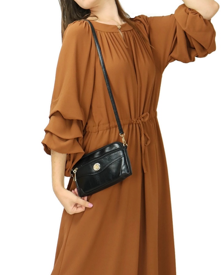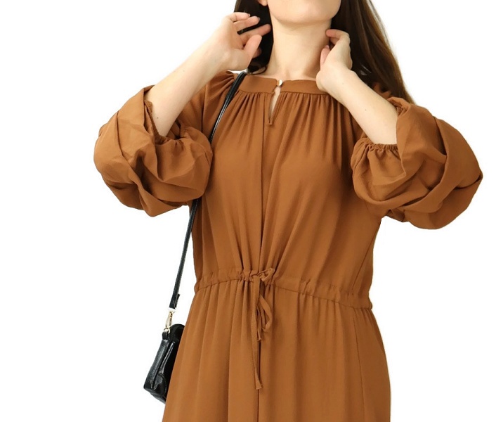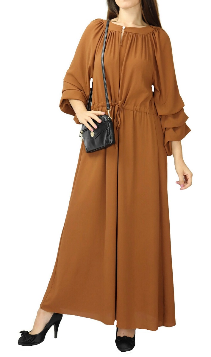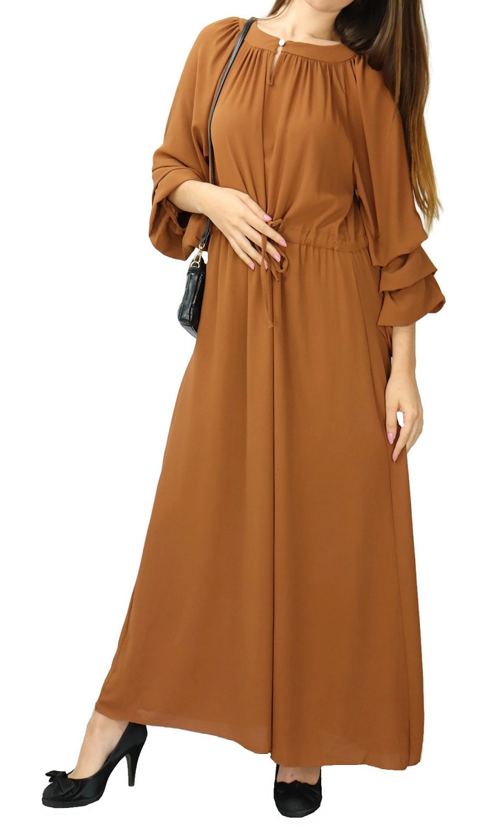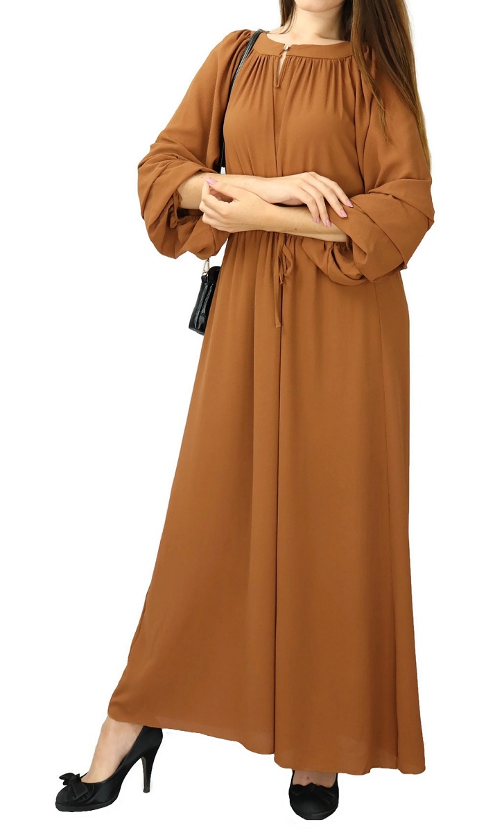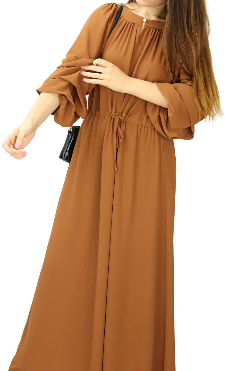 On aime la longueur et les manches bouffantes de cette robe qui vous apporte beaucoup d'allure en toute simplicité. Col rond, lien de serrage au niveau de la taille, doublée sur la partie du bas.