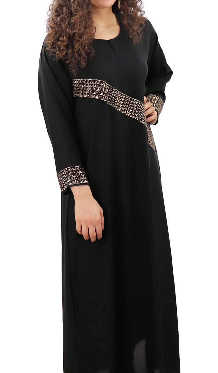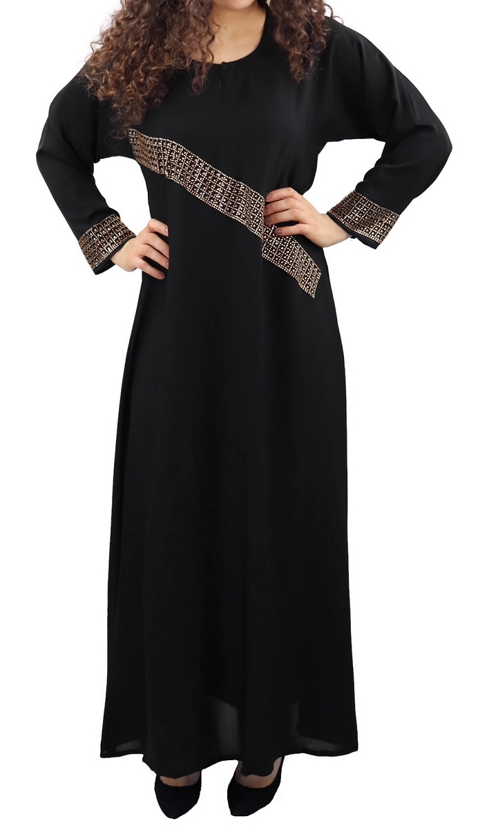 Très jolie abaya en tissu léger et fluide. Le tout décoré de strass brillants dorés sur le haut ainsi que sur les manches et accompagné d'un foulard assorti.