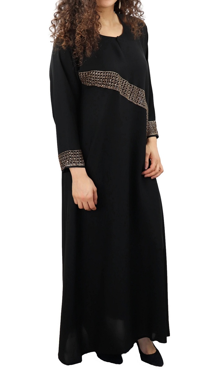 Robe orientale noire fabriquee aux Emirats (Dubai) ornee de paillettes dorees pour femme