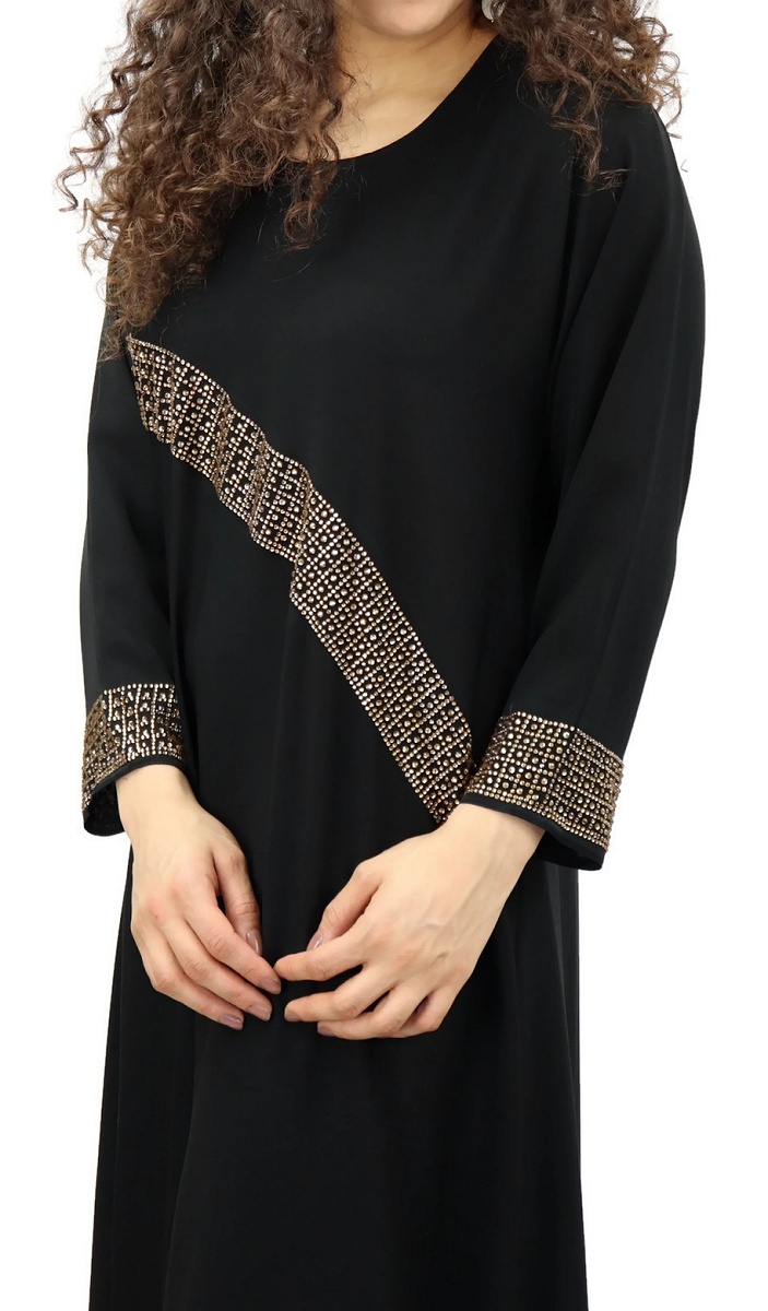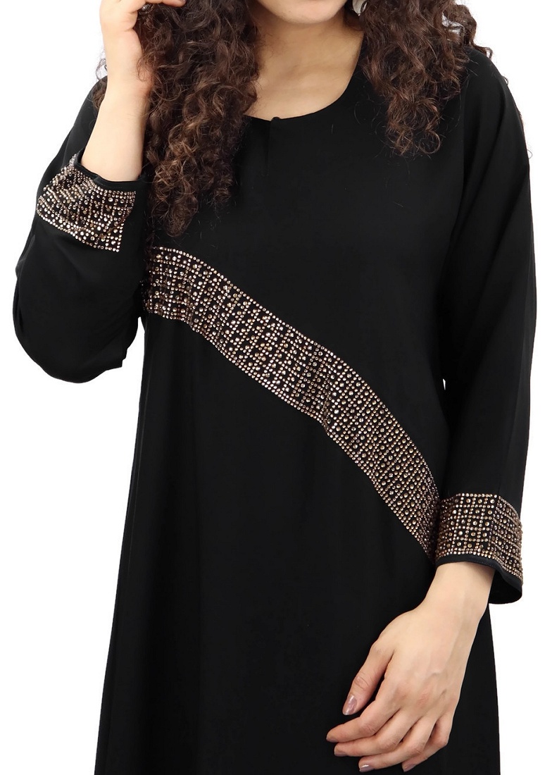 Robe Abaya Dubaï noire de qualité avec strass modèle Burj Khalifa en strass et diamant noirs et blancs - REF. 38144 (45.00 €)