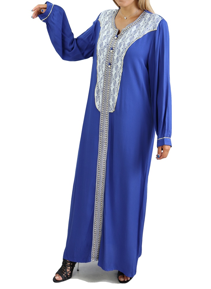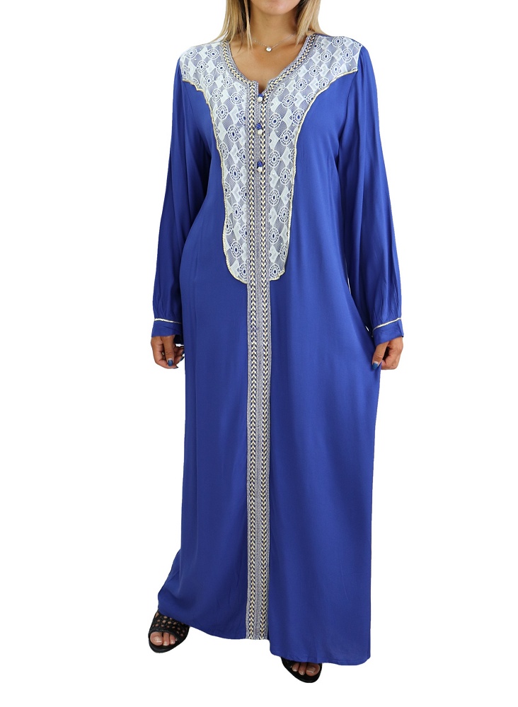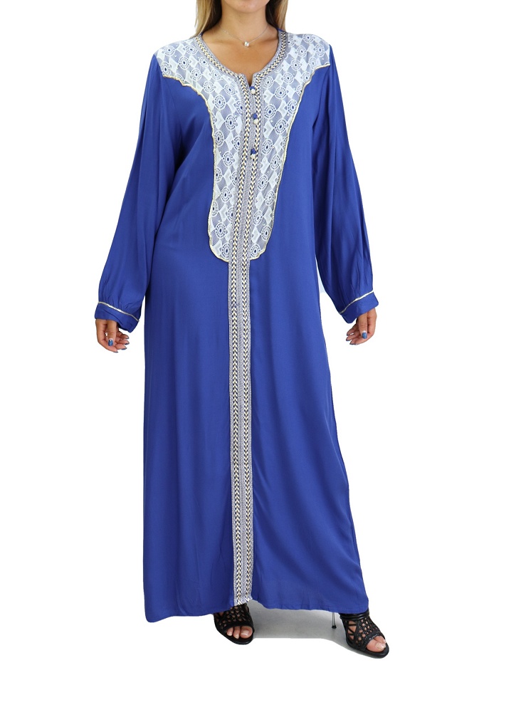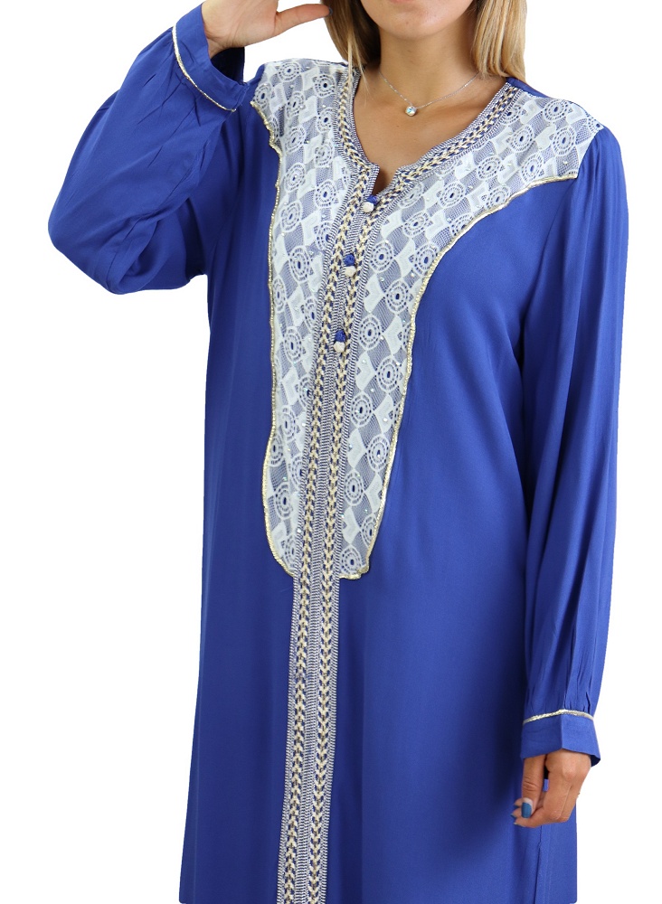 A dentelles sur la partie du haut, elle se finit par une belle broderie artisanale et un fil doré sur les poignets