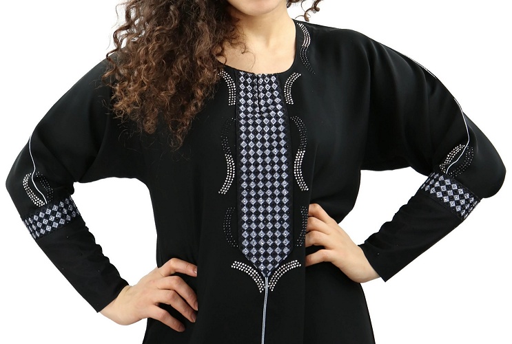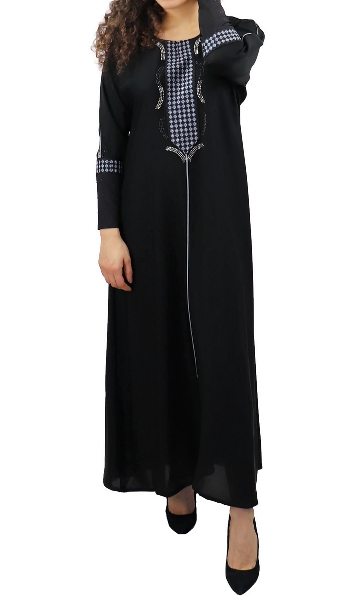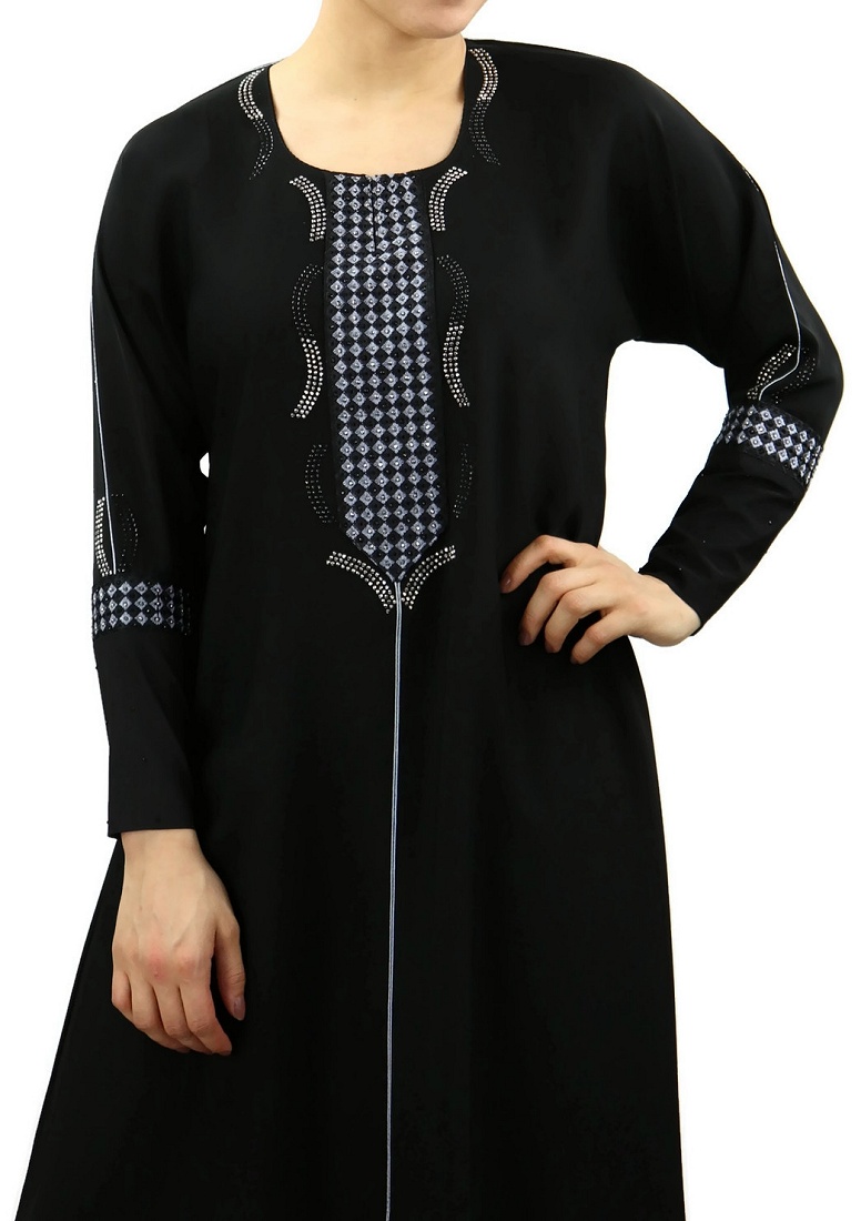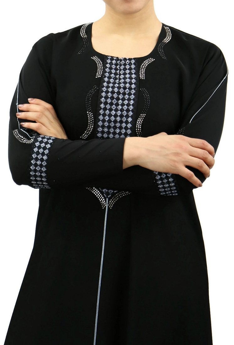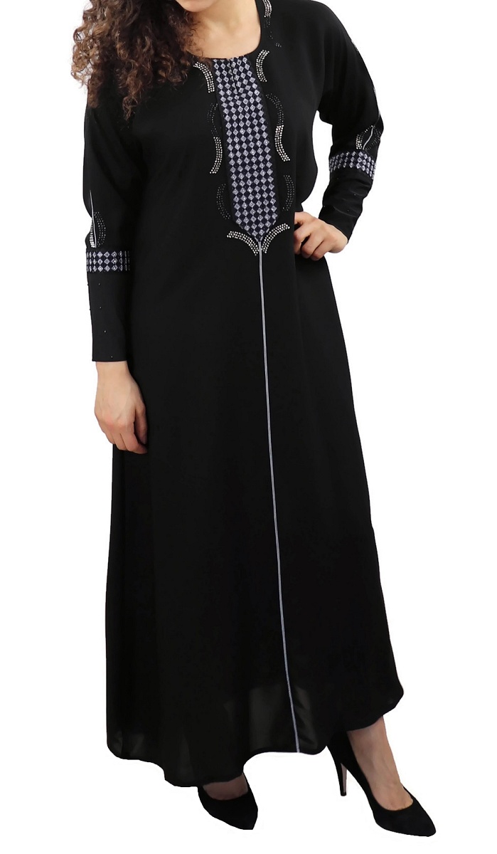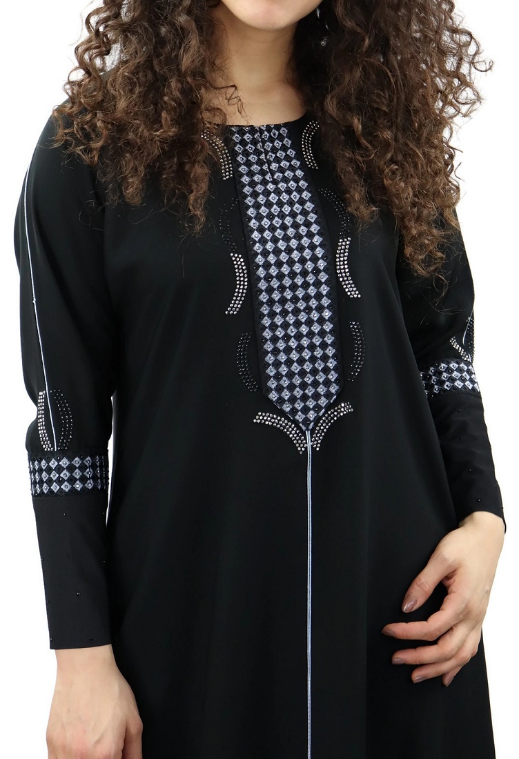 Jolie Abaya noire chic agrémentée avec broderies strass argentés et noir sur le devant ainsi que sur toute la longueur des manches. (coupe évasée)