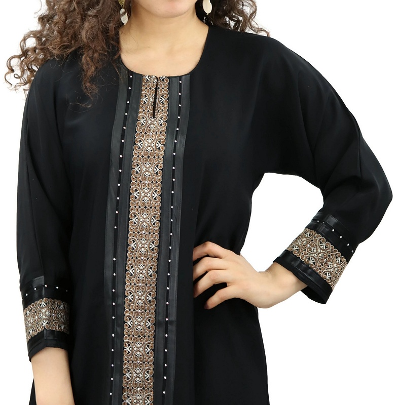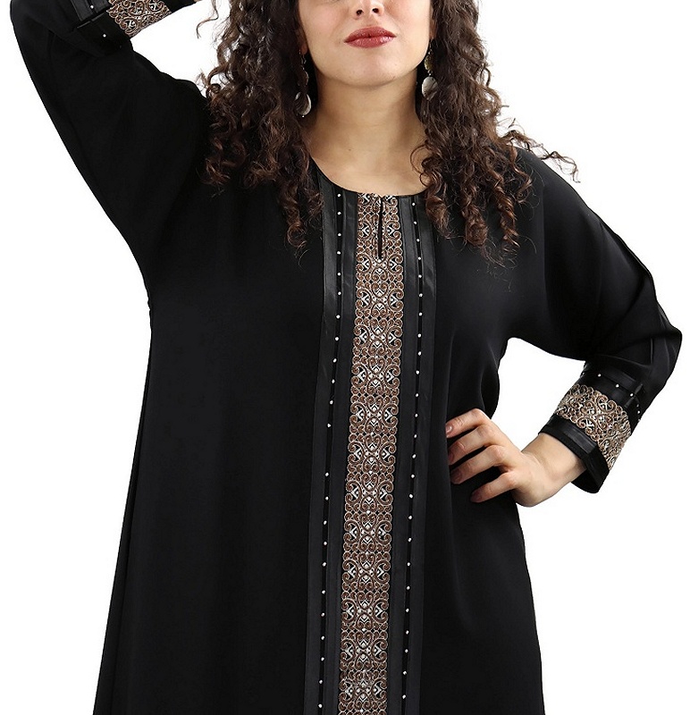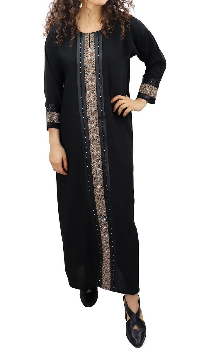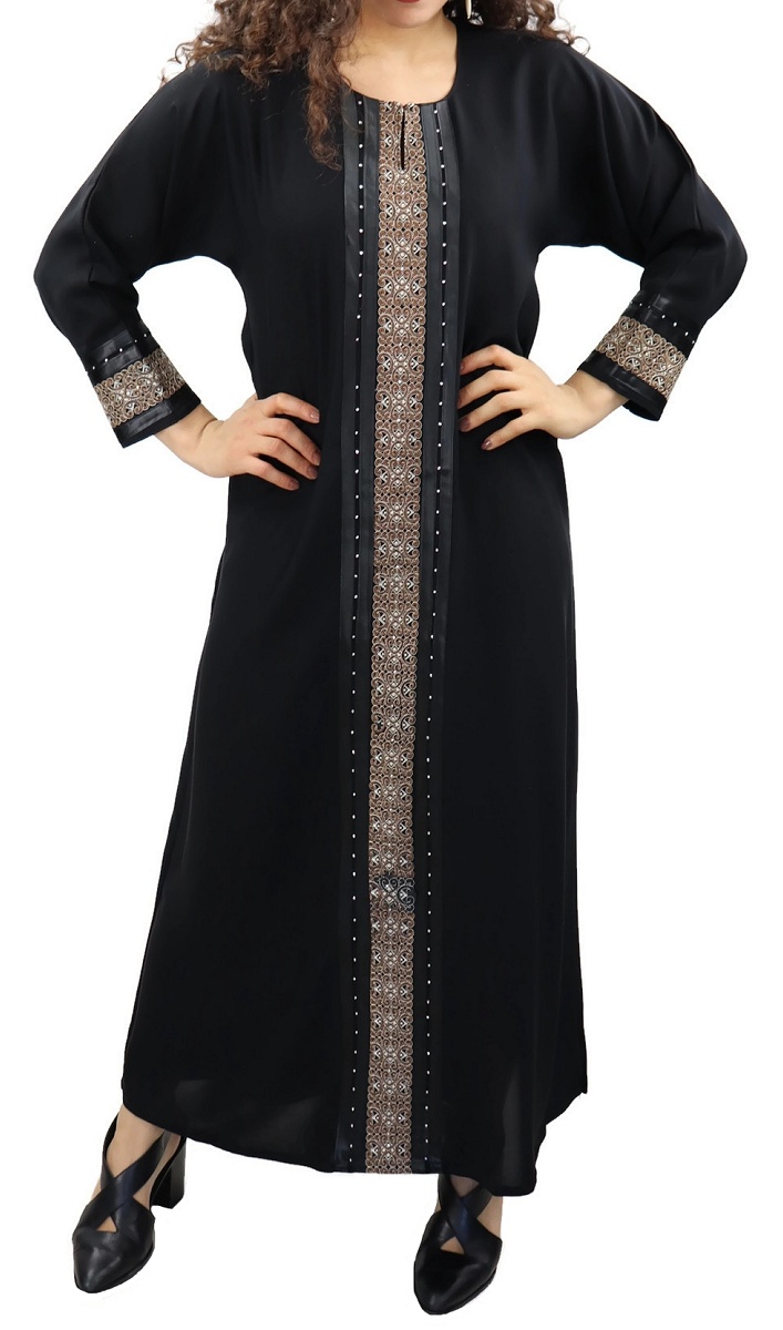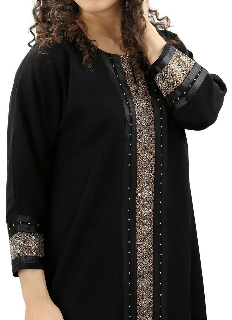 Abaya noire agrémentée de broderies marron et beige pailletées et de strass argentés sur toute la longueur ainsi que sur les extrémités des manches. Echarpe noire assortie.