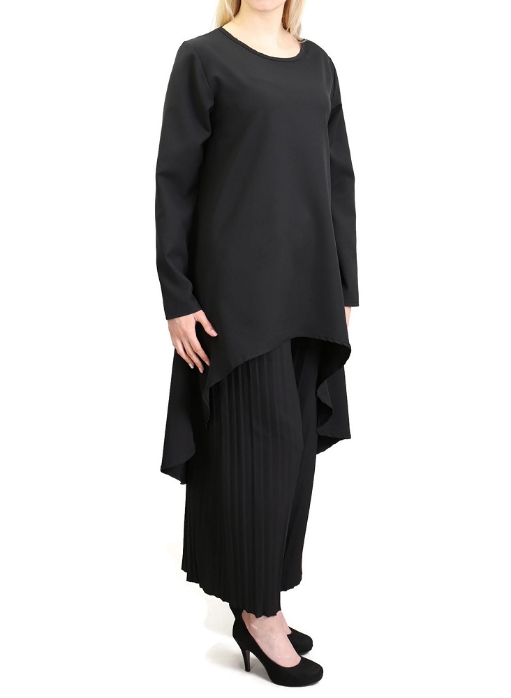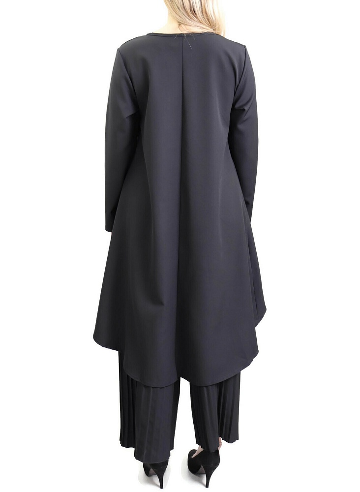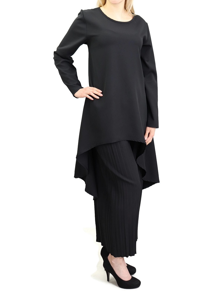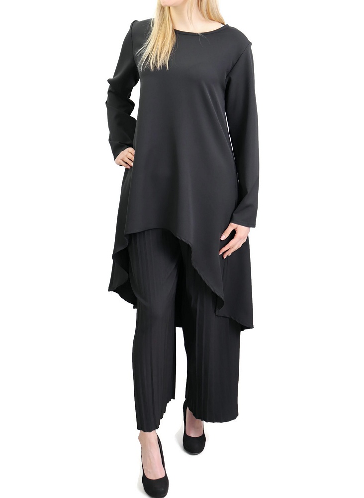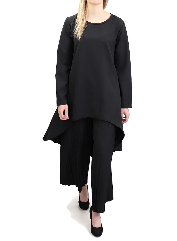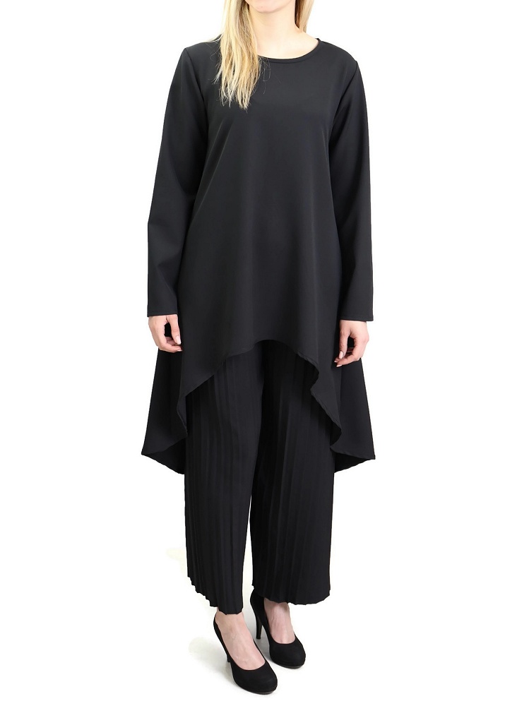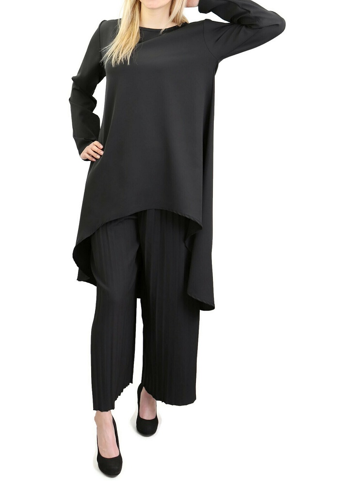 Ensemble élégant constitué d'une tunique évasée et d'un pantalon palazzo plissé. Vous pourrez porter cet ensemble très confortable toute l'année. Tissu de type crêpe léger et fluide. Cet ensemble convient à toutes les tailles de 1m60 à 1m75.