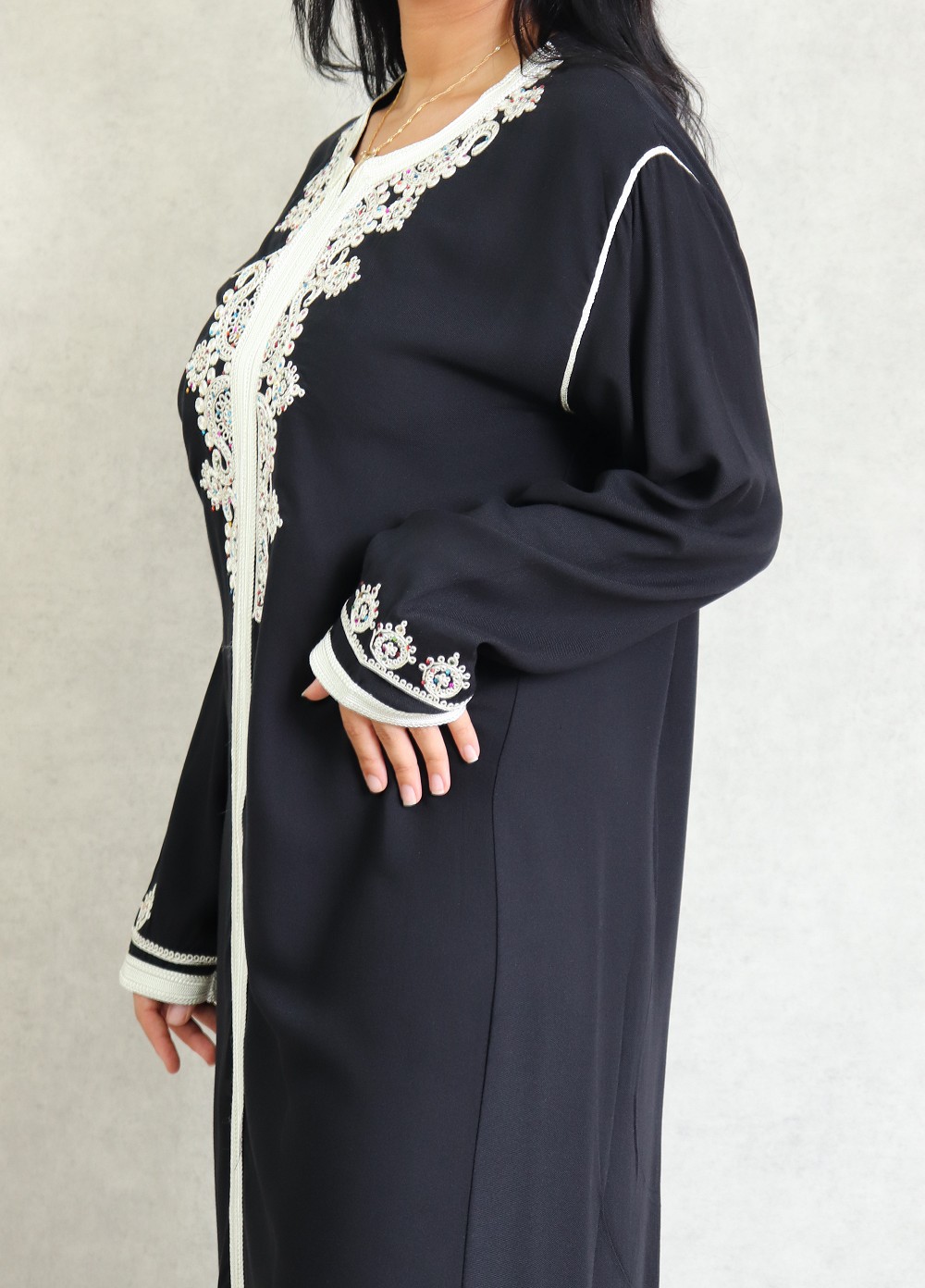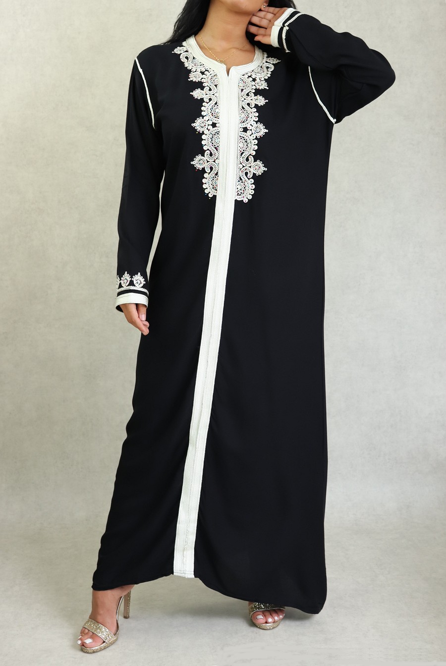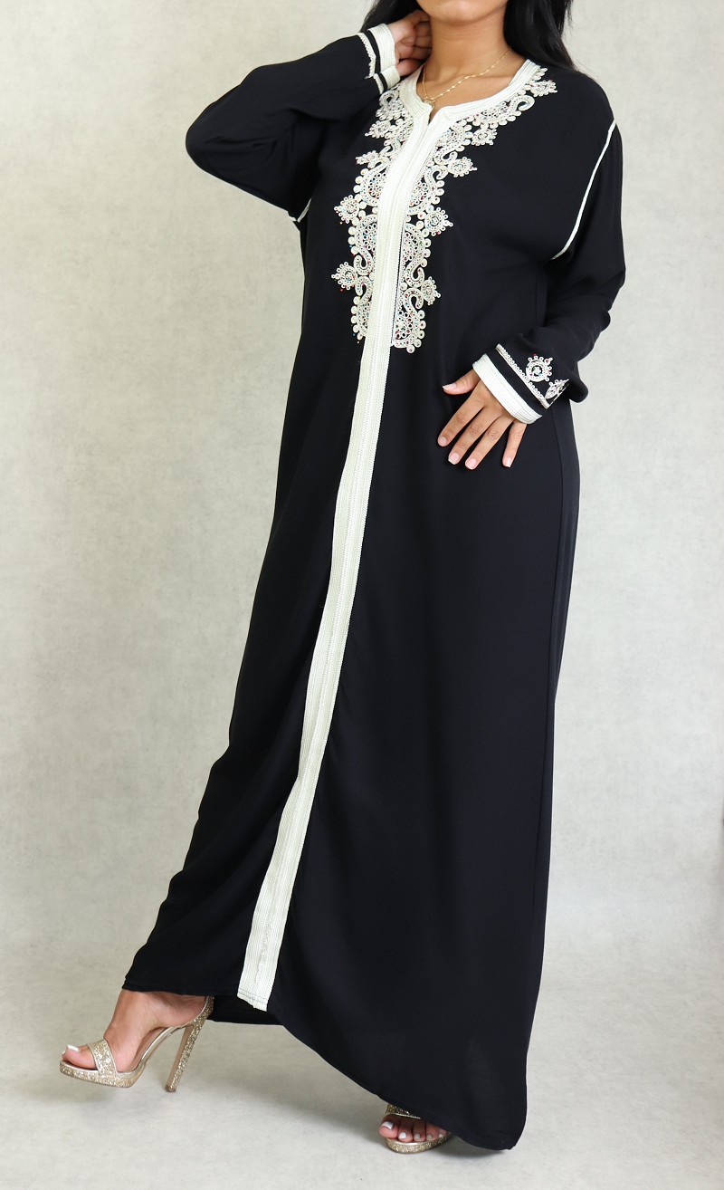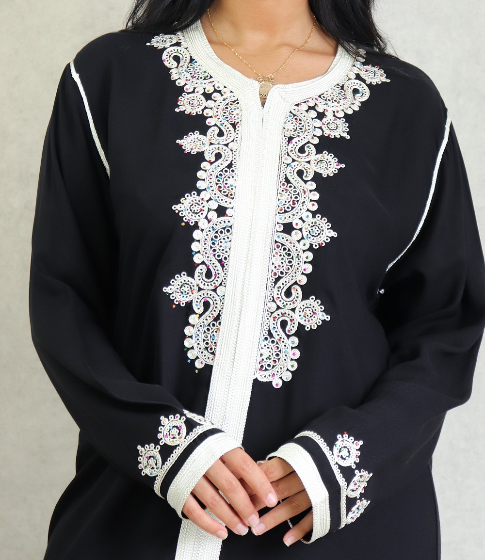 Robe Marocaine longue avec strass multi-couleur et nombreuses broderies sur le buste et toute la longueur ; style caftan. Tissu doux de type coton/soie. Le double avantage de ce modèle est d'être confortable et élégant à la fois.