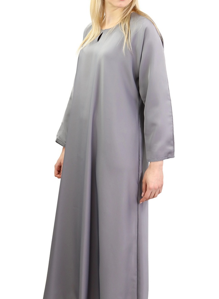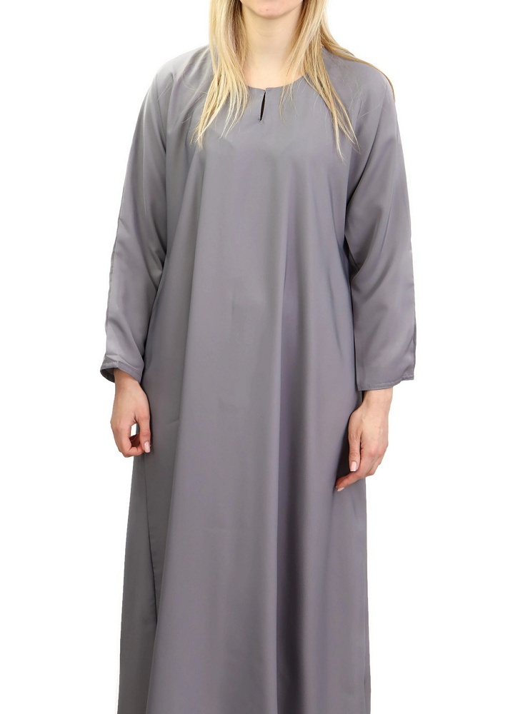 Nous apprécions la simplicité et la sobriété de cette robe évasée qui est livrée avec un châle léger qui peut servir de voile ou d'écharpe pour accessoiriser la robe. C'est un standard porté habituellement par les femmes aux Emirats...