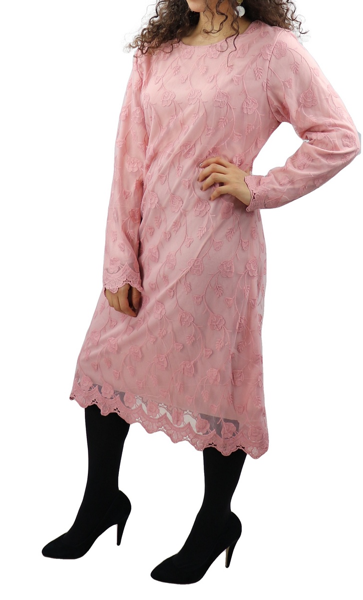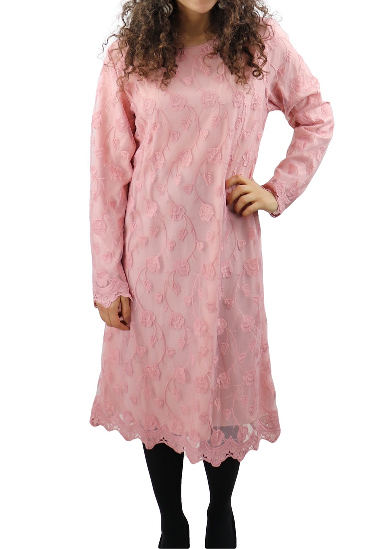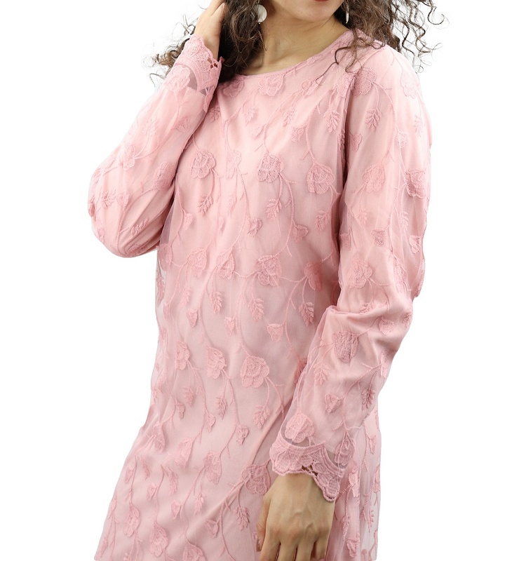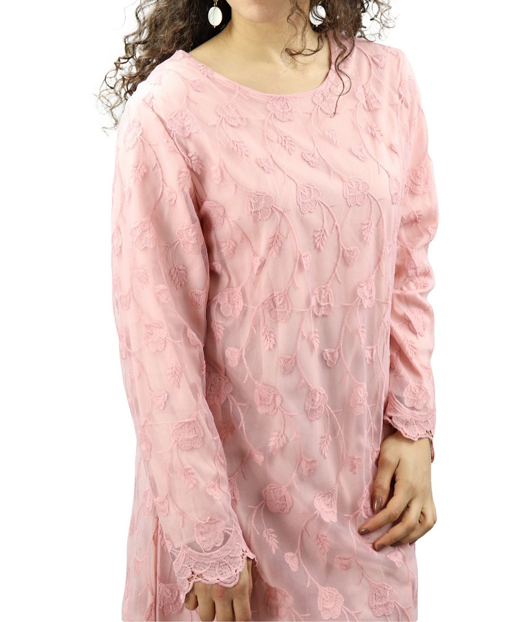 Tunique longue, col arrondi, fermeture bouton à l'arrière, entièrement doublée, coupe droite, finition broderies sur les manches et le bas.