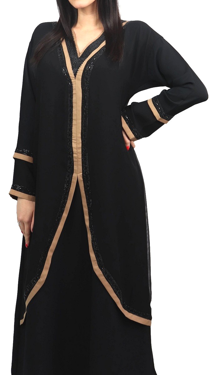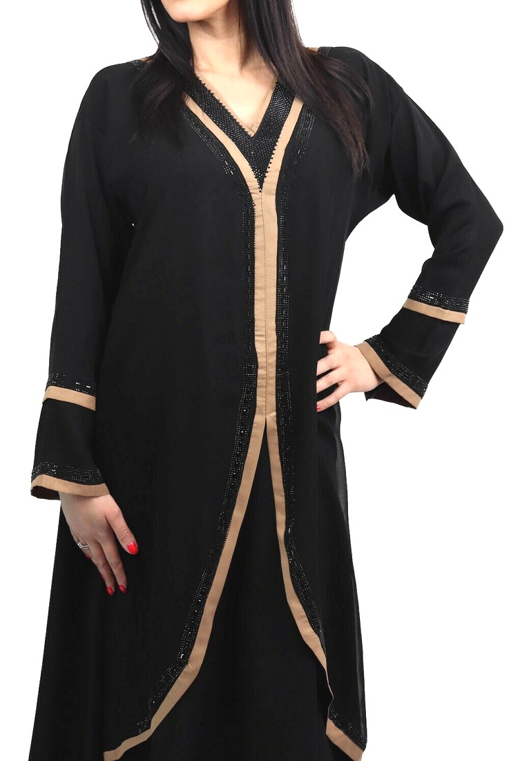 Robe Abaya de Dubai noire avec bandes marrons et strass Vetement & Accessoire