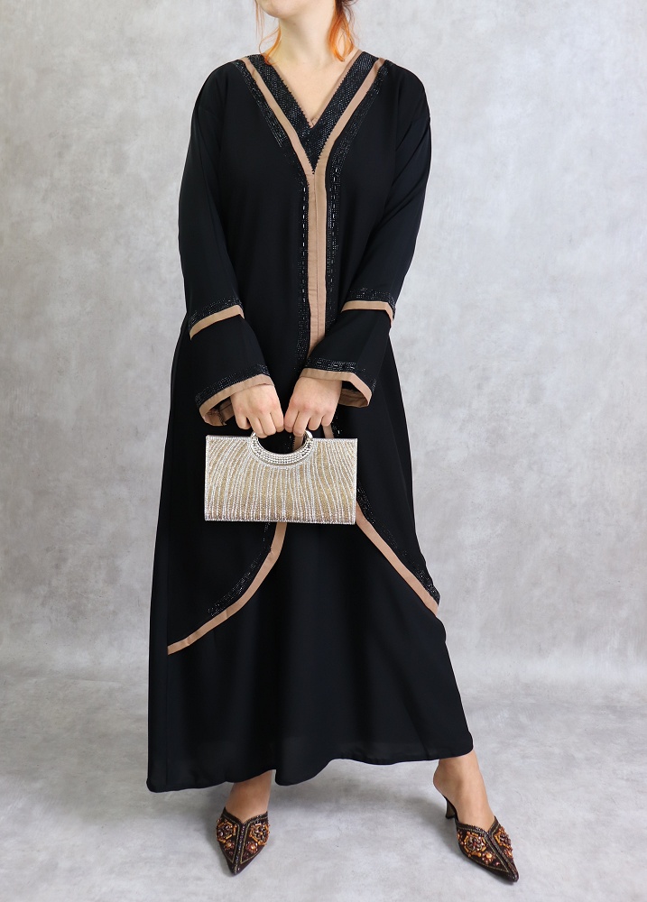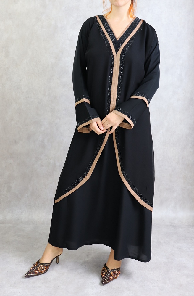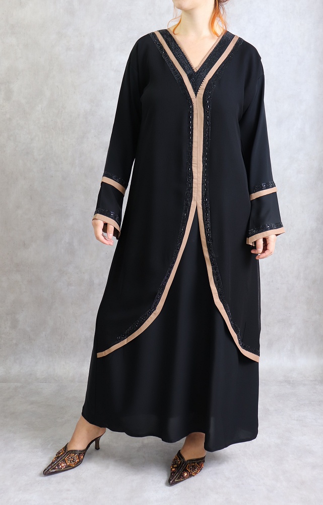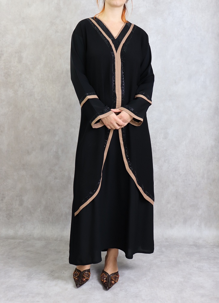 Robe Abaya de Dubai noire avec bandes marrons et strass