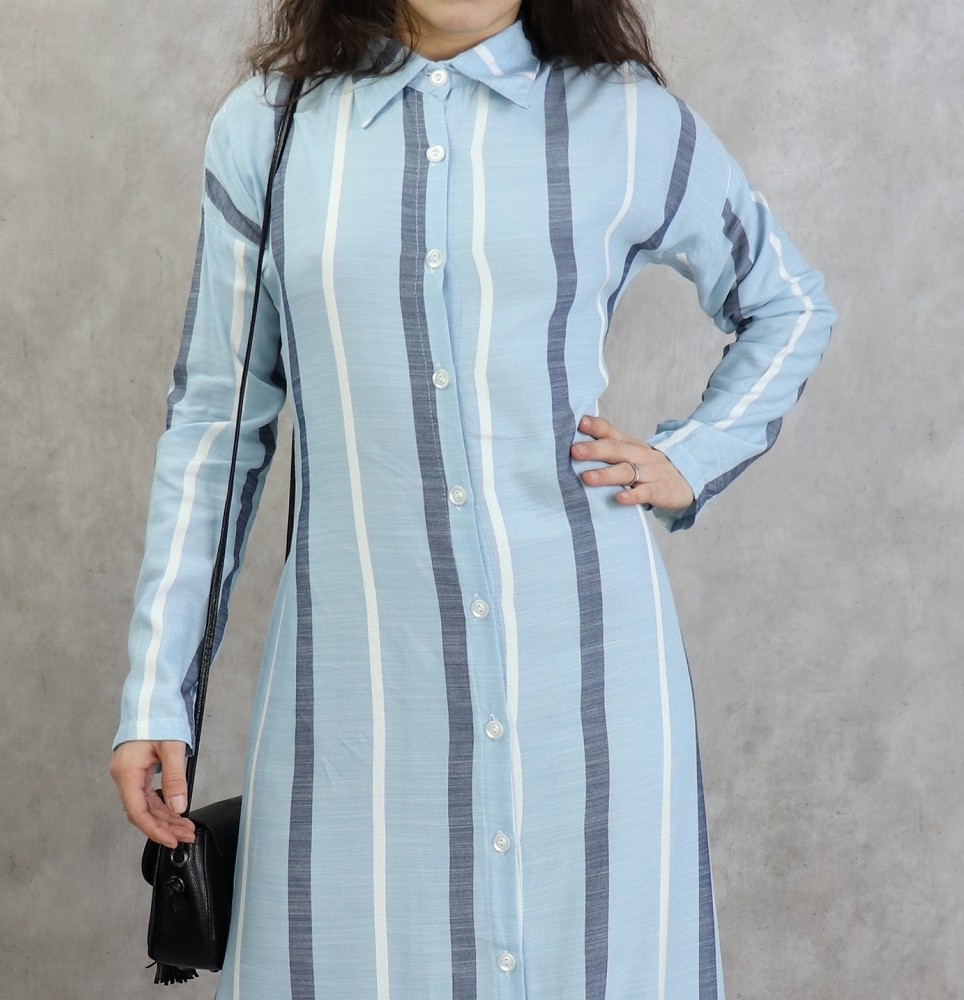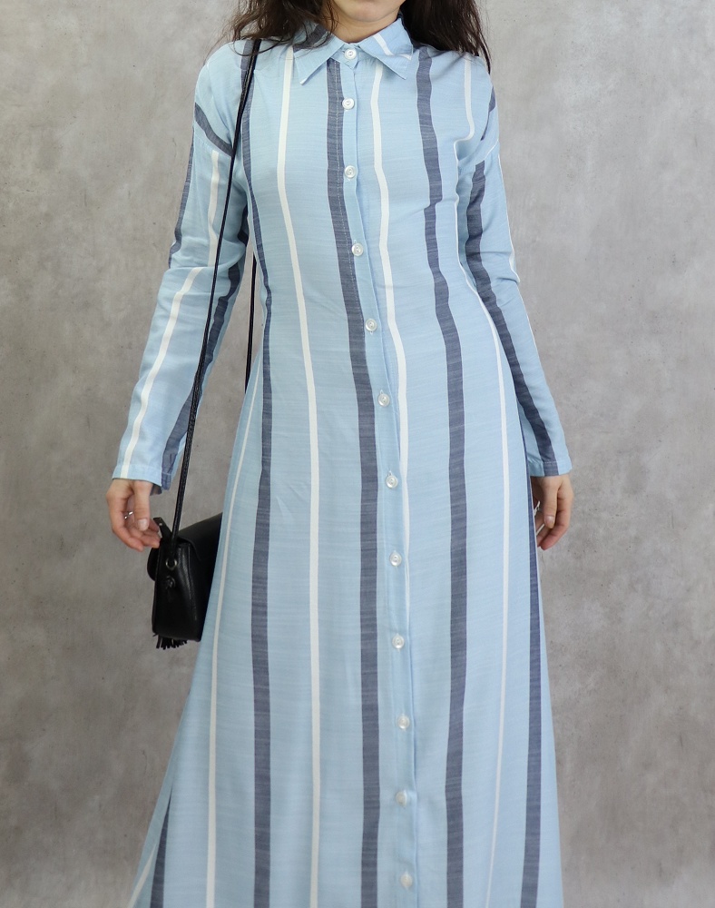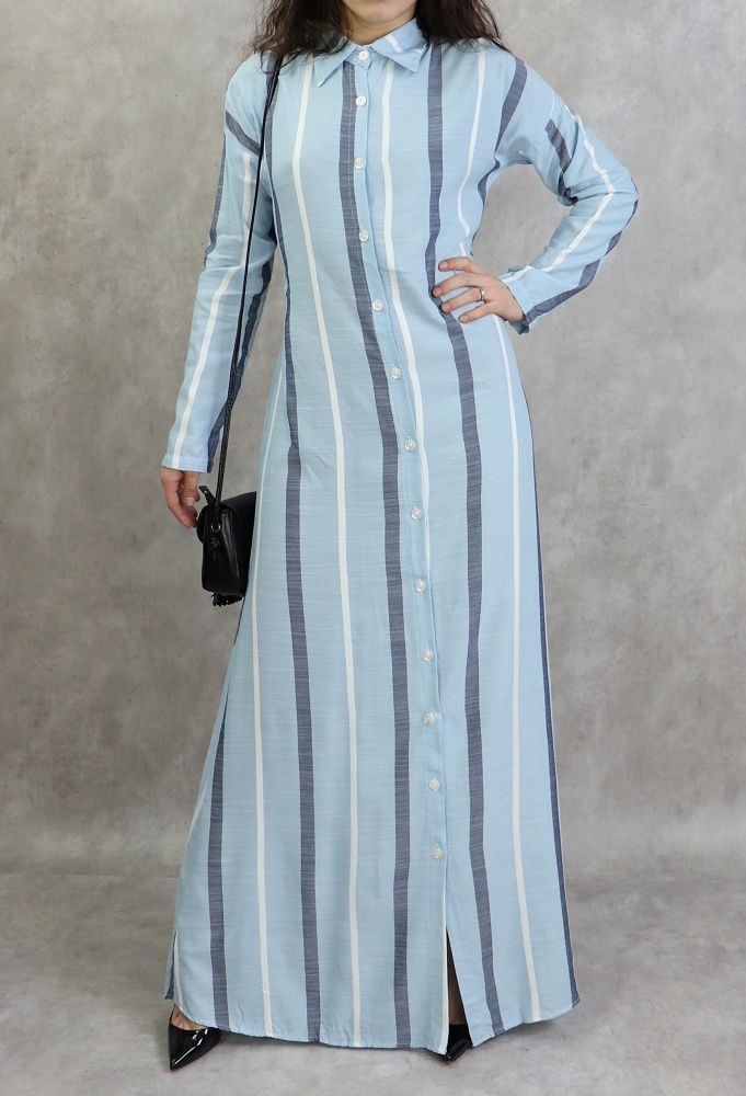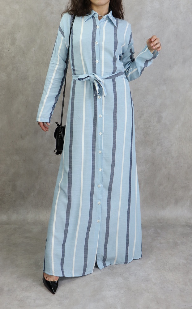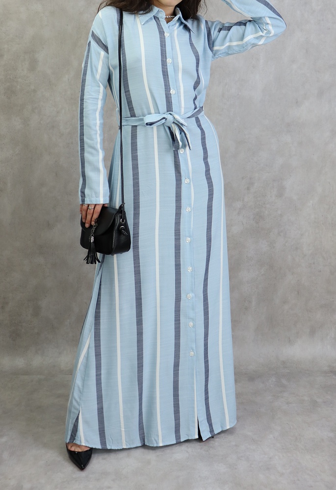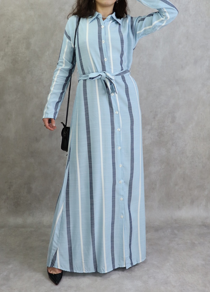 Robe longue, col chemise, ceinture à passants assortie, fermeture boutons, coupe légèrement évasée, tissu doux et léger.
