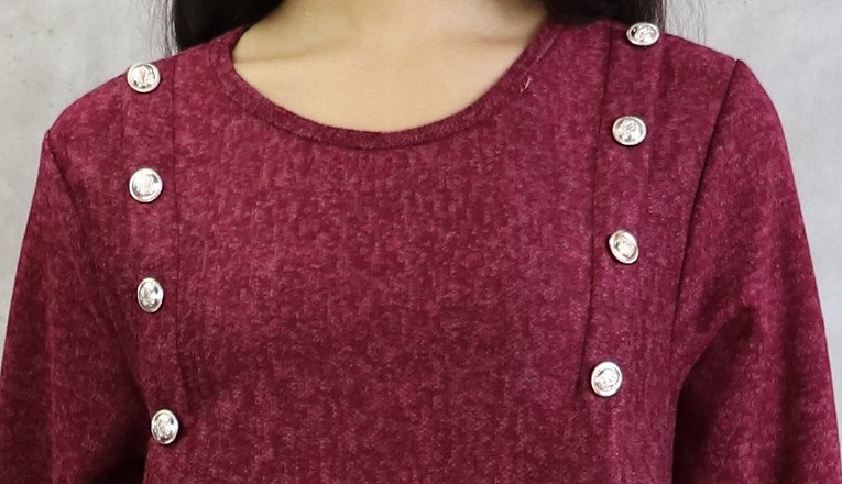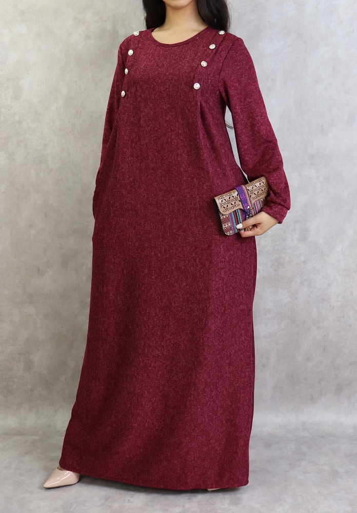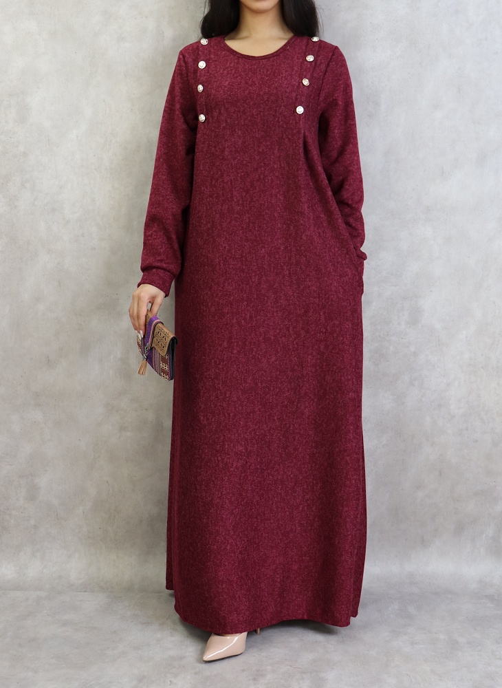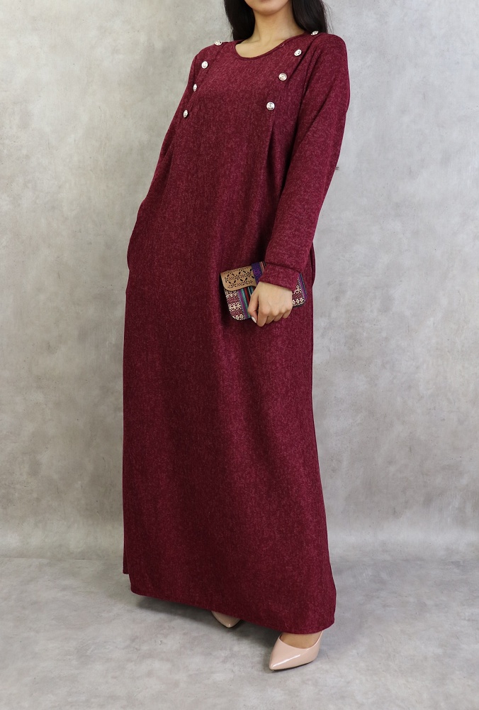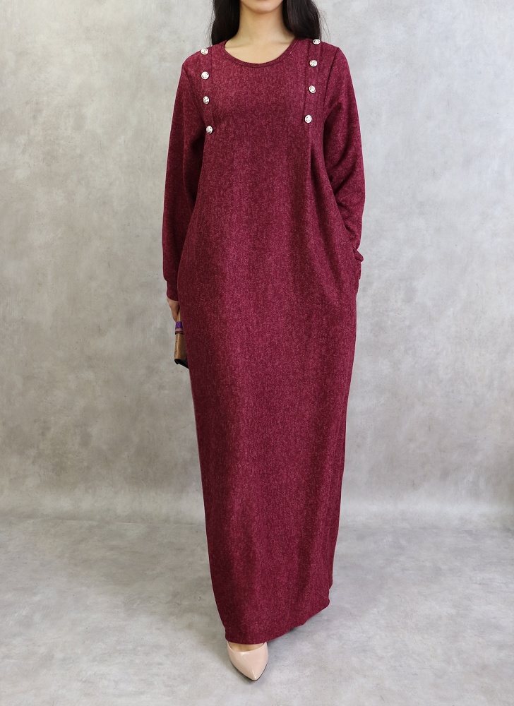Robe longue, col rond, coupe droite, décoration boutons argentés, poches latérales, tissu chiné.