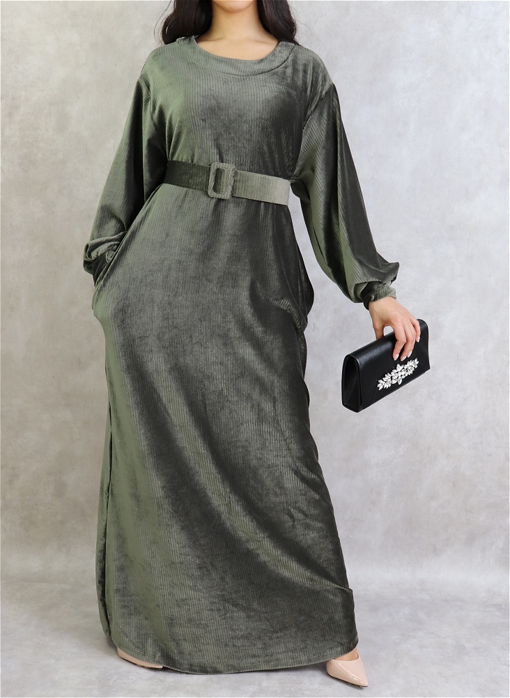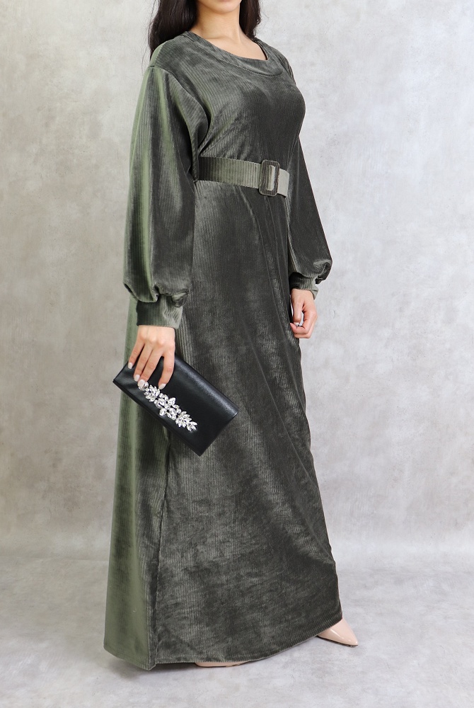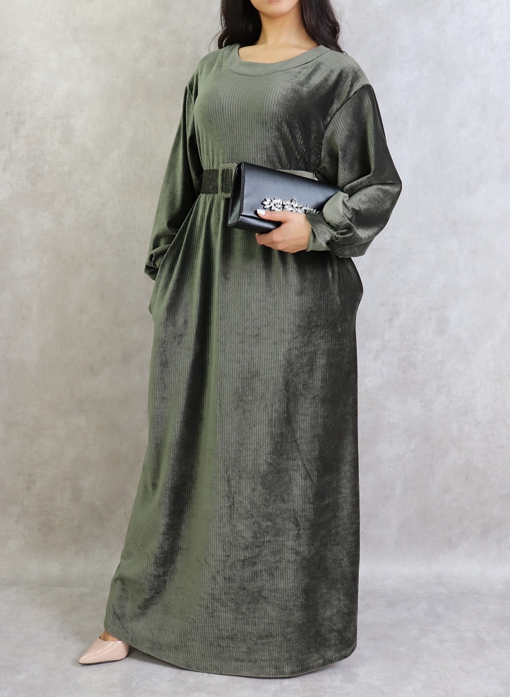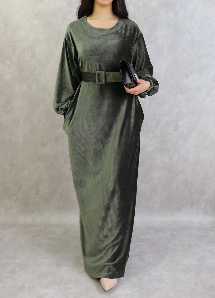 Robe longue, col dégagé, ceinture assortie ajustable, poches latérales, tissu épais et doux, effet velours côtelé, coupe droite.