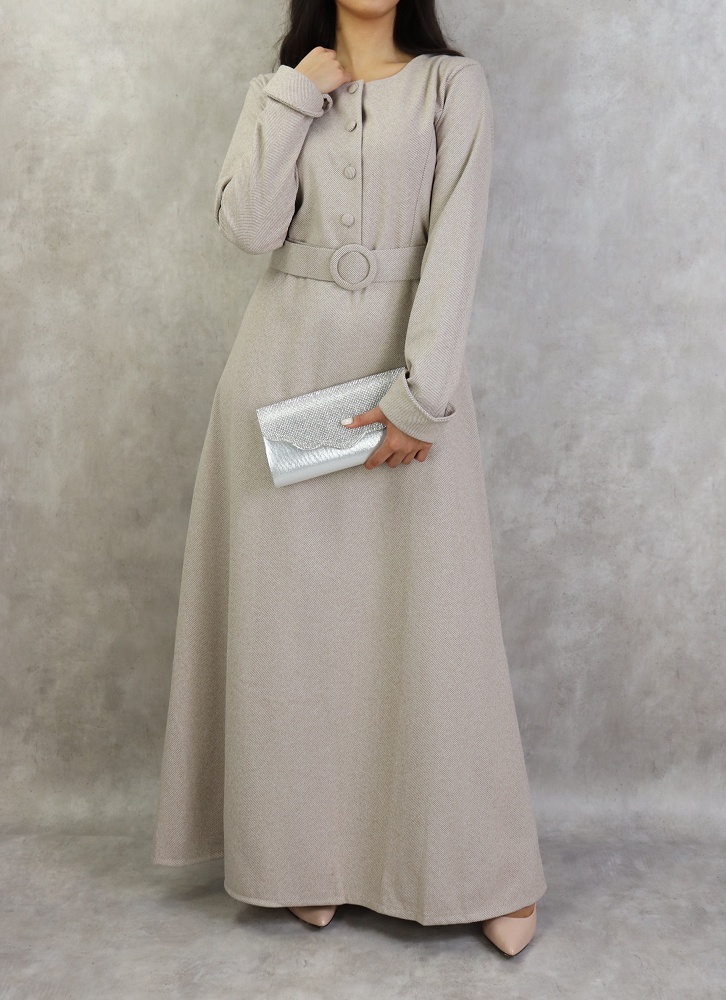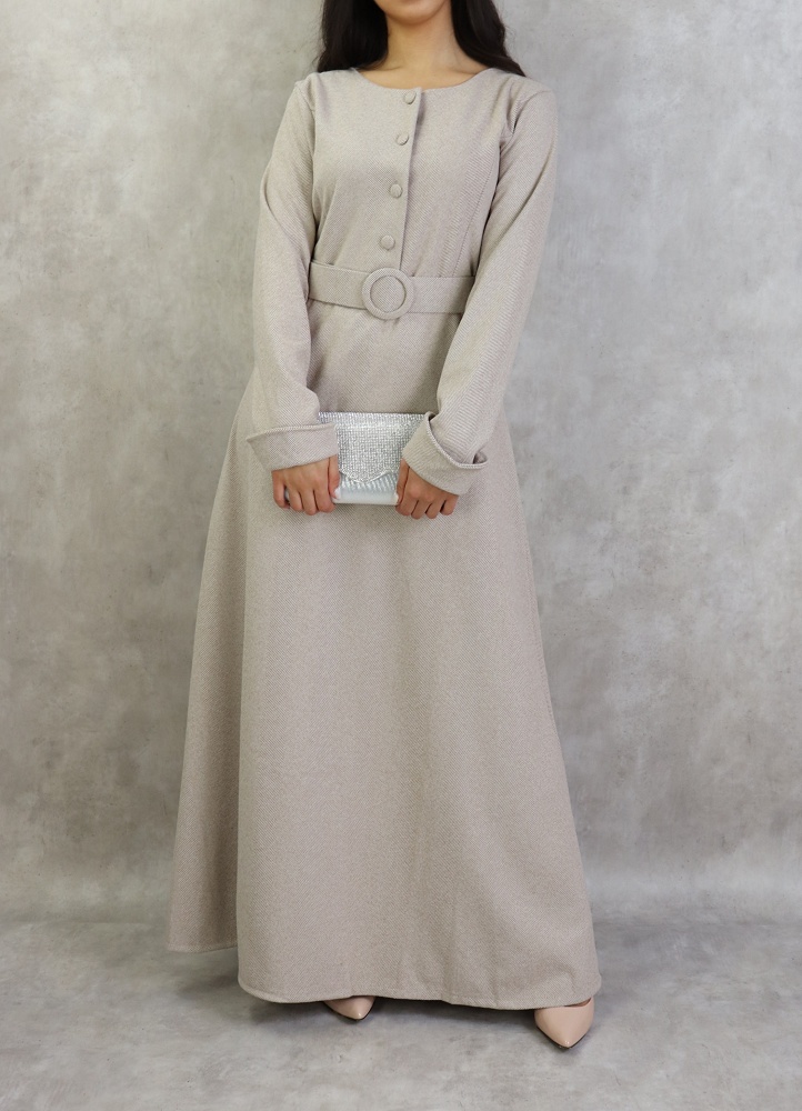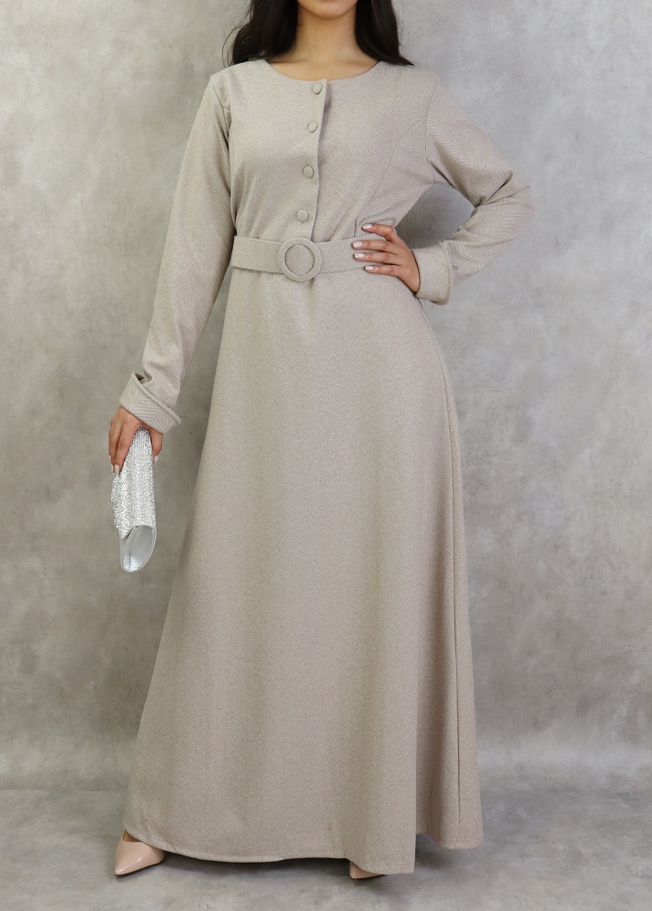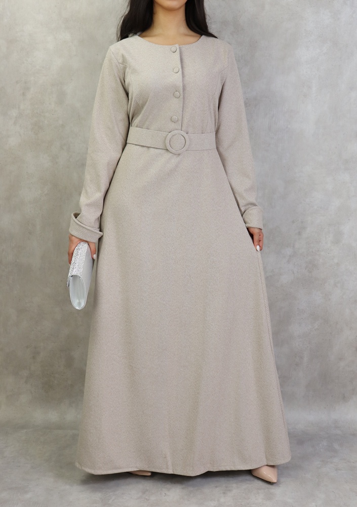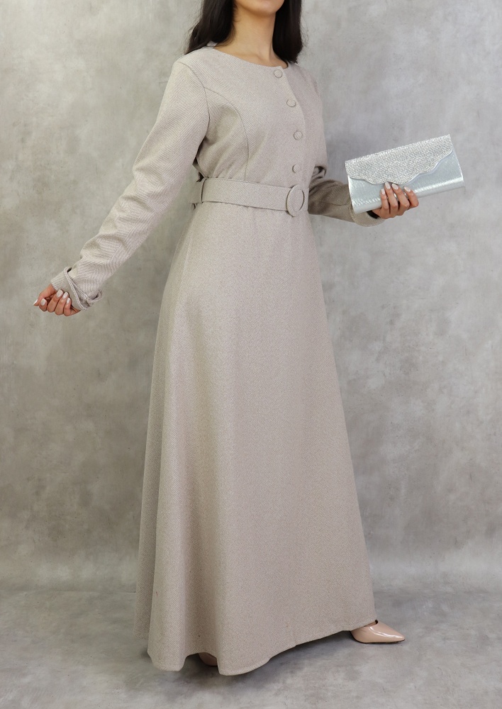 Robe longue, col rond, fermeture boutons sur le devant, manches finition revers, taille cintrée, ceinture réglable, assortie à passants, tissu doux et épais, effet lainage, coupe évasée vers le bas.