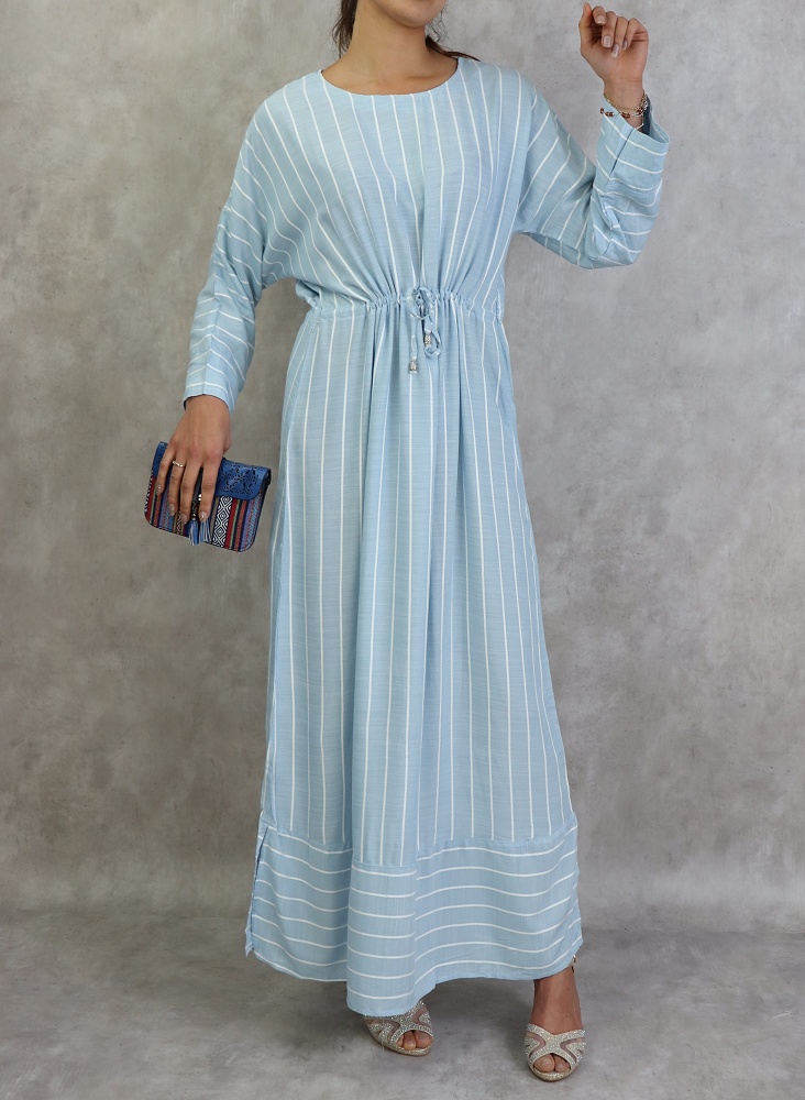 Robe longue à rayures décontractée ceinture intégrée (Boutique Vêtement Hijab) - Couleur menthe - REF. 36354 (25.00 €) - En Promotion à 19.90 €