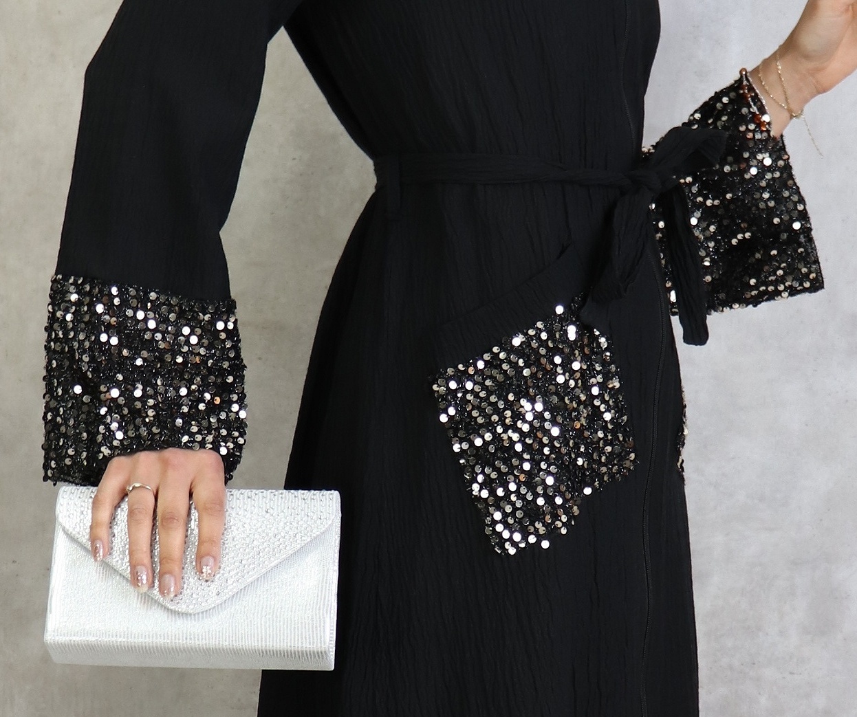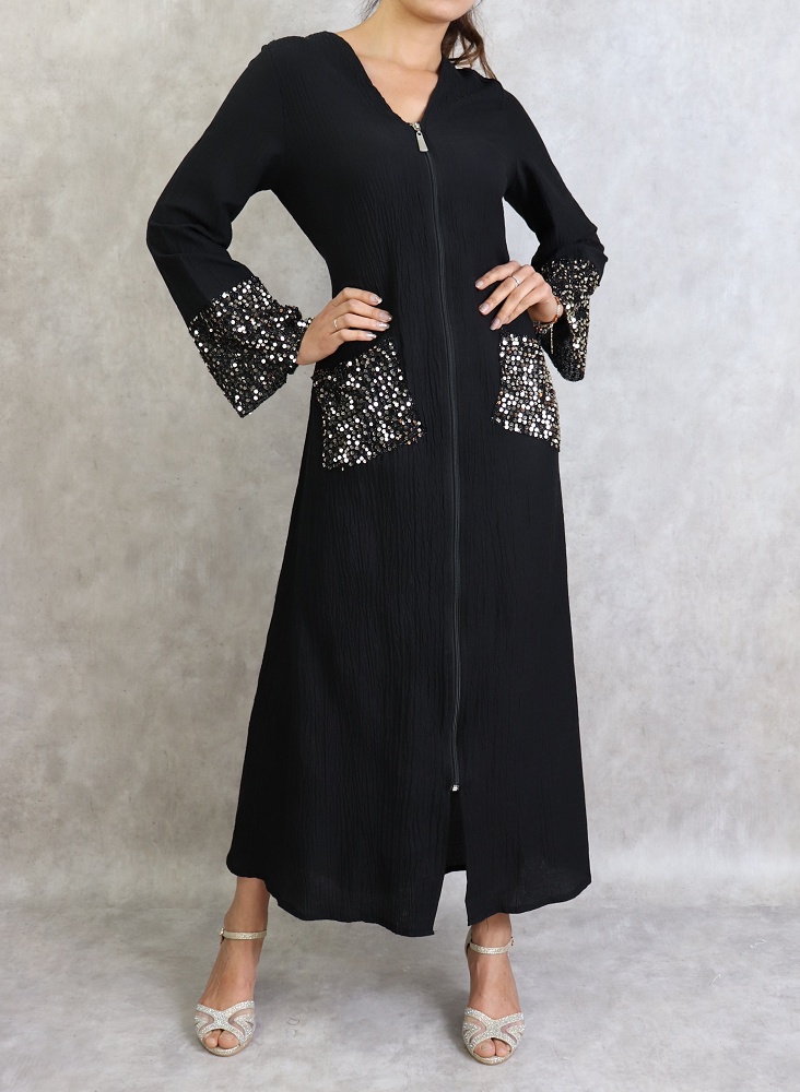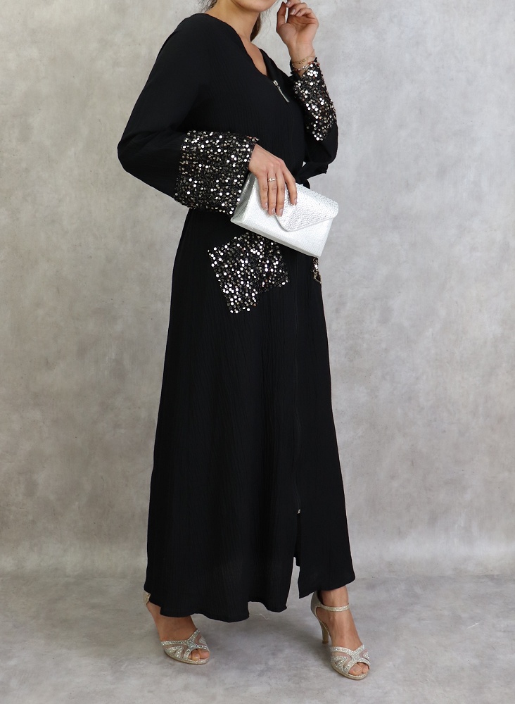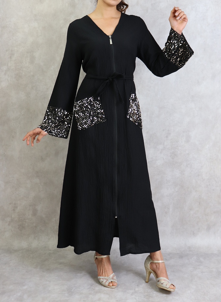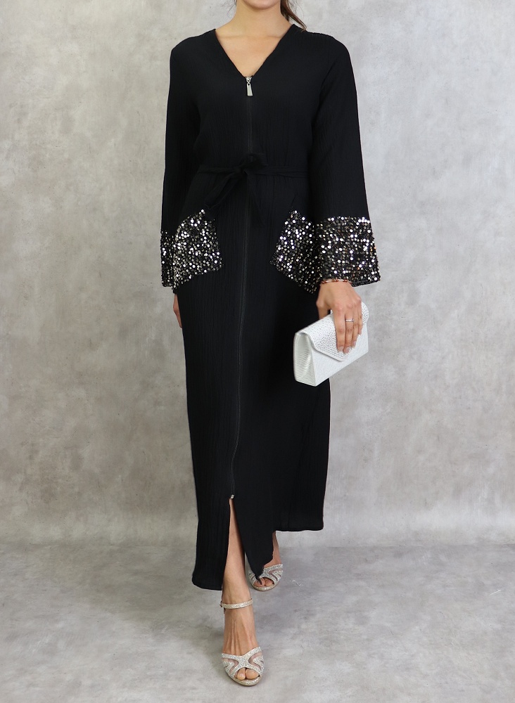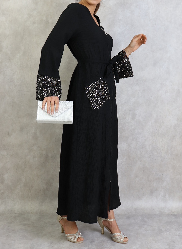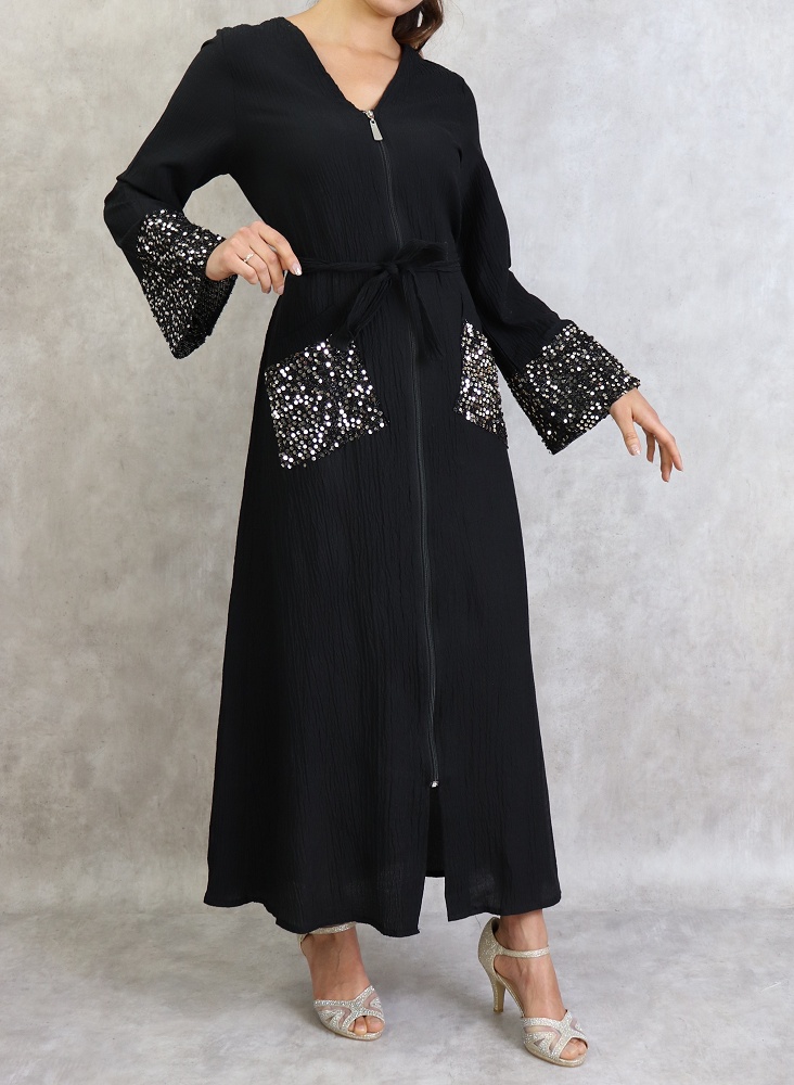 Robe longue, col en V, fermeture zippée sur toute la longueur, manches amples, ceinture à passants, 2 poches plaquées ornées de strass ainsi que sur les poignets, tissu effet crêpe.