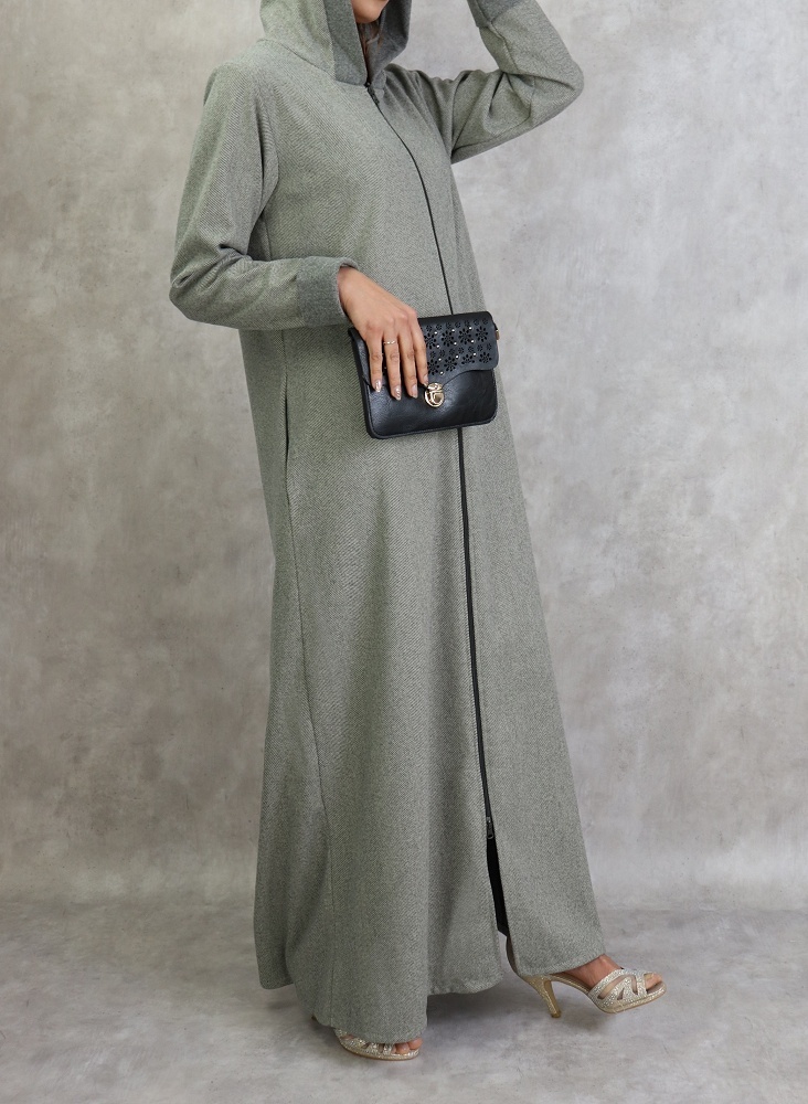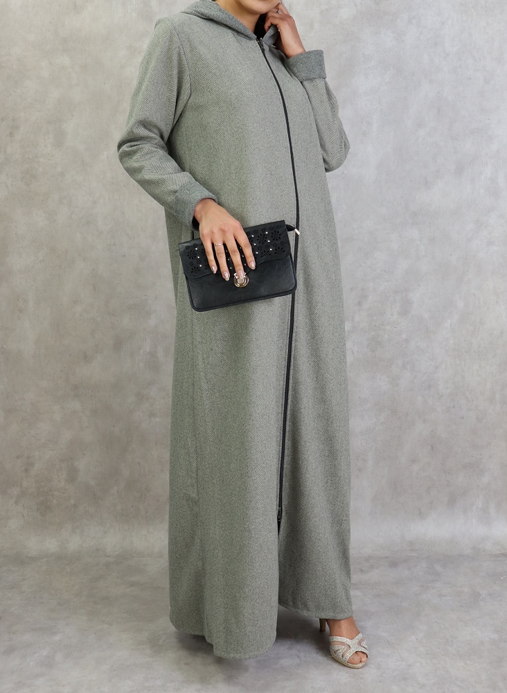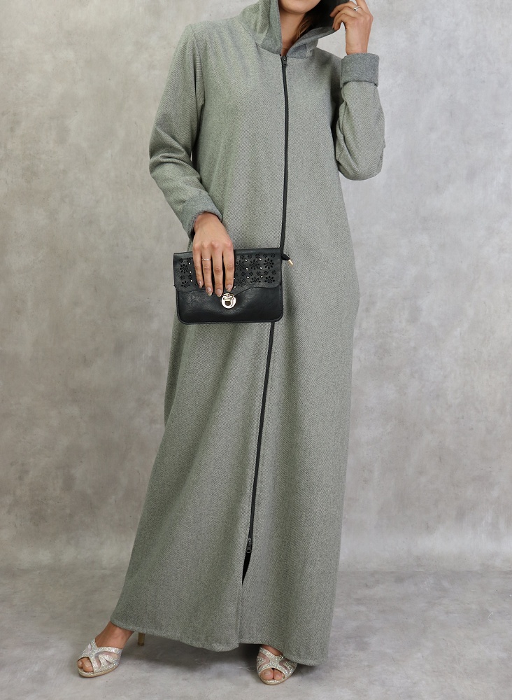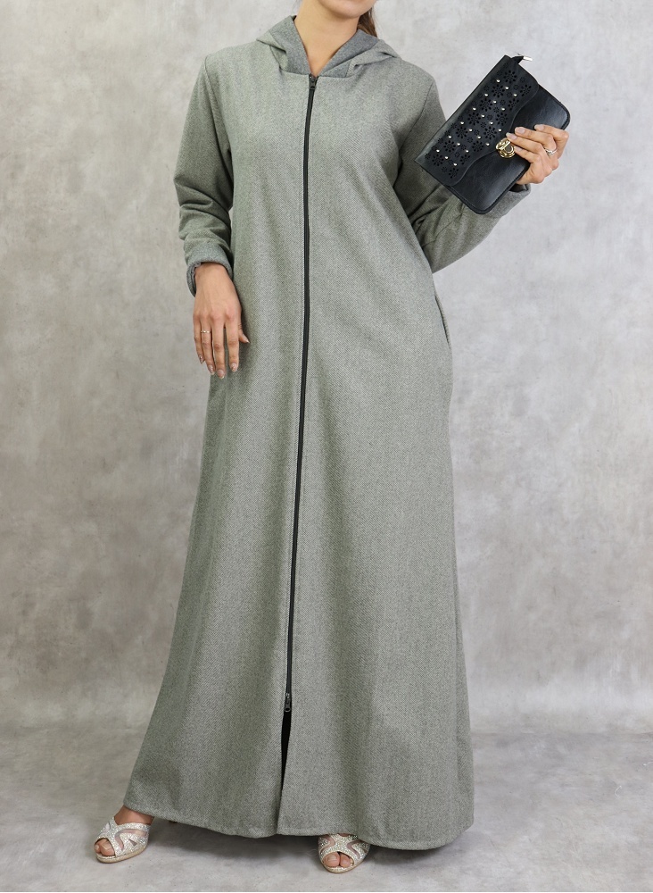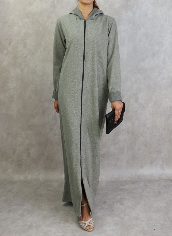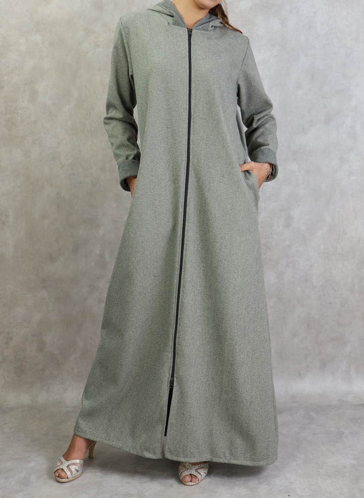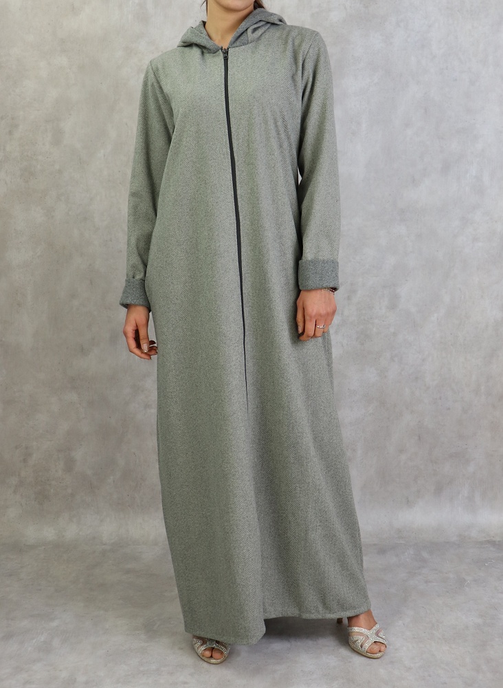 Robe longue à capuche fermeture zip (Boutique Modest Fashion pour jeune femme voilée) - Couleur gris anthracite écru - REF. 32820 (29.90 €) - En Promotion à 21.90 €