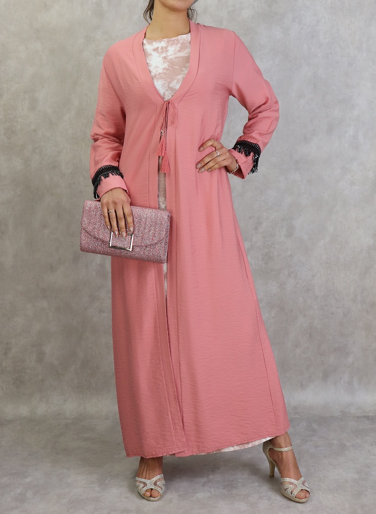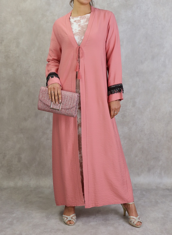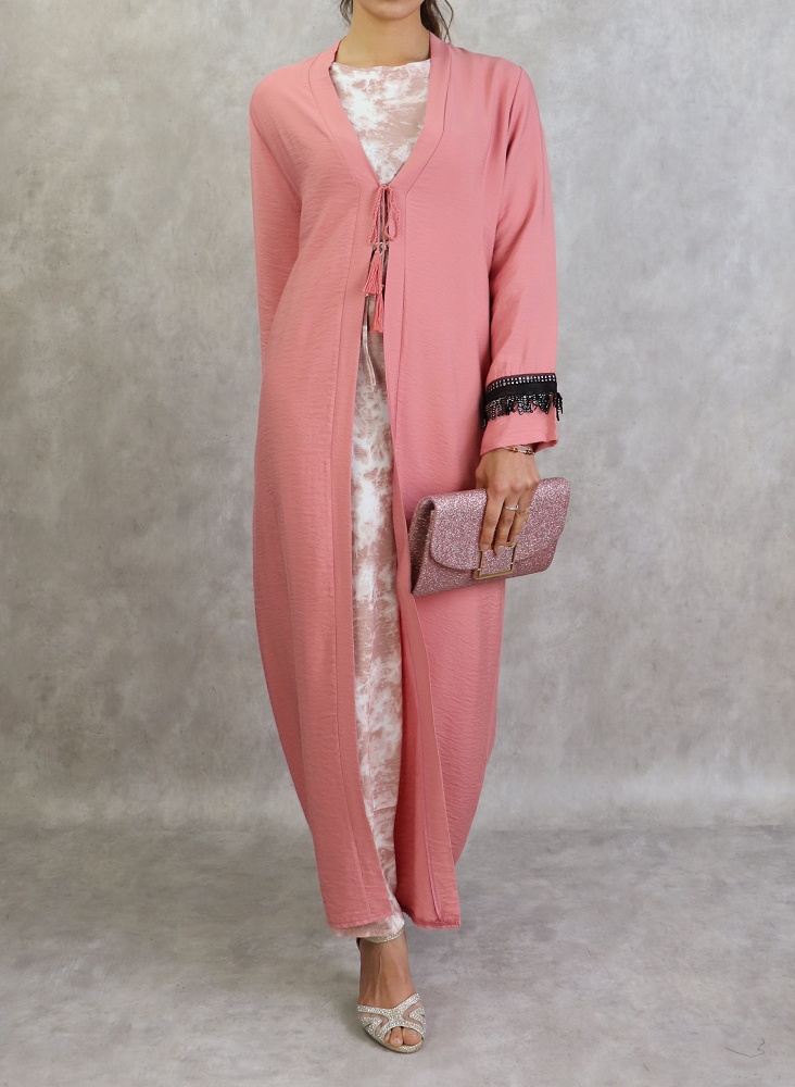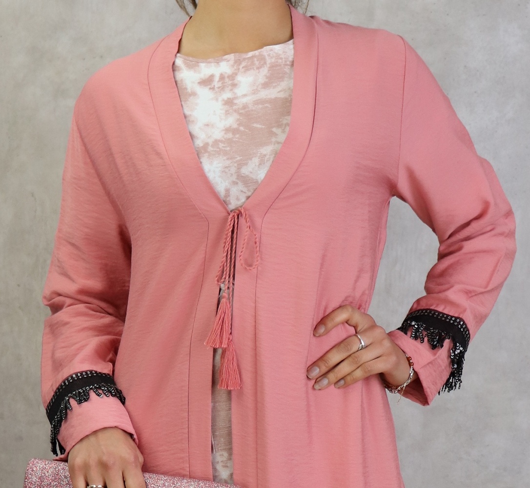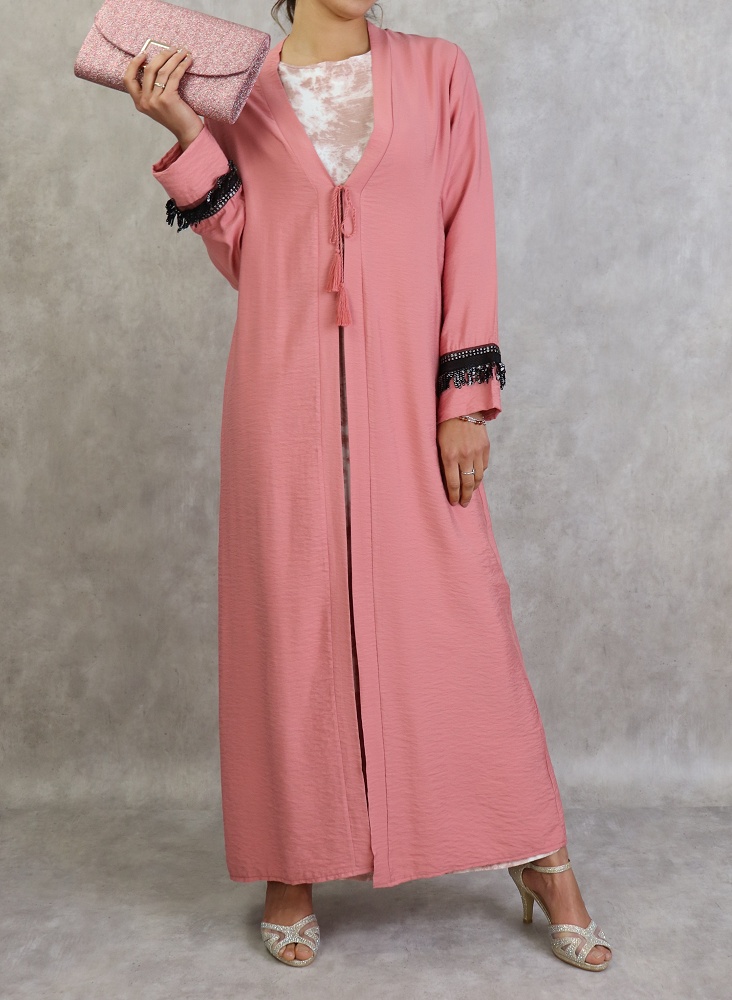 Kimono long, fermeture par cordons à pompons, ornements franges à strass sur le bas des manches, tissu non transparent.