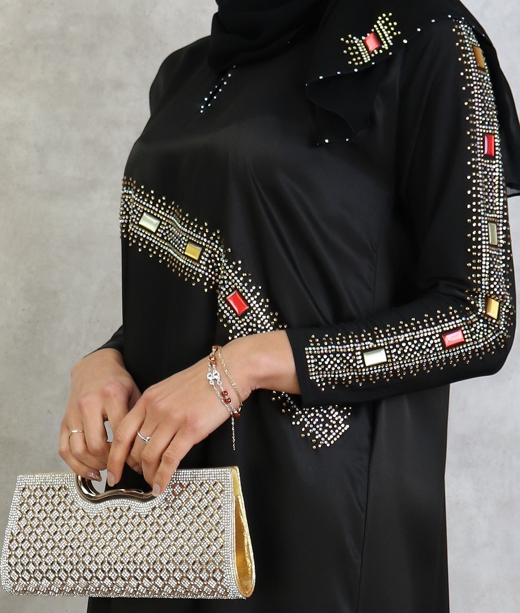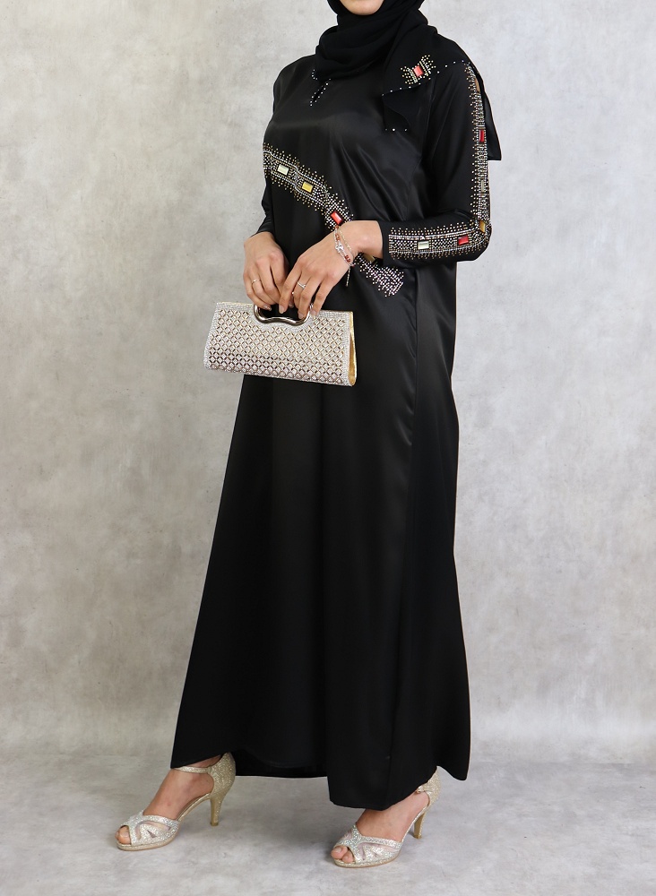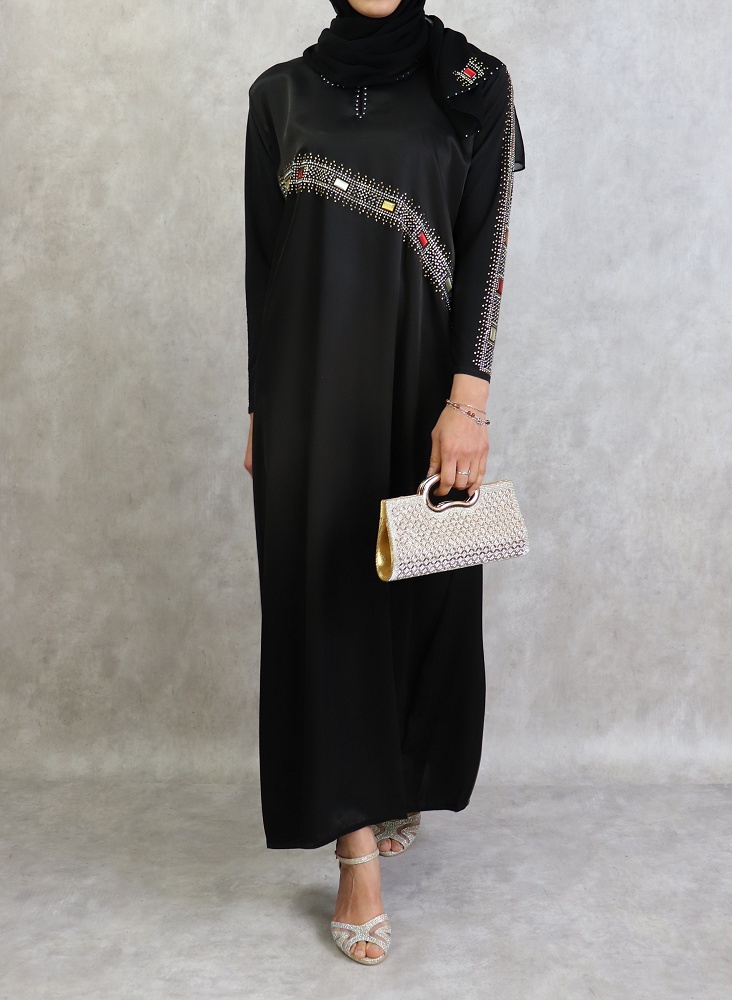 Abaya noire agrémentée de strass et rubis rouges jaunes blanc et dorés sur le devant ainsi que sur toute la longueur des manches.