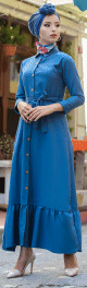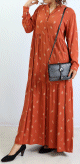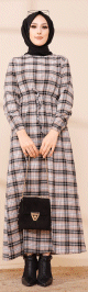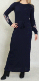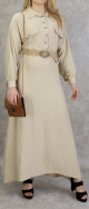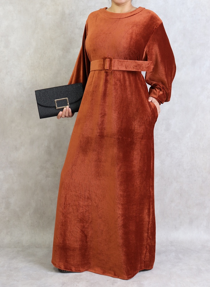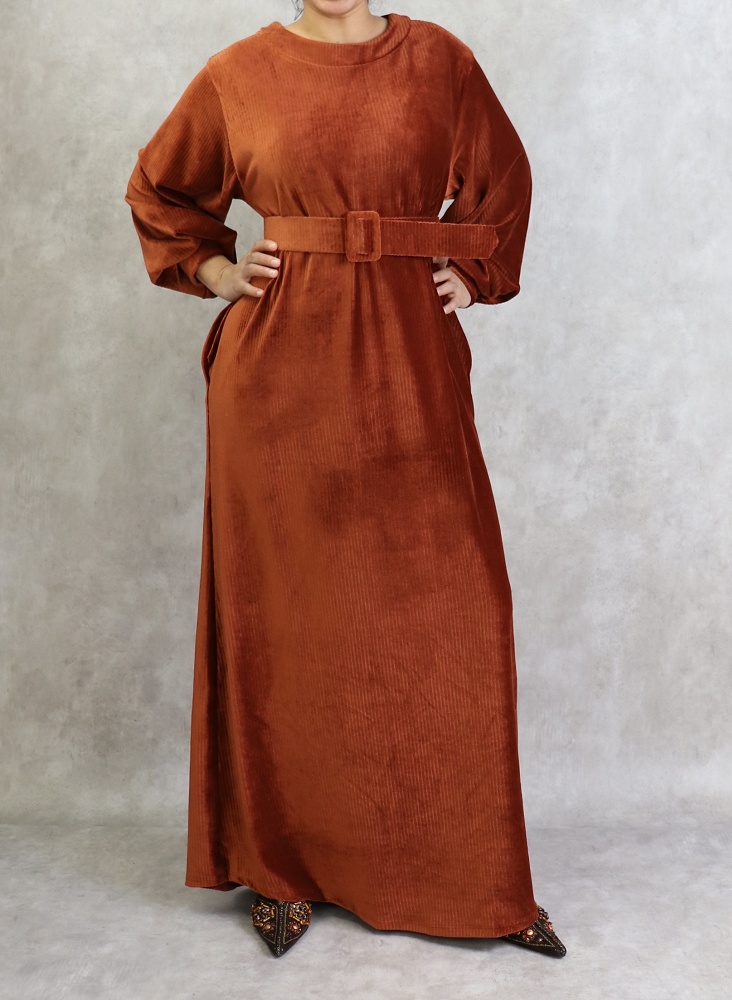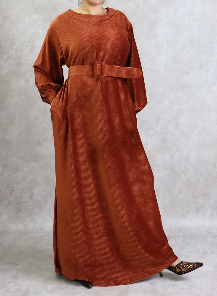 Robe longue, col dégagé, ceinture assortie ajustable, poches latérales, tissu épais et doux, effet velours côtelé, coupe droite.