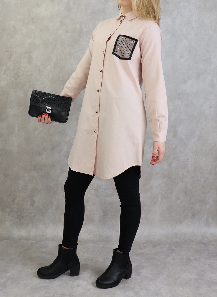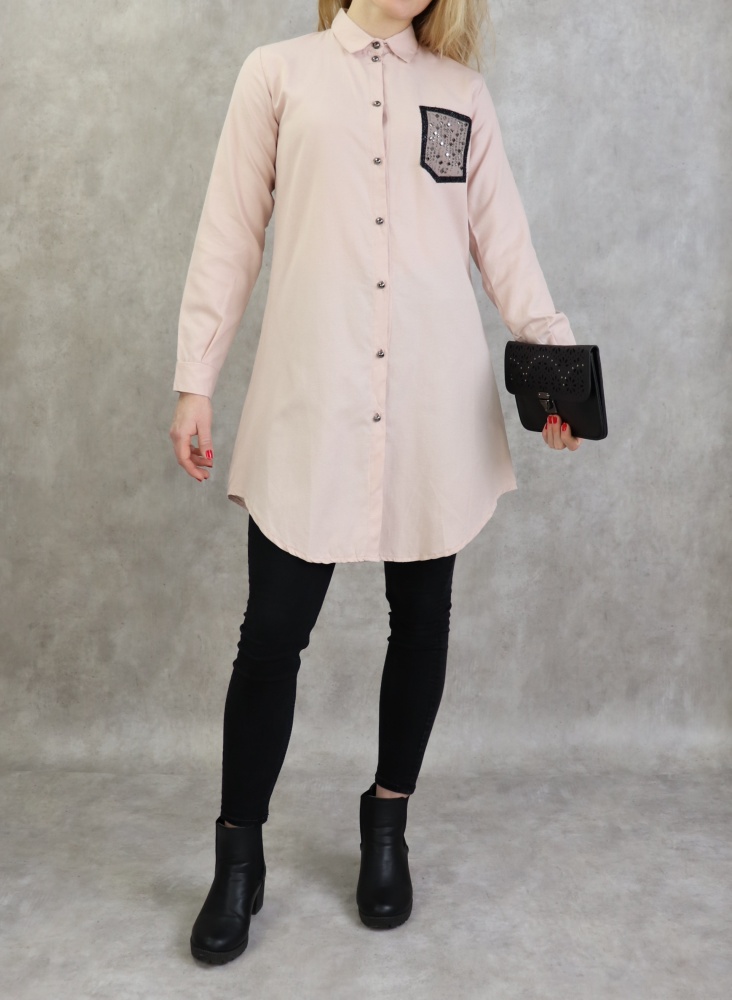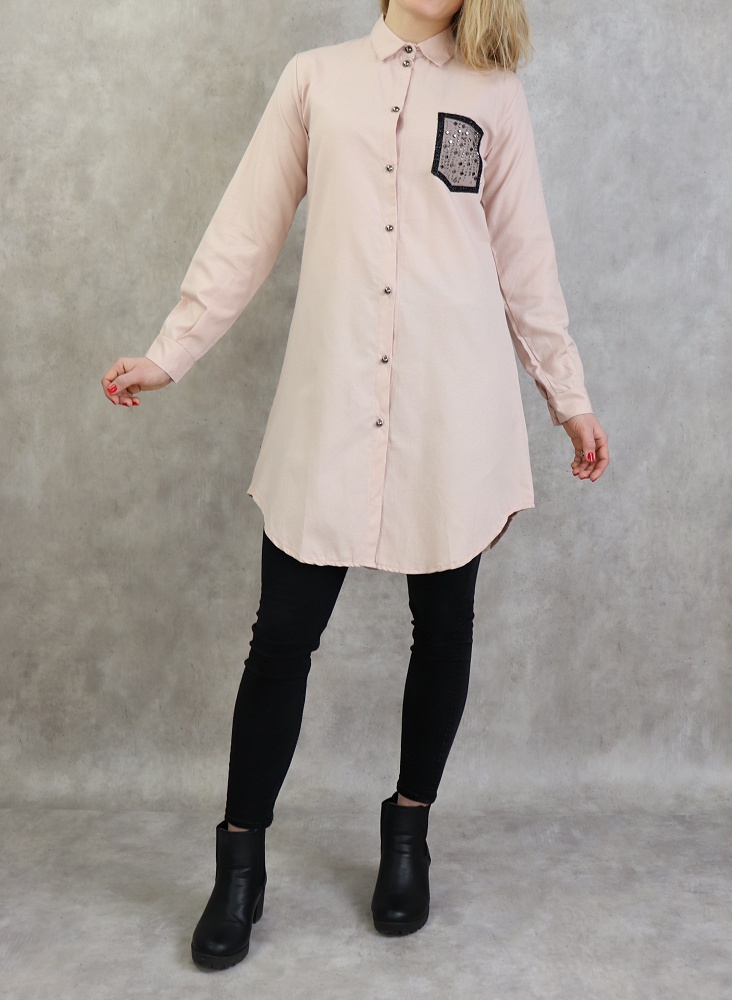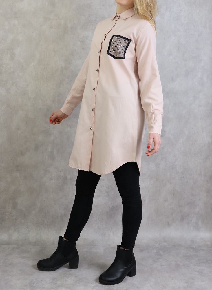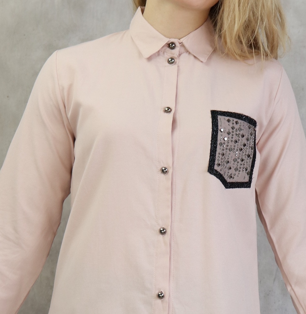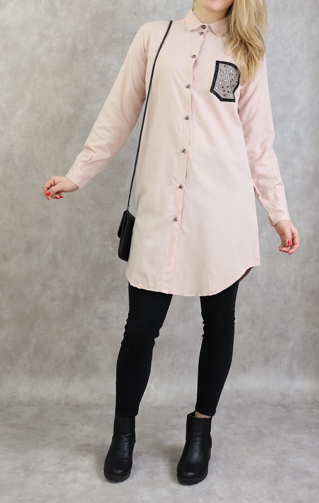 Chemise longue, col chemise, manches finition bouton, imitation fausse poche strass et paillette sur un coté, fermeture boutons, coupe droite, tissu non transparent.