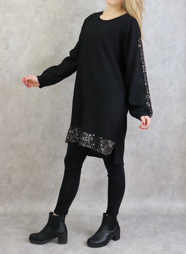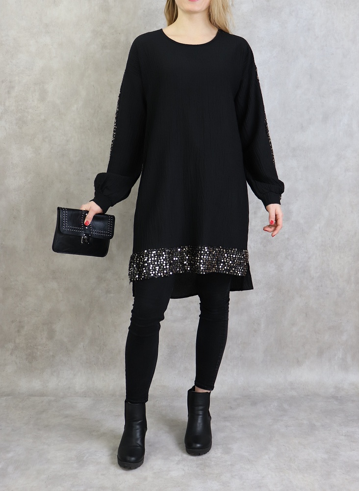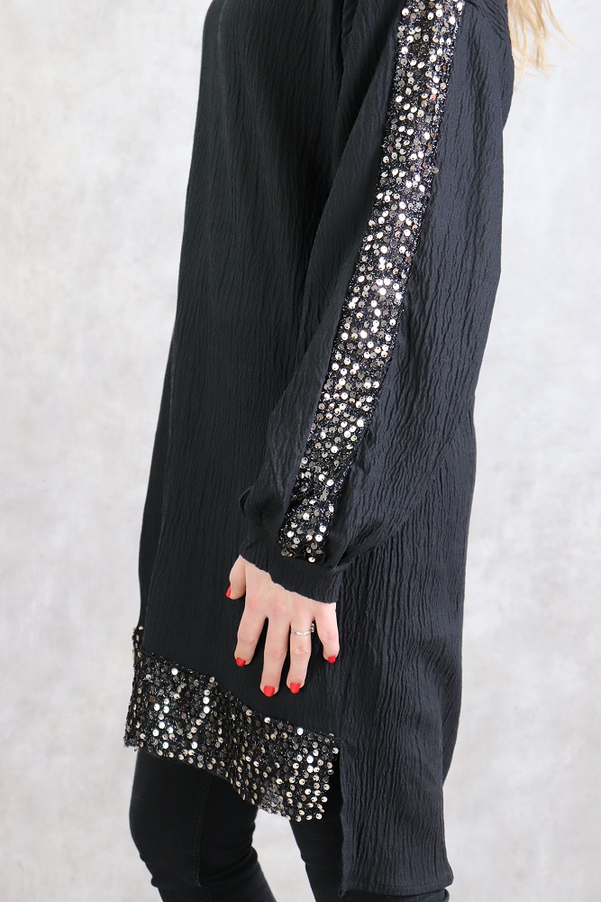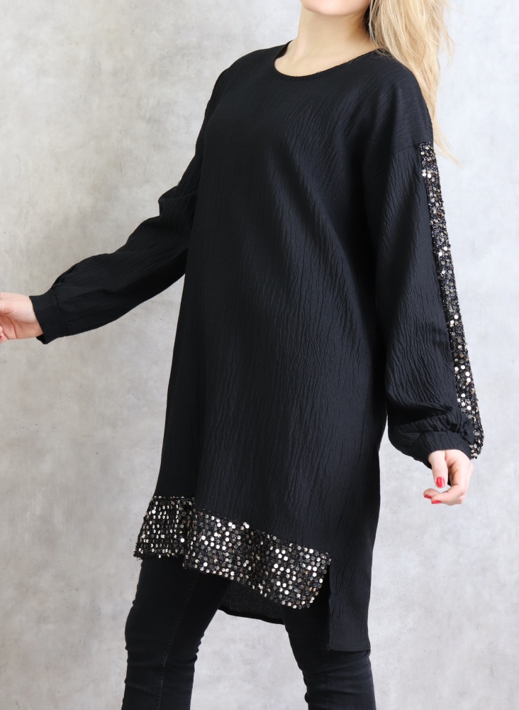 Tunique longue, col arrondi, strass sur les manches ainsi que sur le bas, tissu effet crêpe, coupe ample.