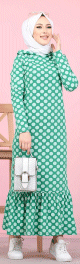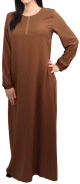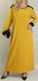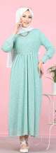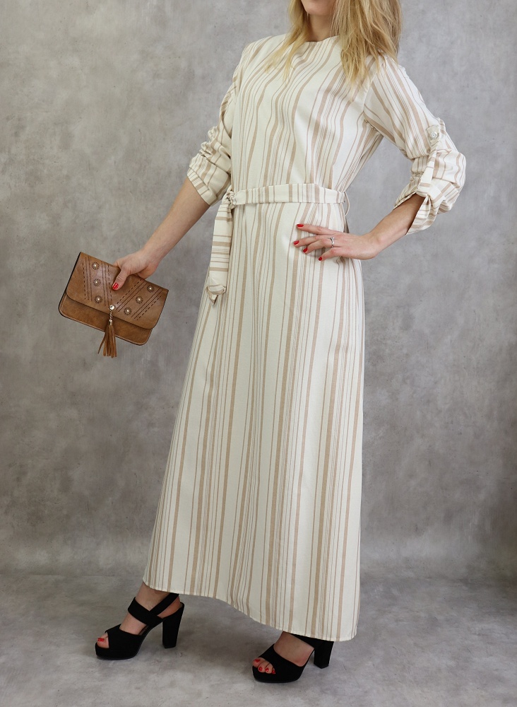 Robe longue, col arrondi, manches ajustables, ceinture à passants assortie, coupe droite, tissu confortable et opaque.
