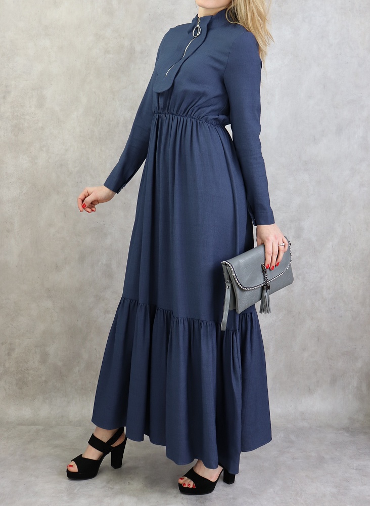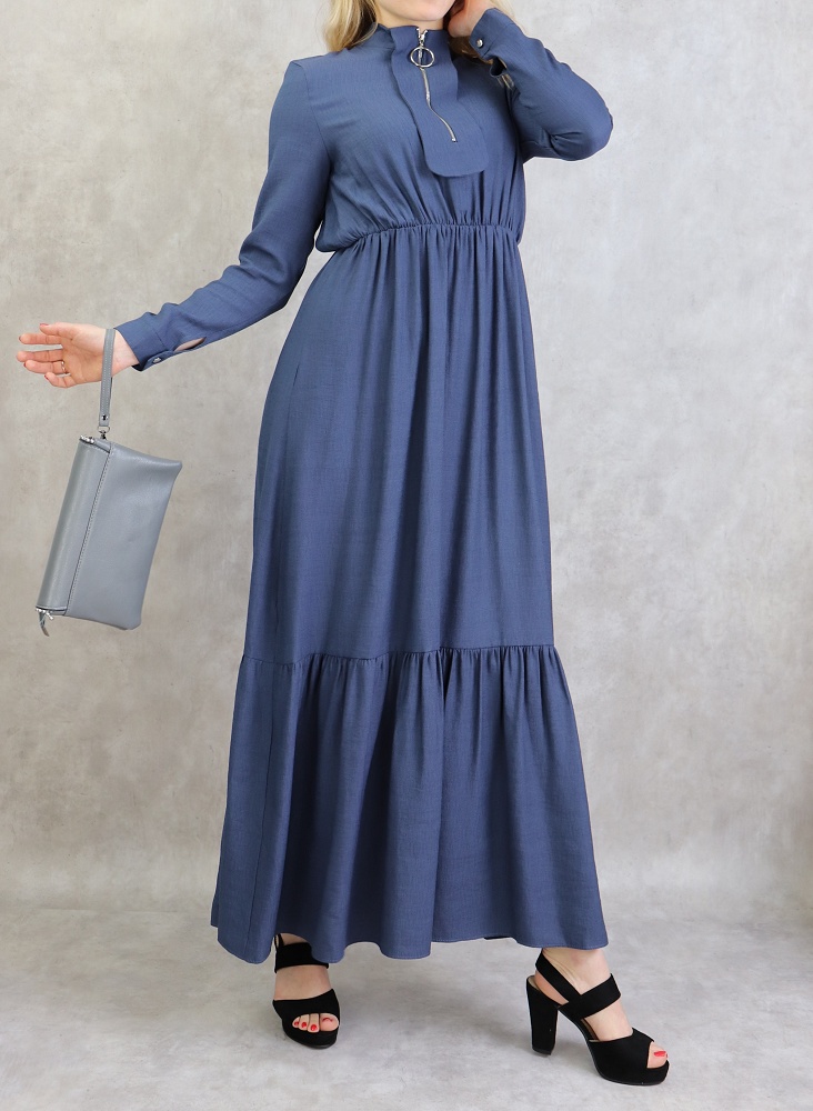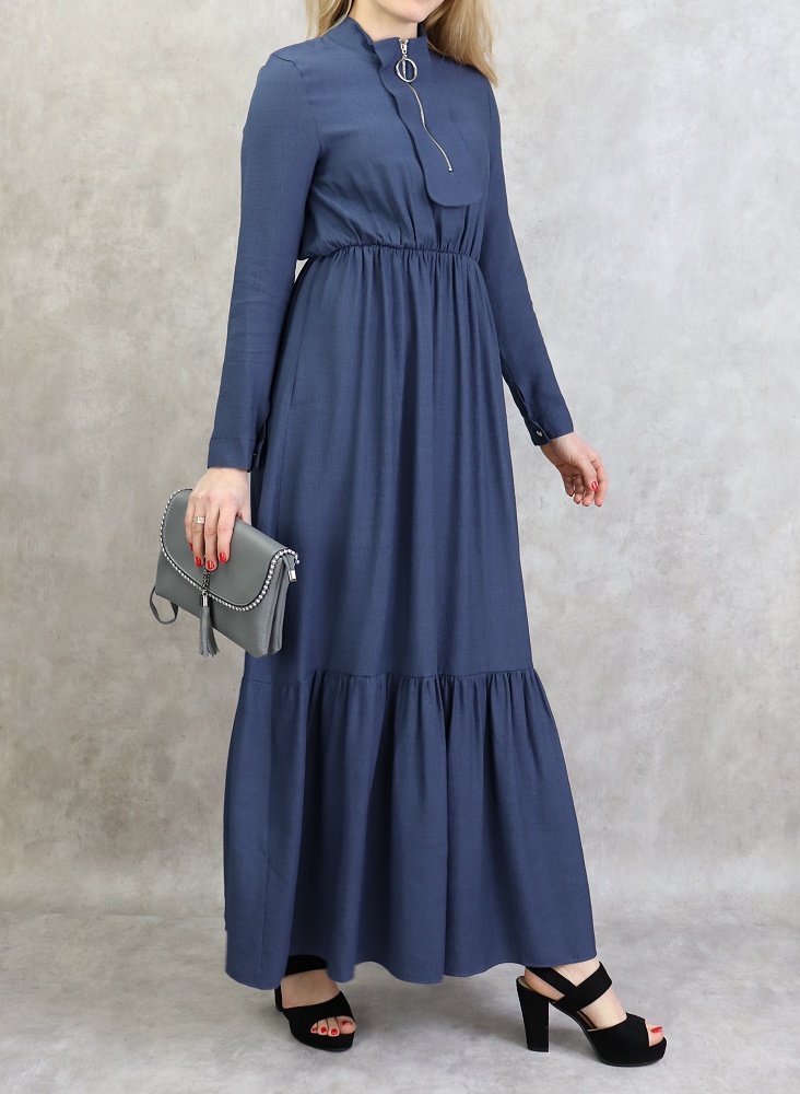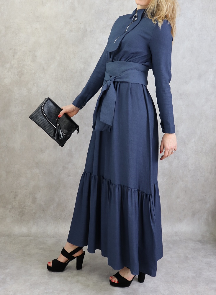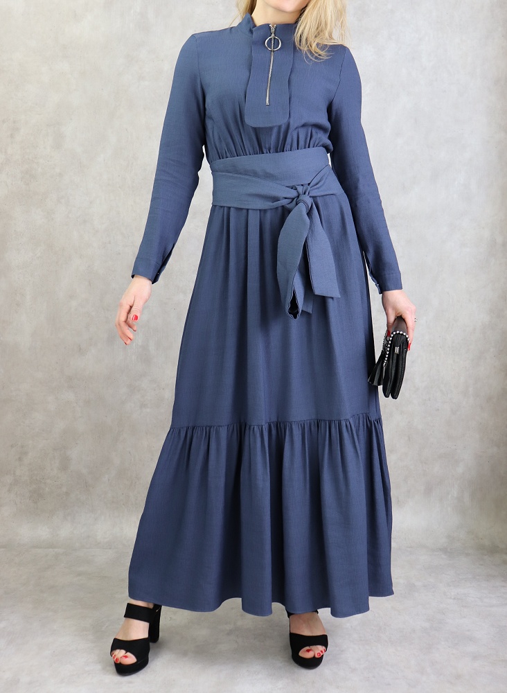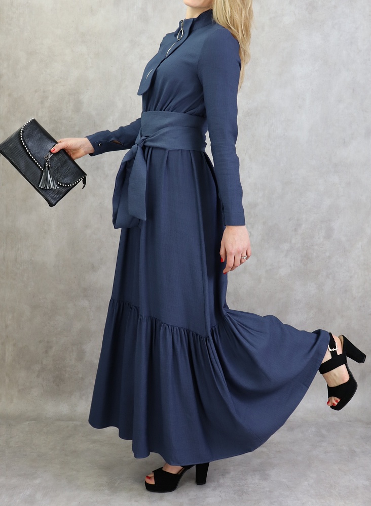 Robe longue, col Mao, fermeture éclair sur le buste, manches finition bouton, taille cintrée élastique, large ceinture assortie, tissu effet lin tissé.