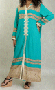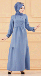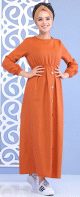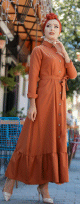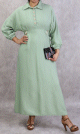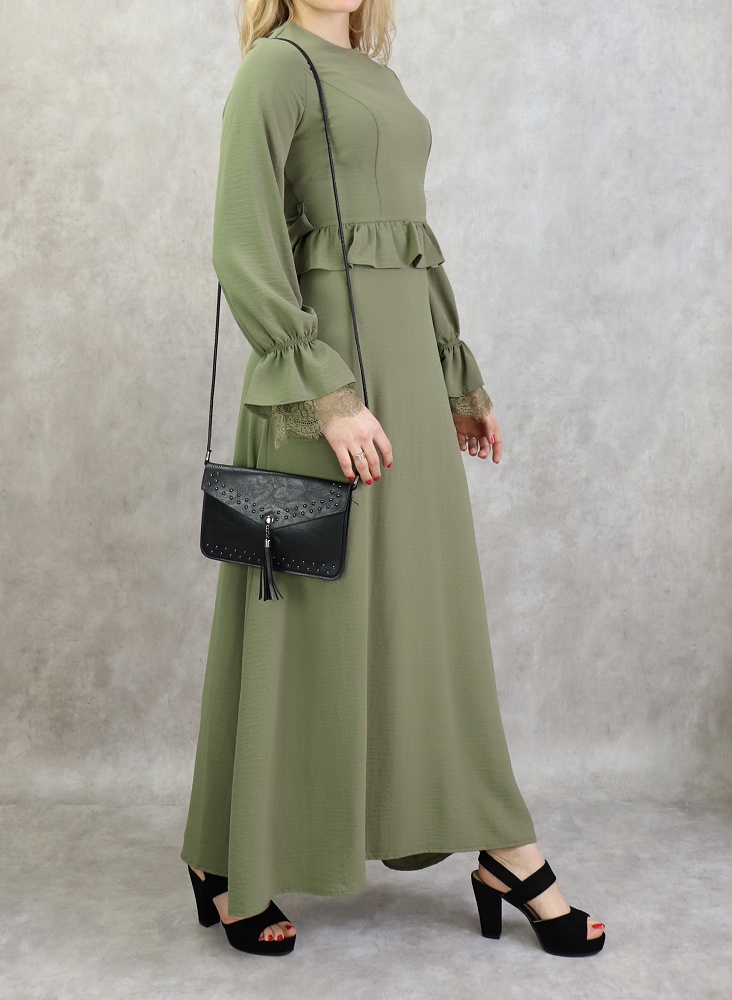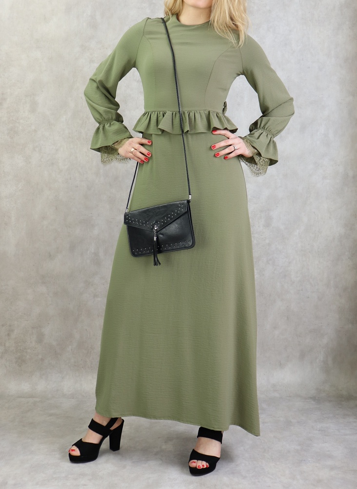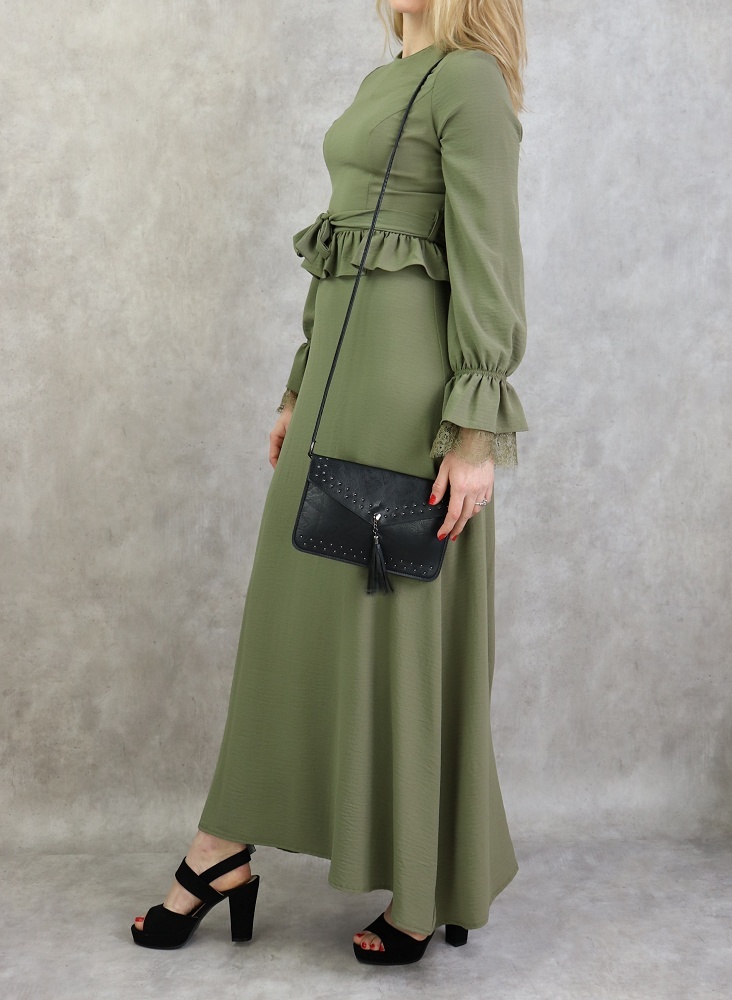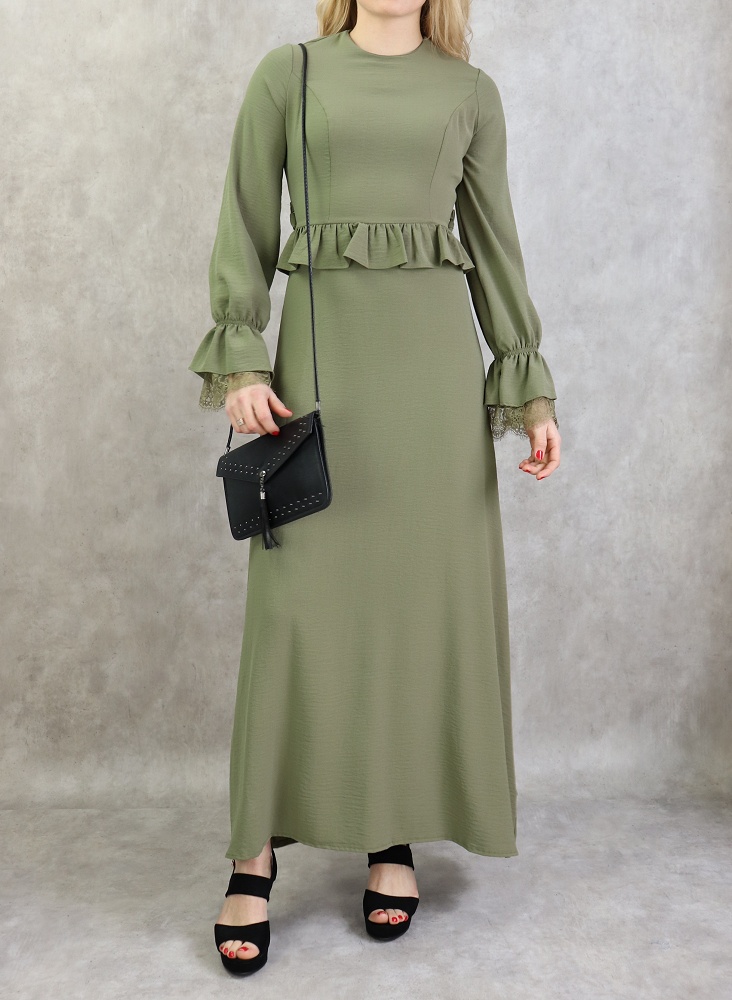 Robe longue évasée, col rond, fermeture glissière au dos, manches finition élastique froufrous et dentelles aux poignets, taille cintrée ornée d'un volant, ceinture assortie à passants, tissu doux, fluide et opaque.