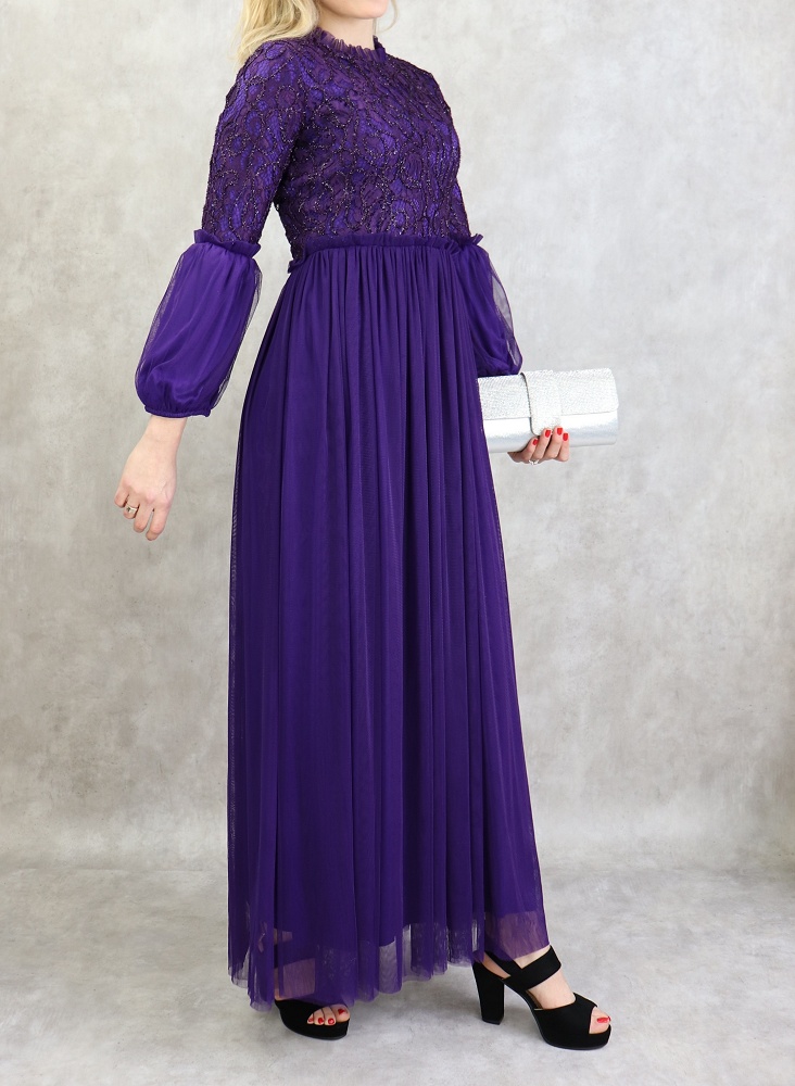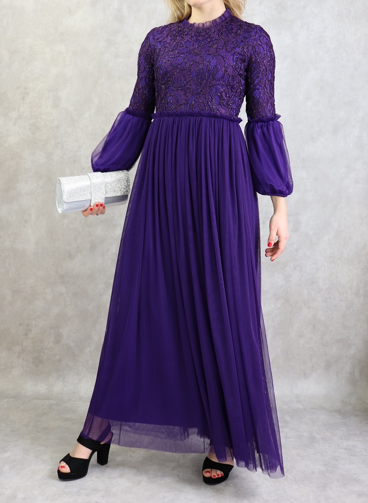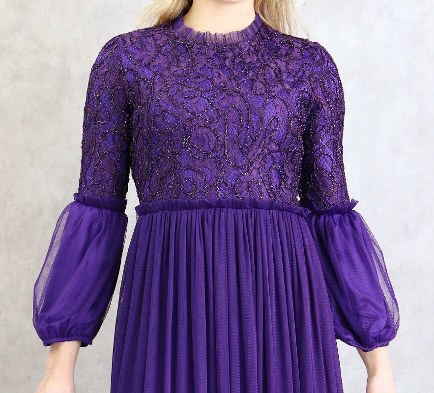 Robe longue, col rond orné d'une collerette, manches finition élastique aux poignets, fermeture à glissière dans le dos, entièrement doublée, broderies sur le buste et une partie des manches, tulle sur tout le reste de la robe.