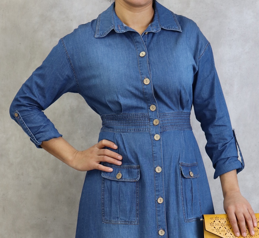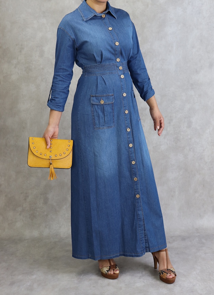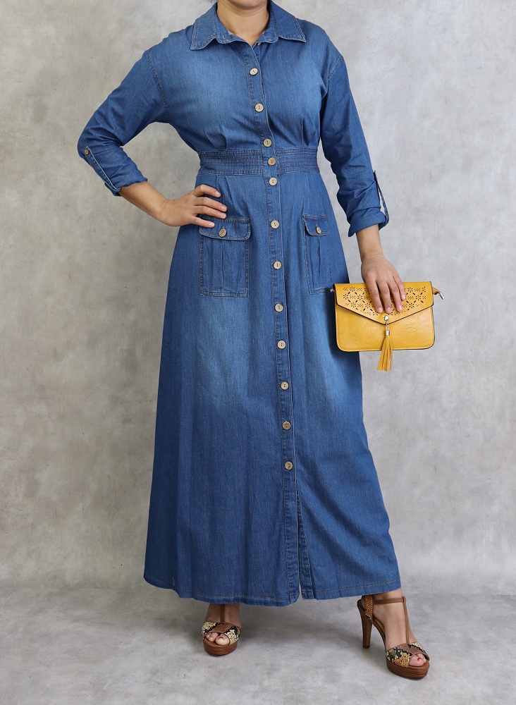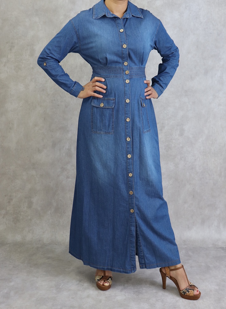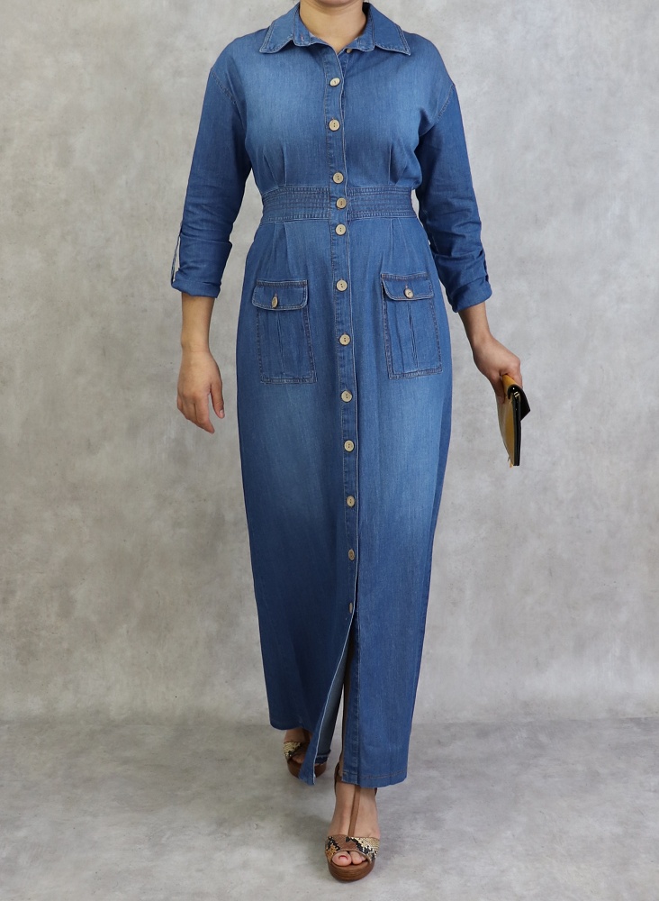 Robe longue, col chemise, manches ajustables et fermeture bouton aux poignets, taille élastique, 2 poches plaquées à l'avant, tissu effet jean.