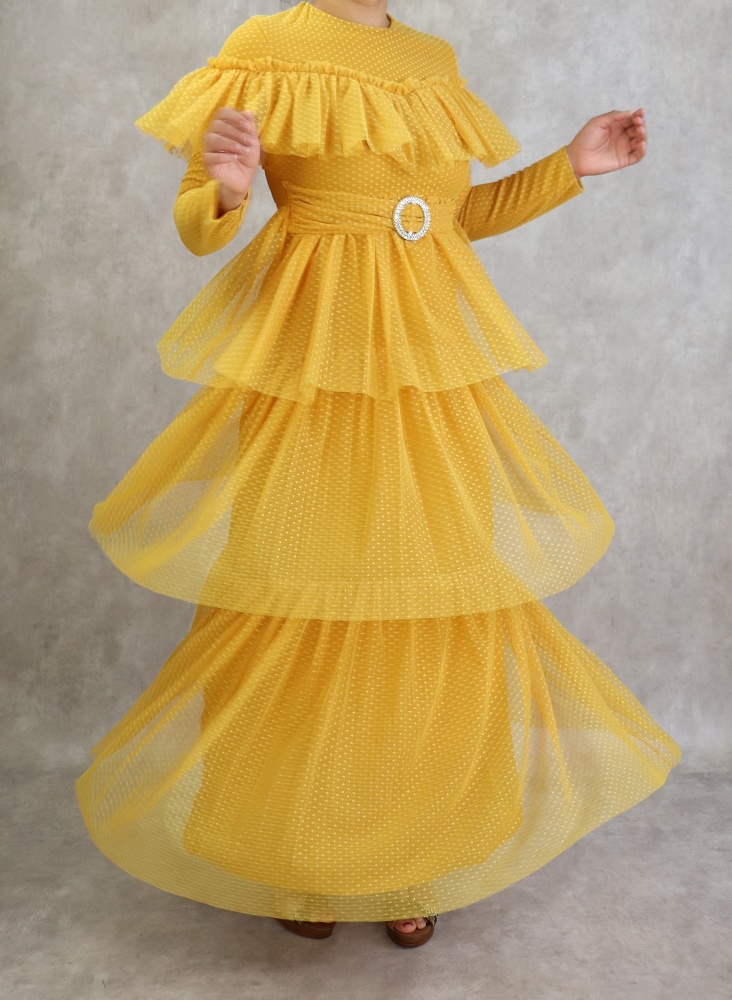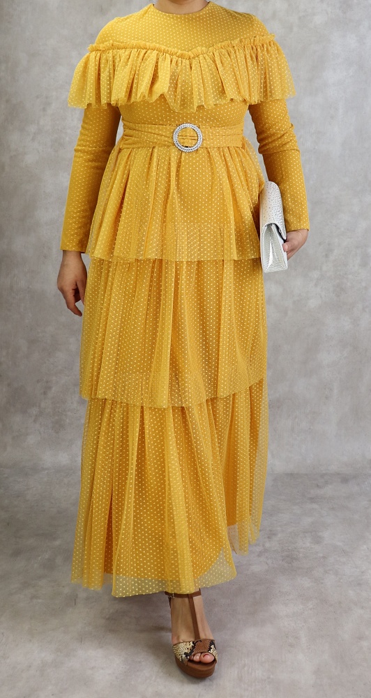 Robe longue, col rond, taille élastique, ceinture d'ornement en strass, fermeture glissière au dos, entièrement doublée, tissu extérieur effet tulle avec volants.