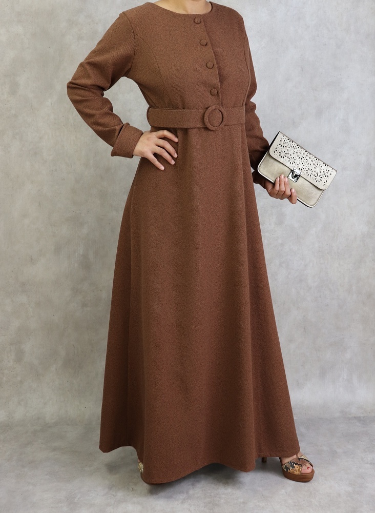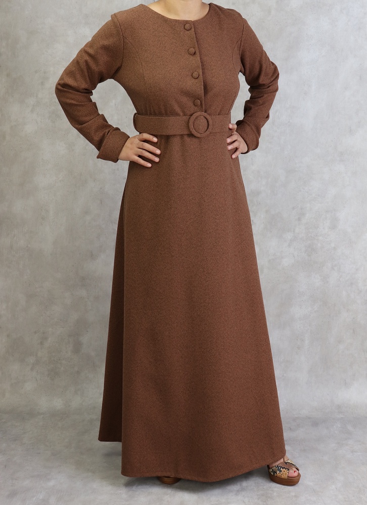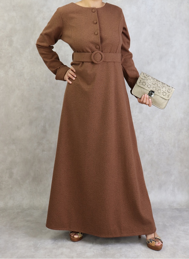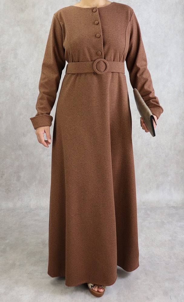Robe longue, col rond, fermeture boutons sur le devant, manches finition revers, taille cintrée, ceinture réglable, assortie à passants, tissu doux et épais, effet lainage, coupe évasée vers le bas.