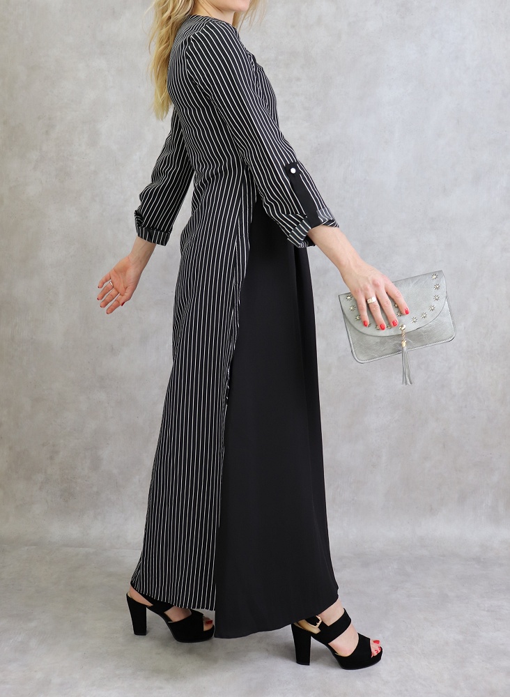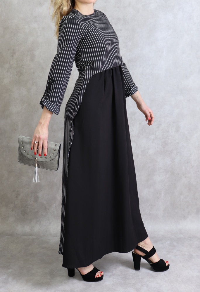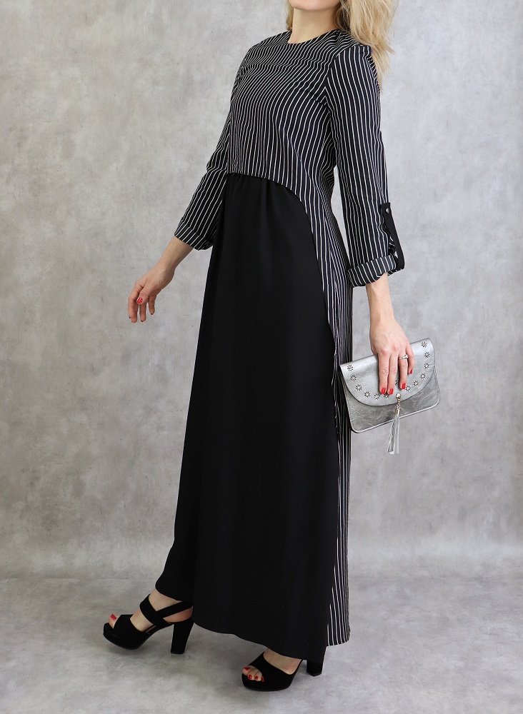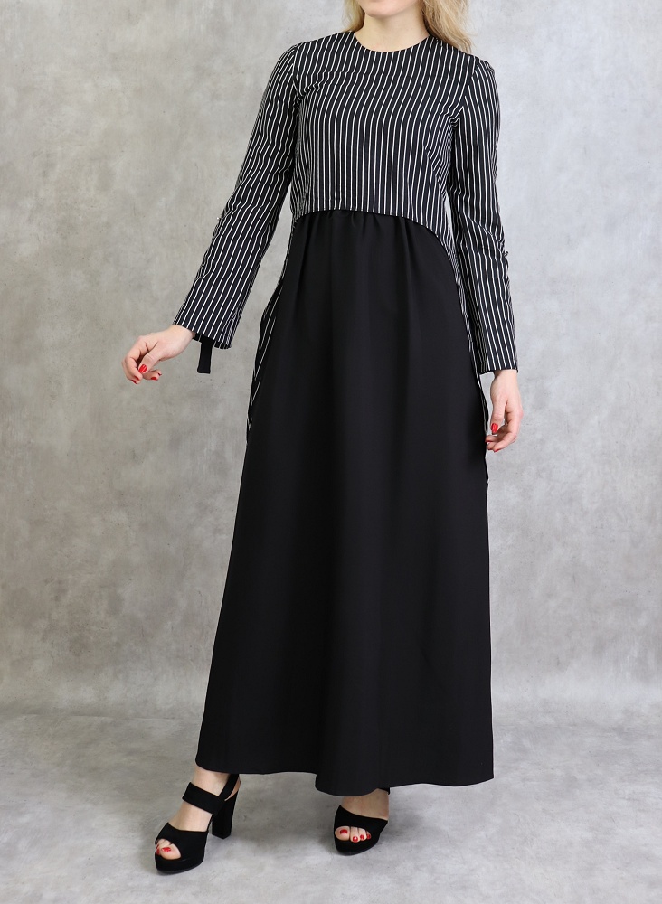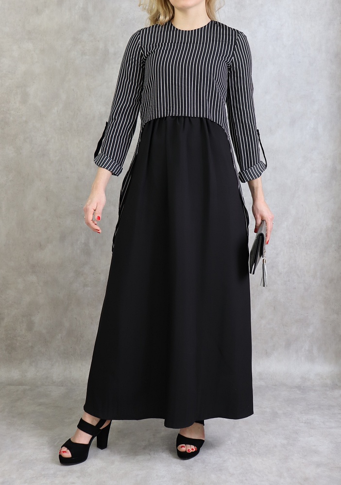 Robe longue, col rond, fermeture glissière au dos, manches ajustables, tissu opaque, effet deux pièces cousues.