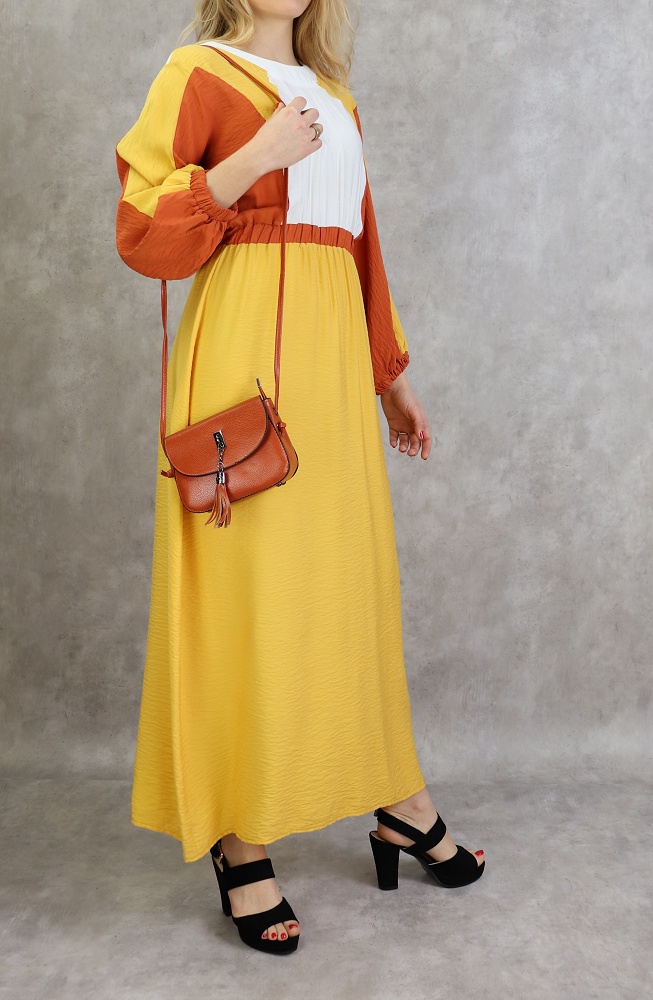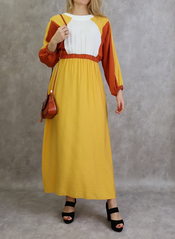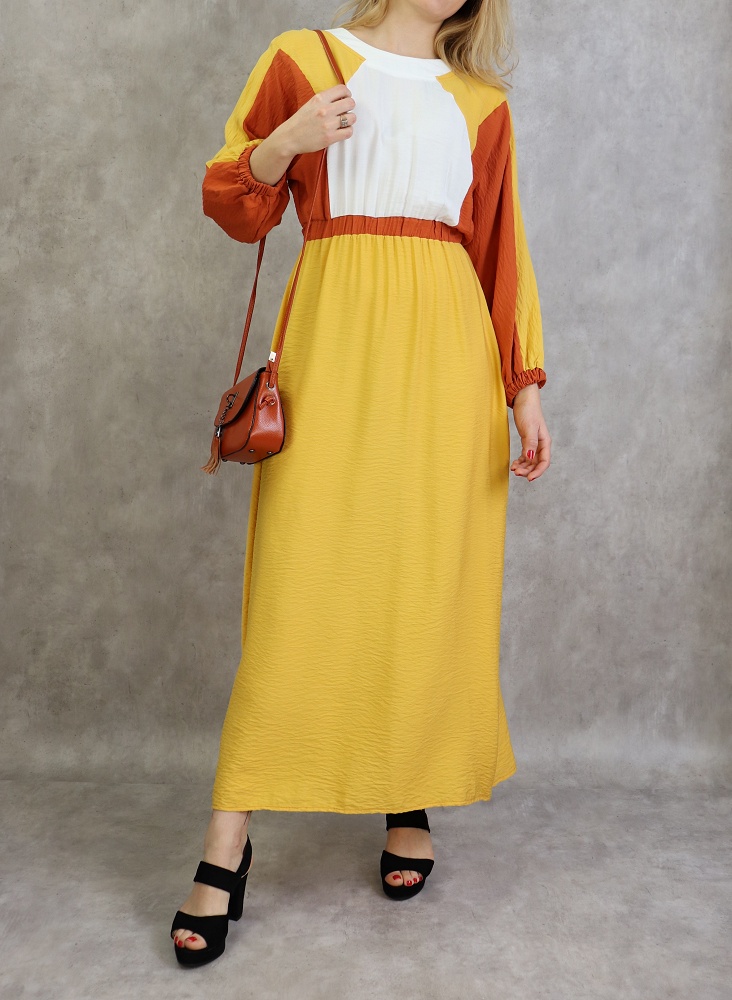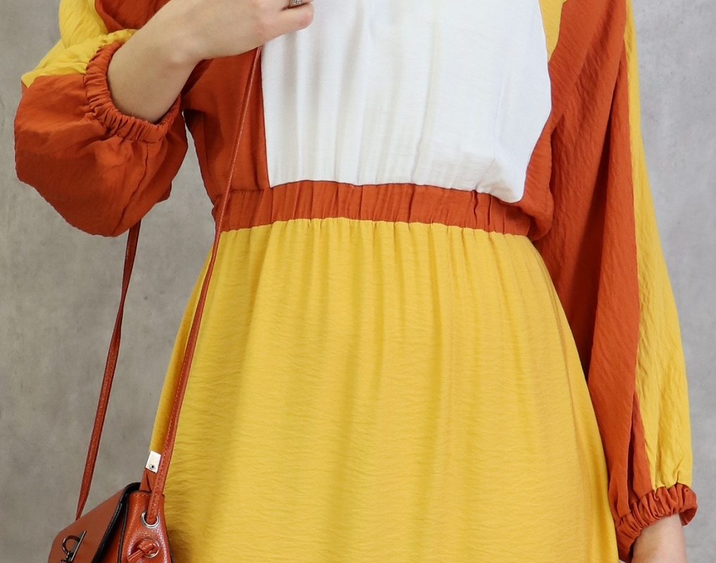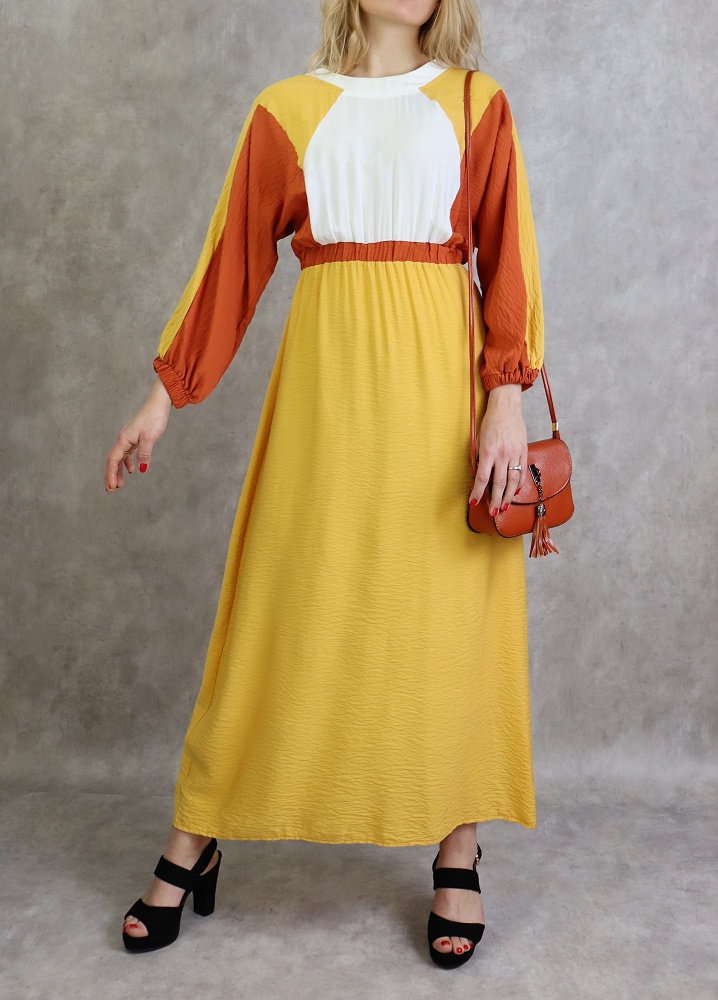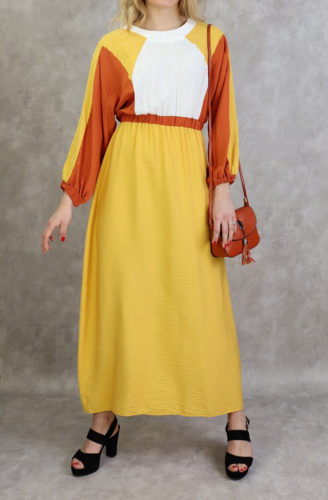 Robe casual tricolore de couleur jaune or, brique et blanc