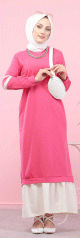 Robe longue moderne et décontractée bi-couleur pour femme voilée (Robes Hijab pas cher) - Couleur rose fuchsia et blanc - REF. 32836 (19.90 €)