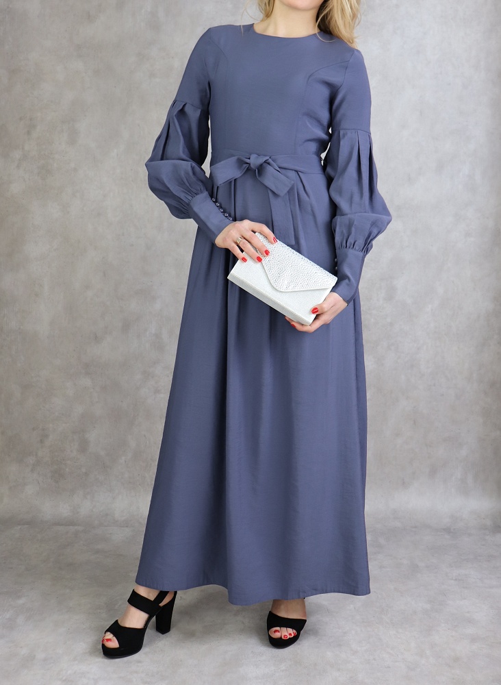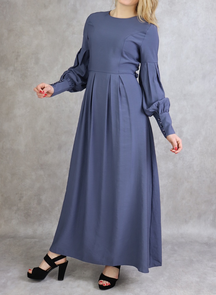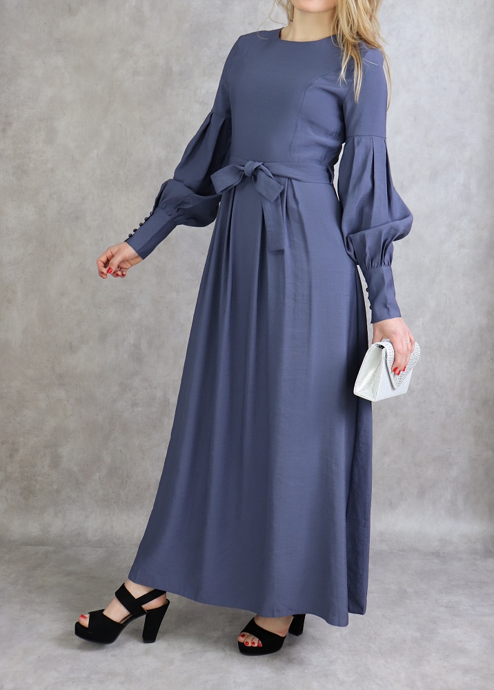 Robe longue, col rond, fermeture zip au dos, manches finitions larges poignets 5 boutons, 2 poches latérales, taille cintrée avec plis creux, ceinture assortie à passants, tissu agréable et opaque adapté à toutes les saisons.