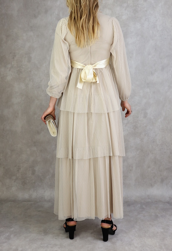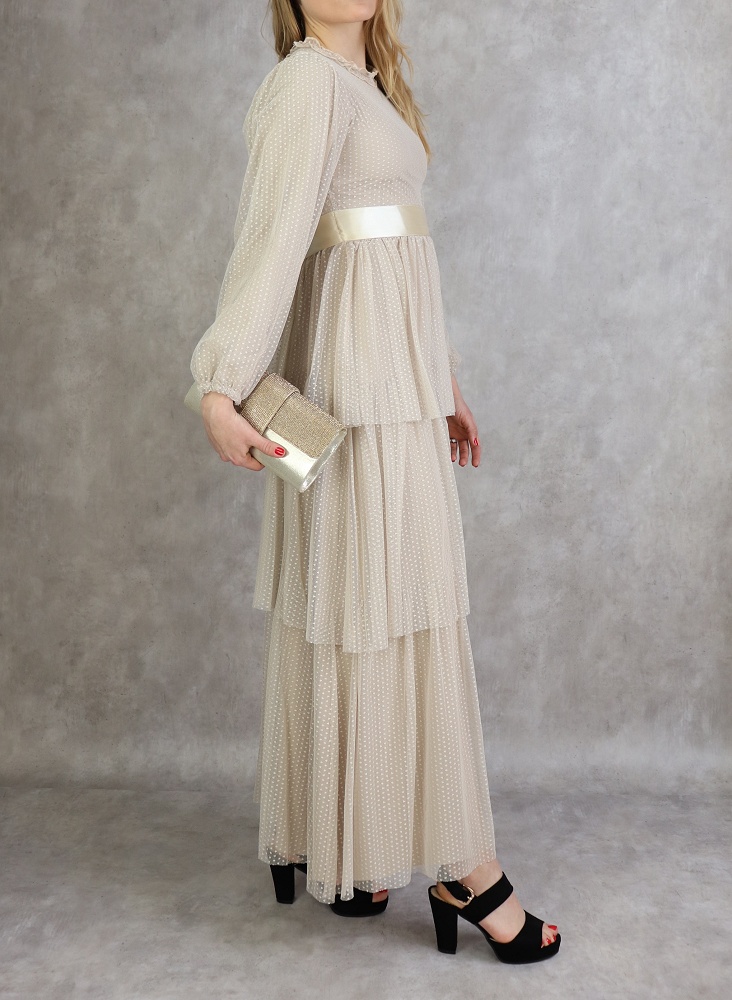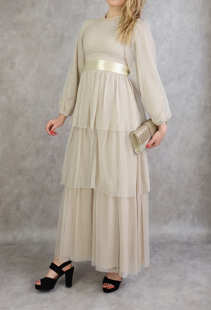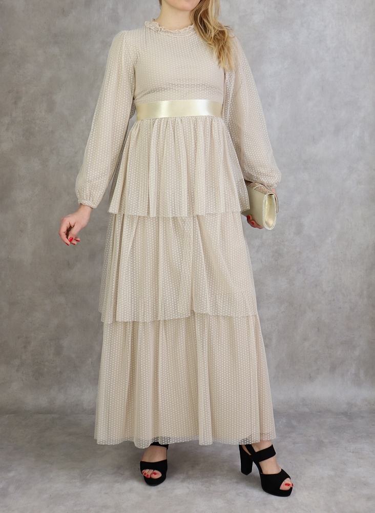 Robe longue, col rond à petite collerette, fermeture glissière au dos, manches finition élastique aux poignets, taille cintrée, ceinture satinée cousue, entièrement doublée, tissu extérieur effet tulle, volants sur la partie basse.