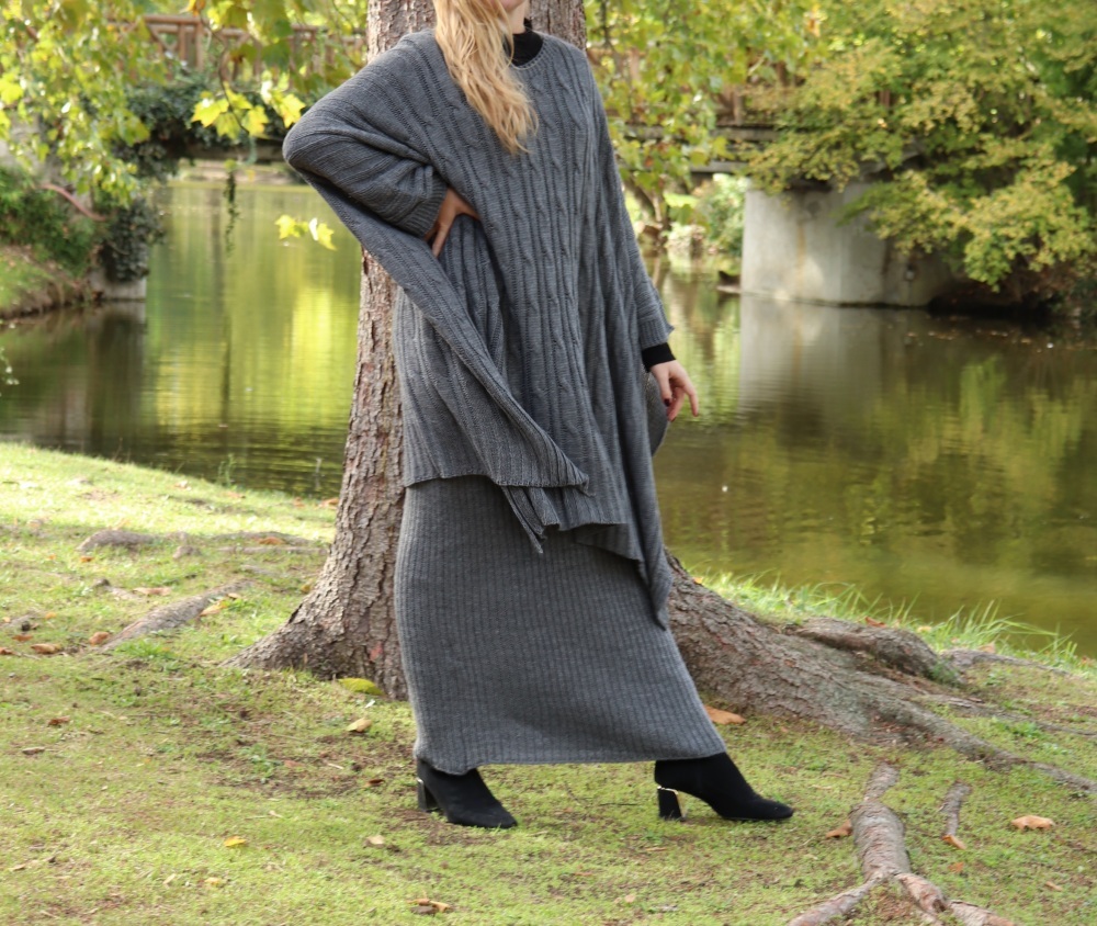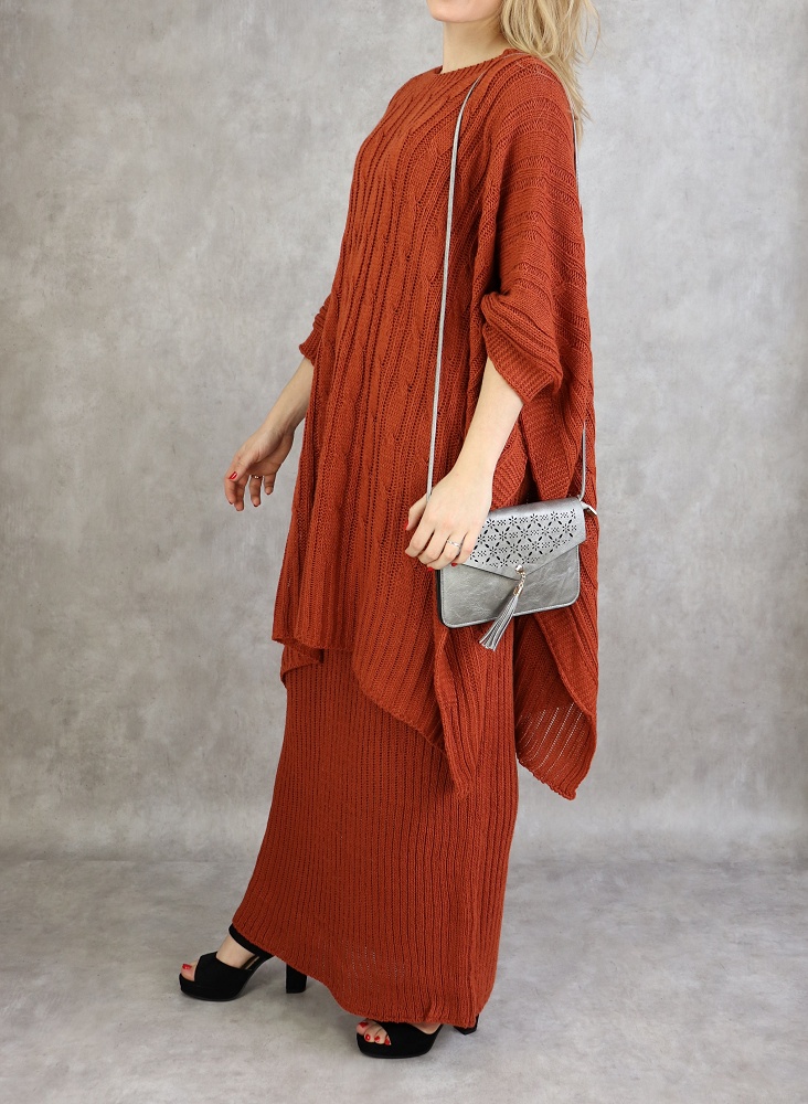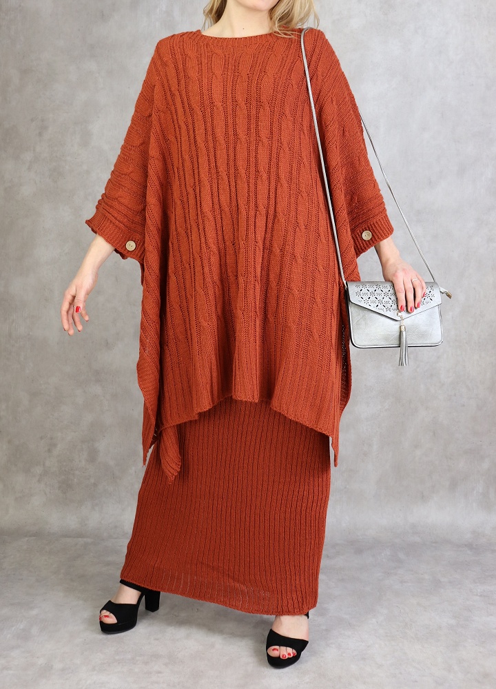 Ensemble robe et poncho grosse maille pour femme - Couleur Rouille Vetement & Accessoire