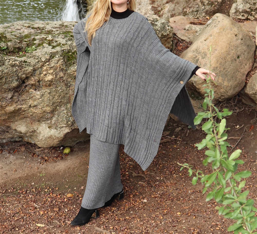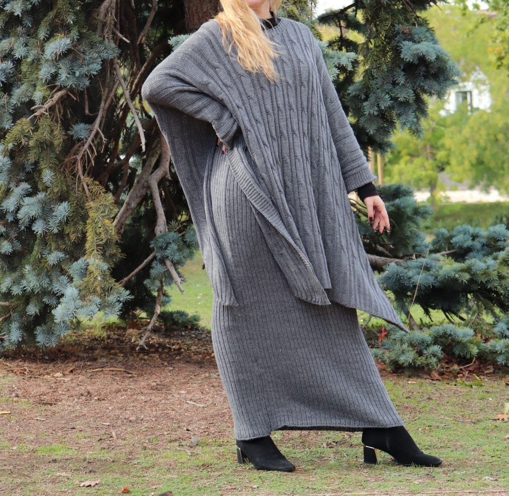 Ensemble robe débardeur, col en V, coupe droite, grosse maille + pull poncho, coupe large, boutons décoratifs au niveau des manches coupées, maille torsadée.