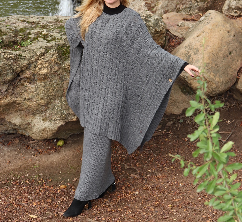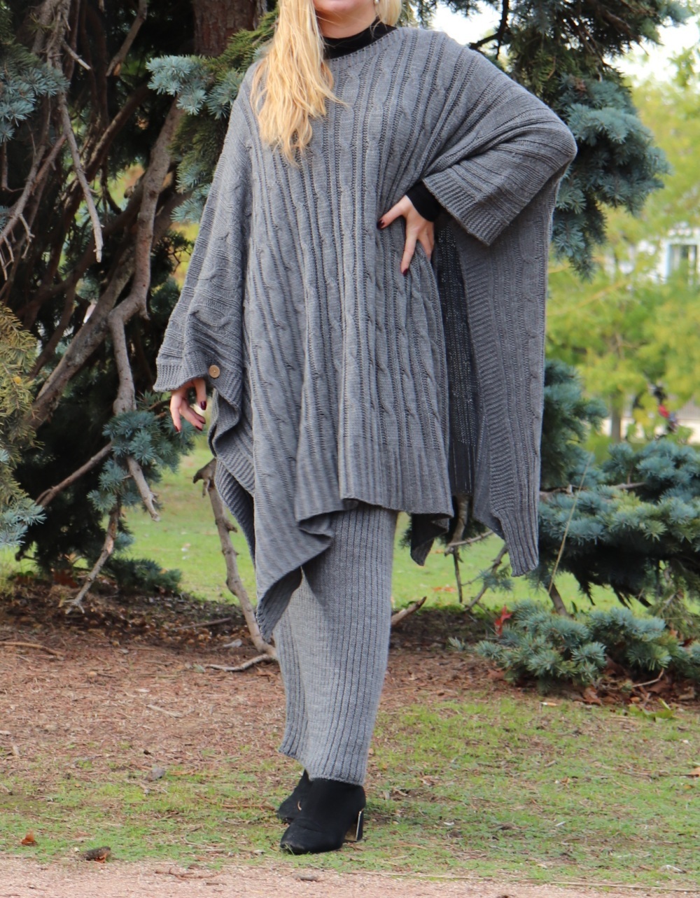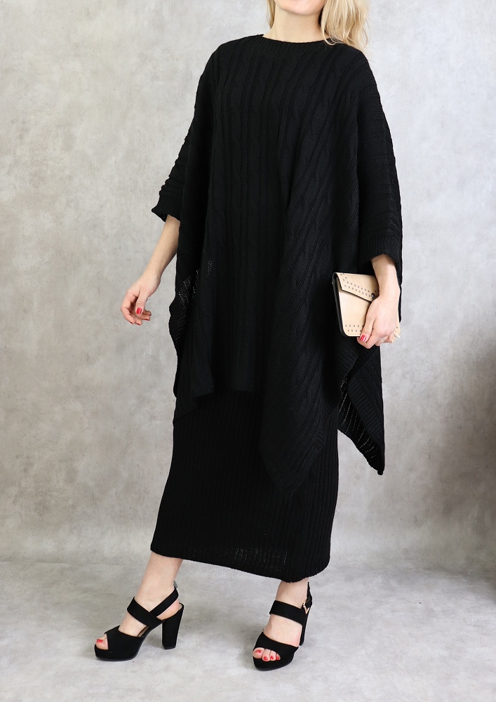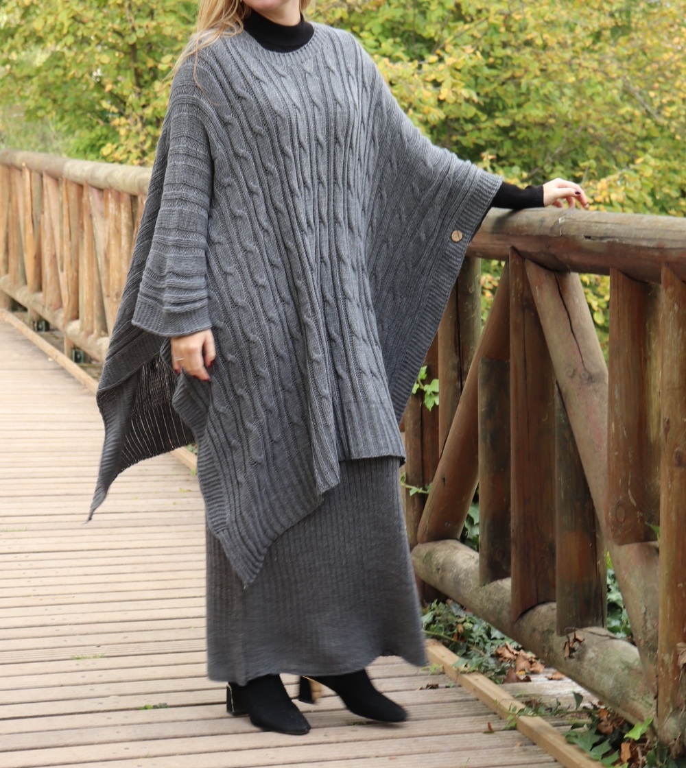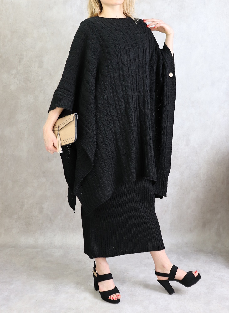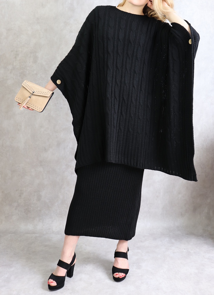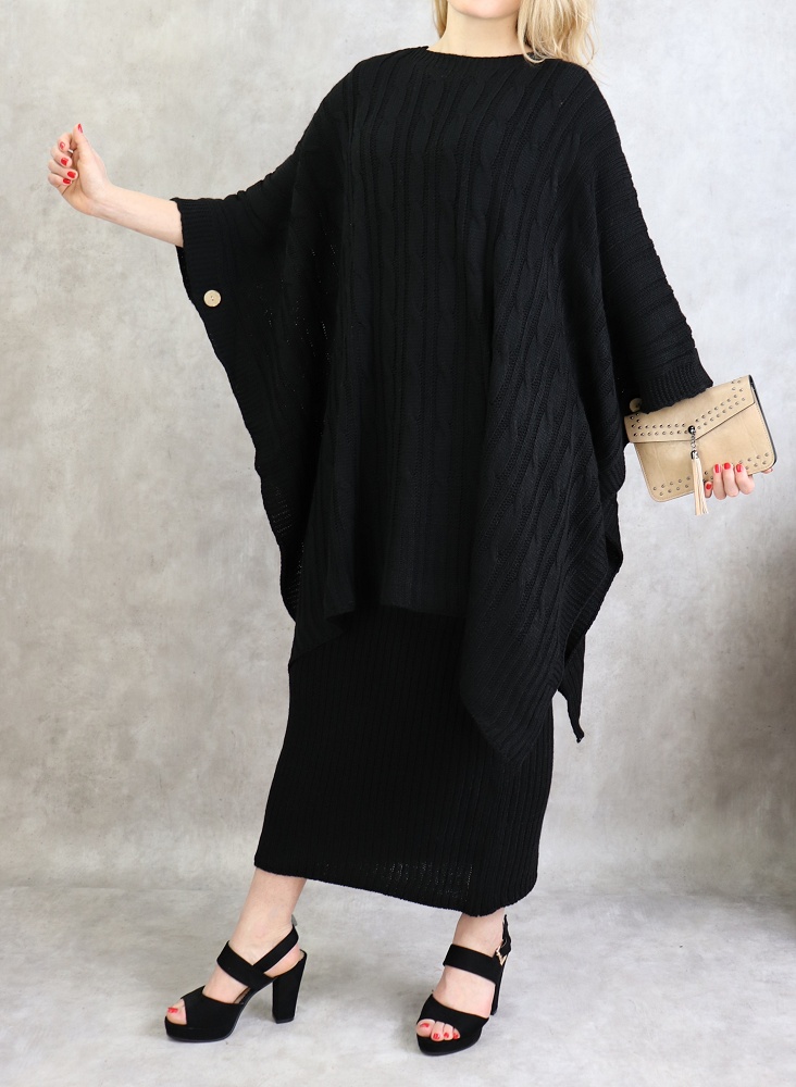 Ensemble robe débardeur, col en V, coupe droite, grosse maille + pull poncho, coupe large, boutons décoratifs au niveau des manches coupées, maille torsadée.