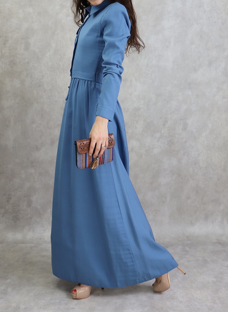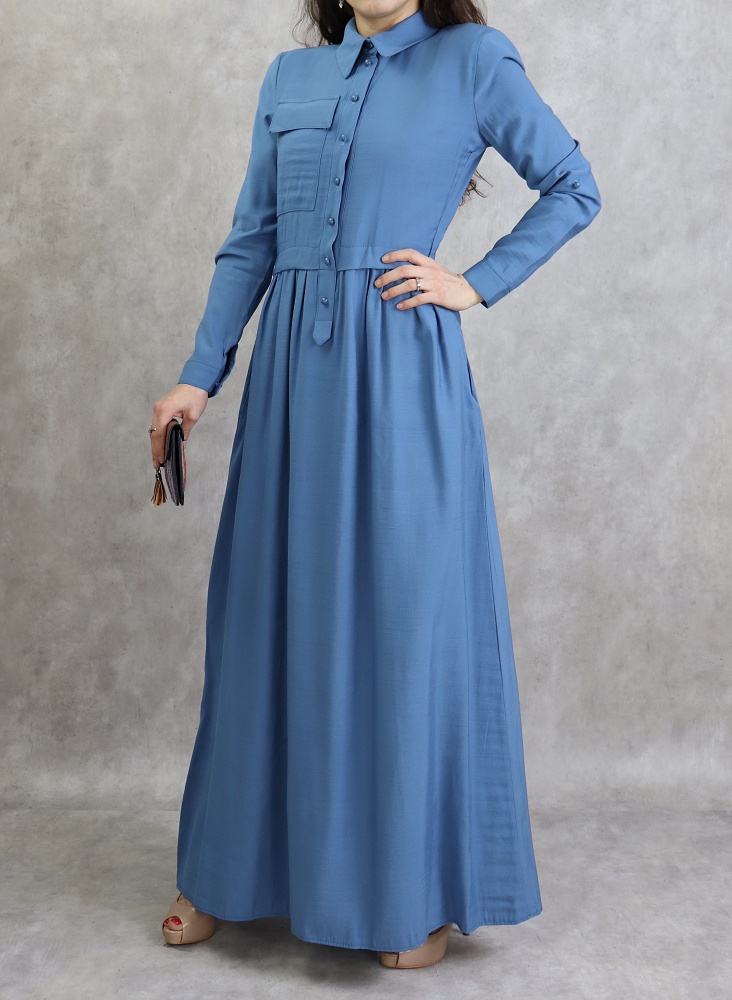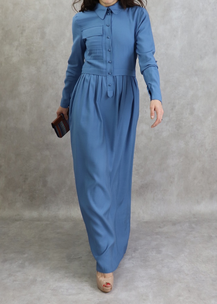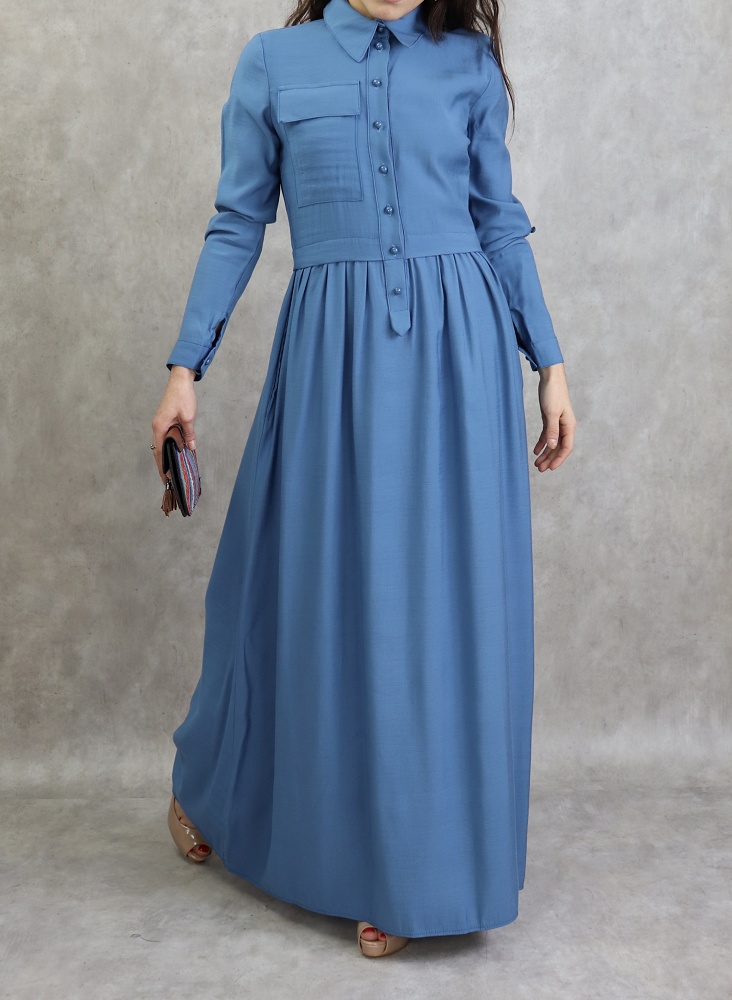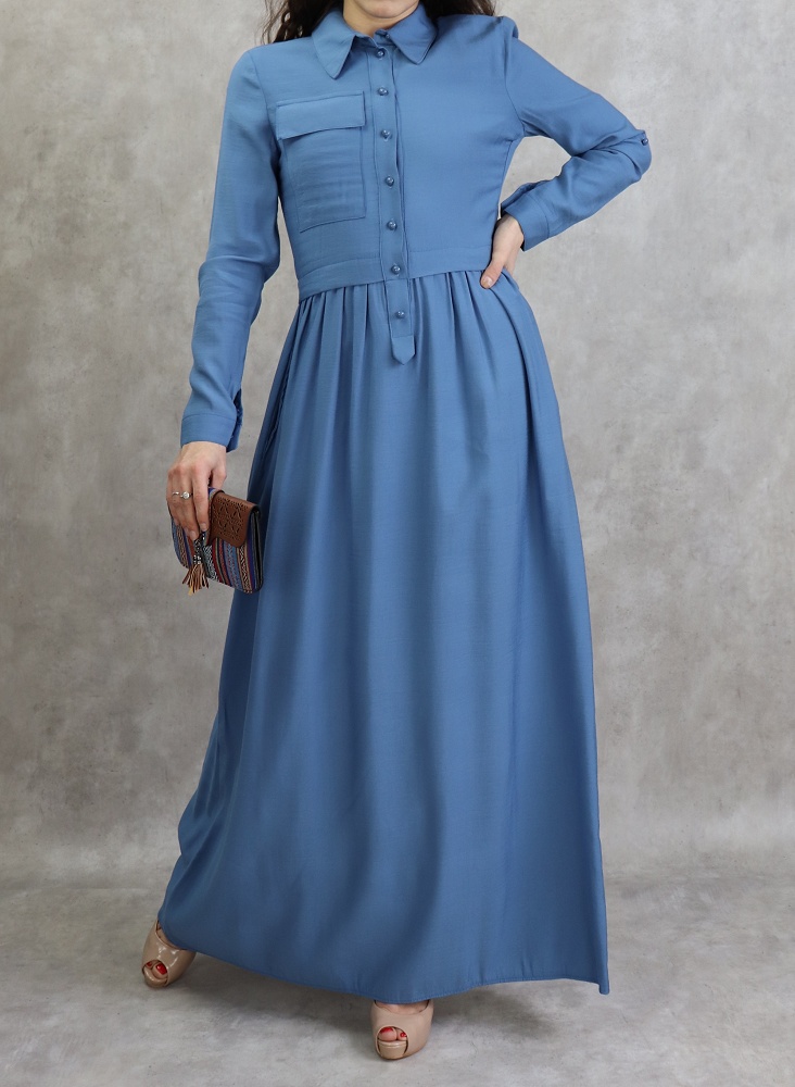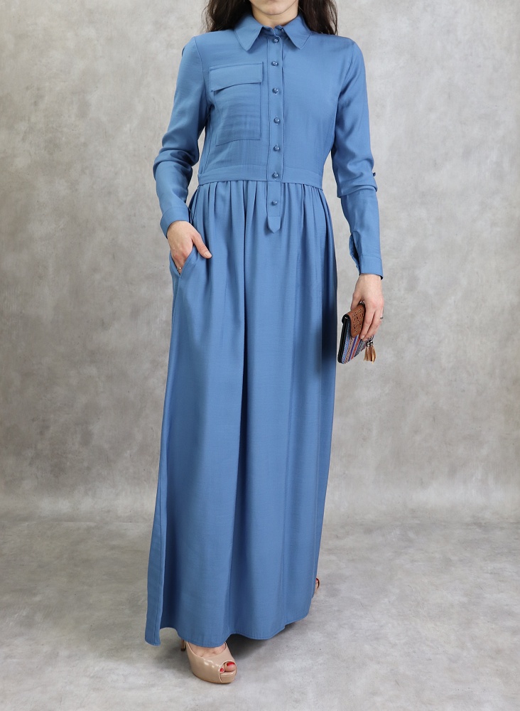 Robe longue, col chemise, fermeture bouton sur le buste, manches retroussables finition bouton aux poignets, avec une poche plaquée et deux poches latérales. Coupe évasée. Tissu très agréable à porter en toutes saisons.