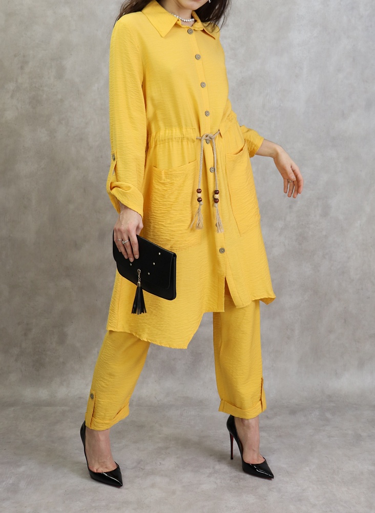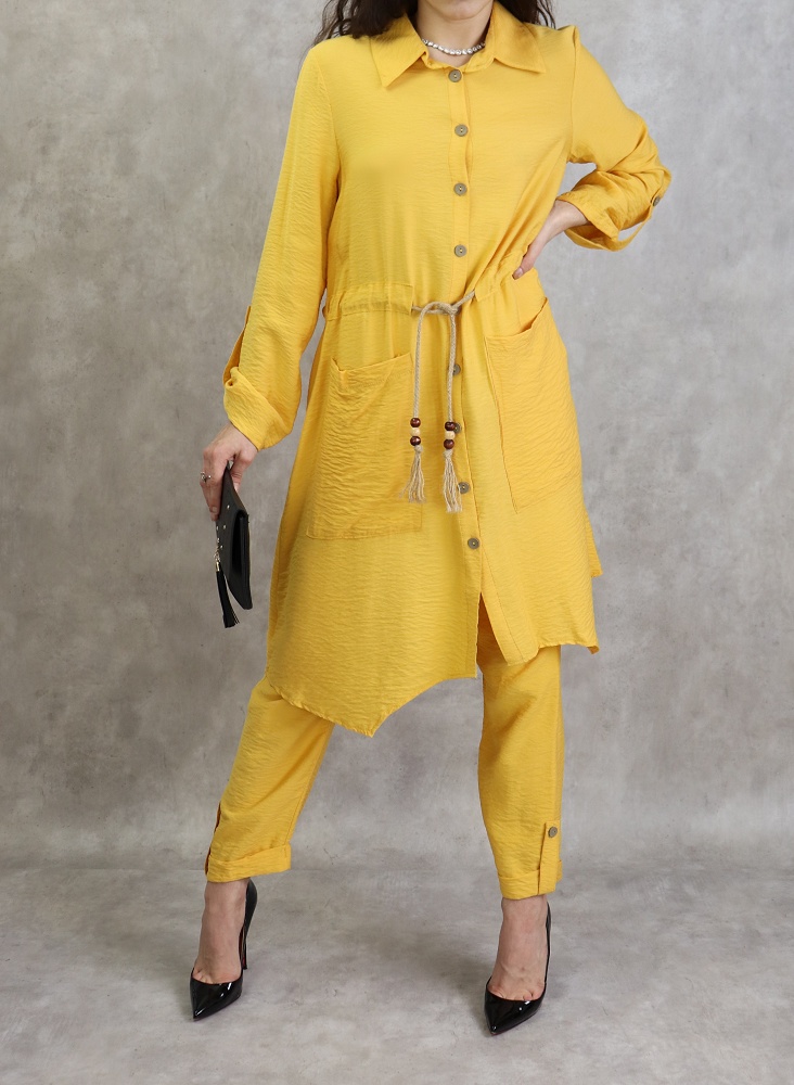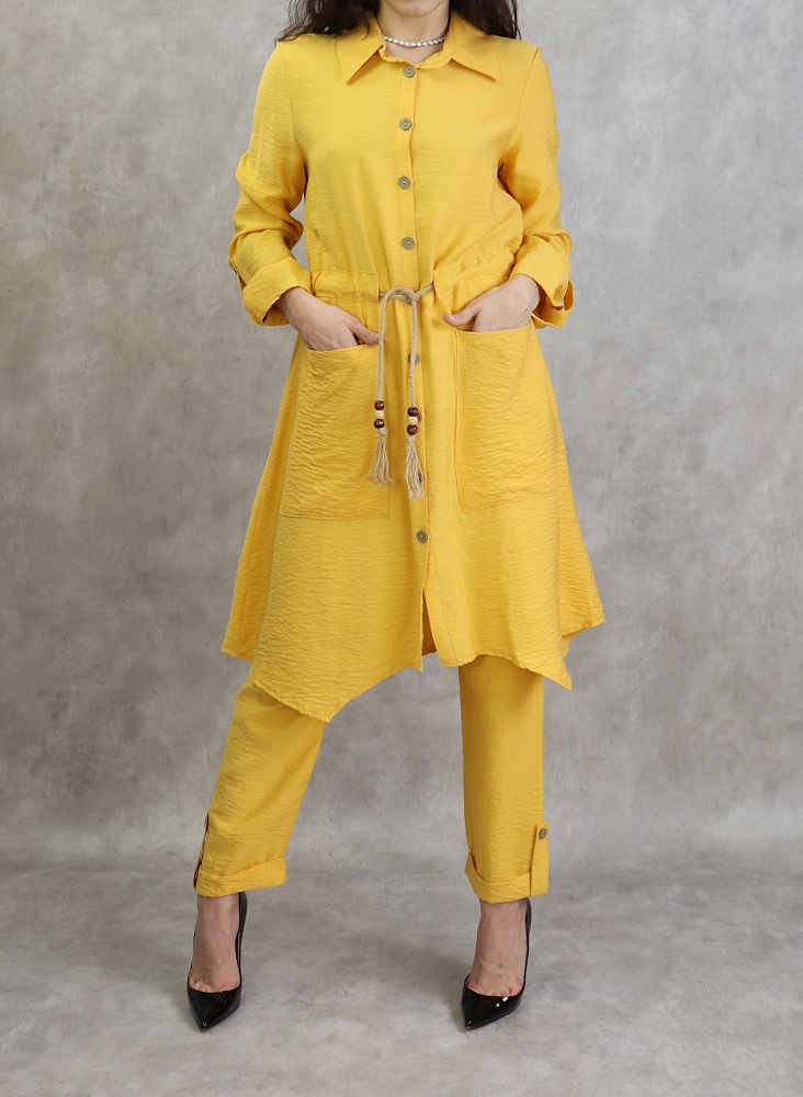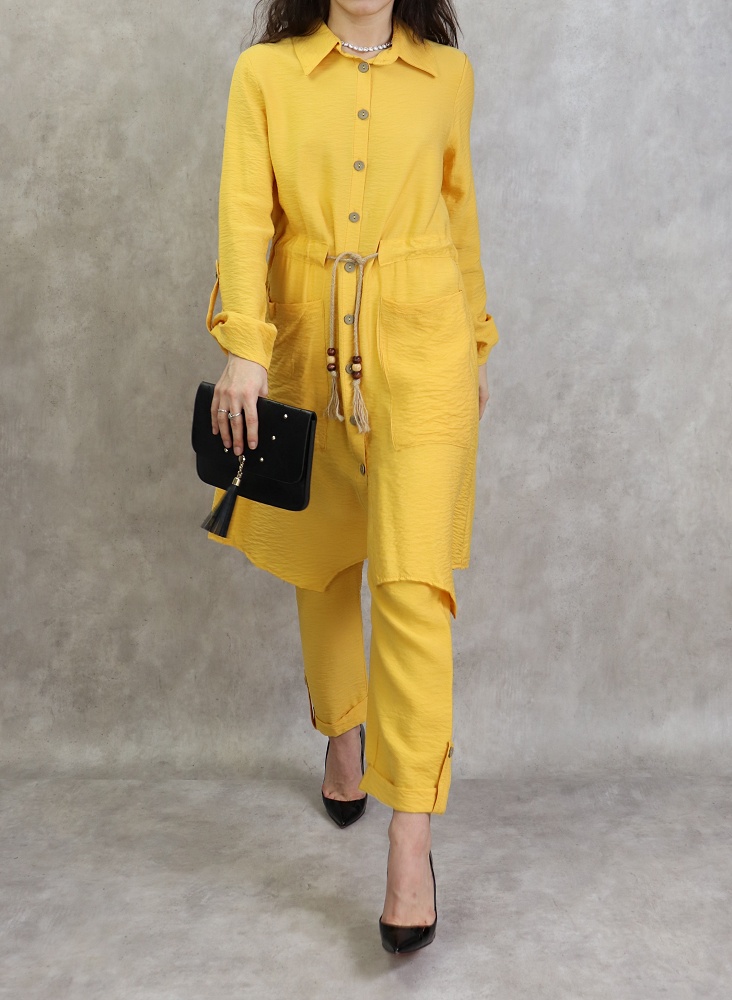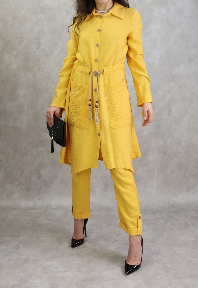 Tunique : mi longue, col chemise, manches ajustables, lien de serrage à la taille, grandes poches.
